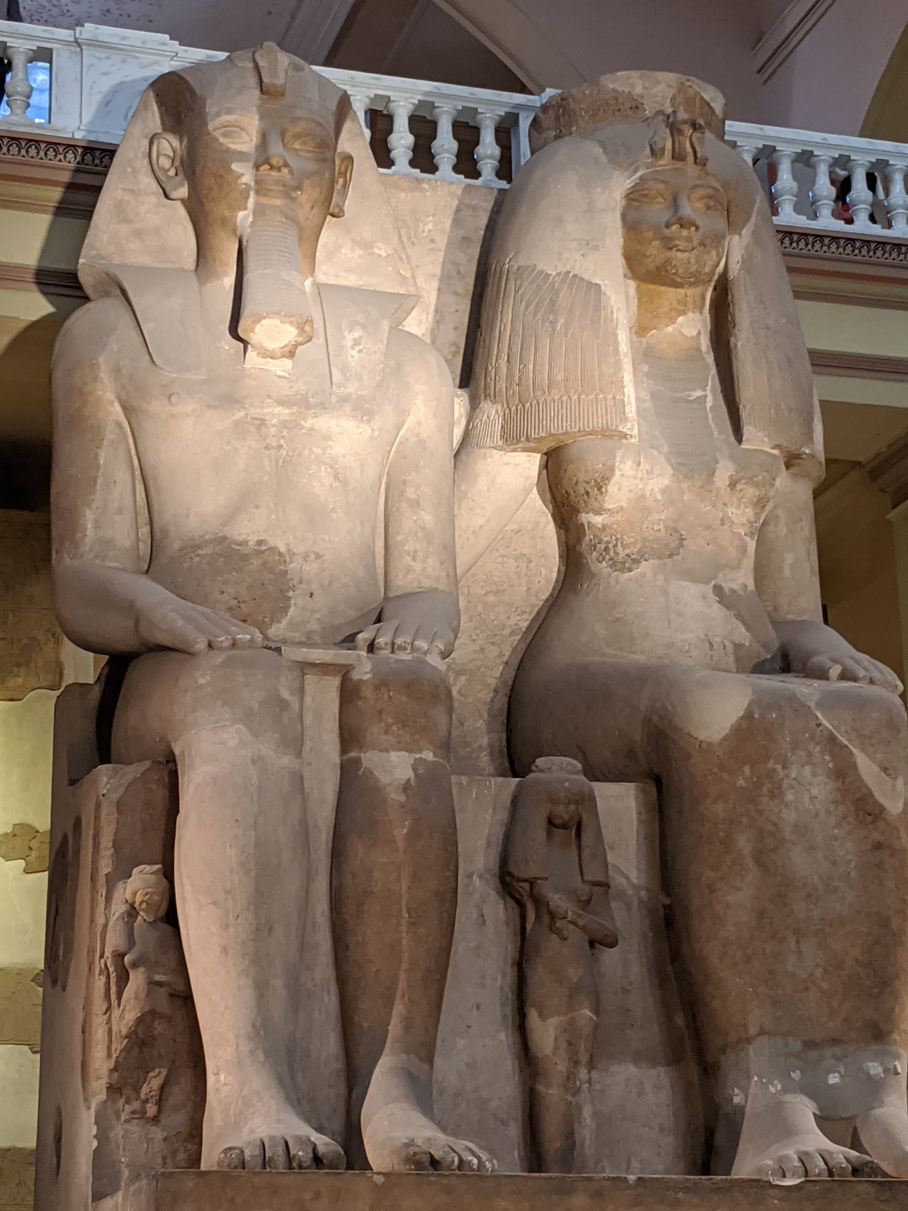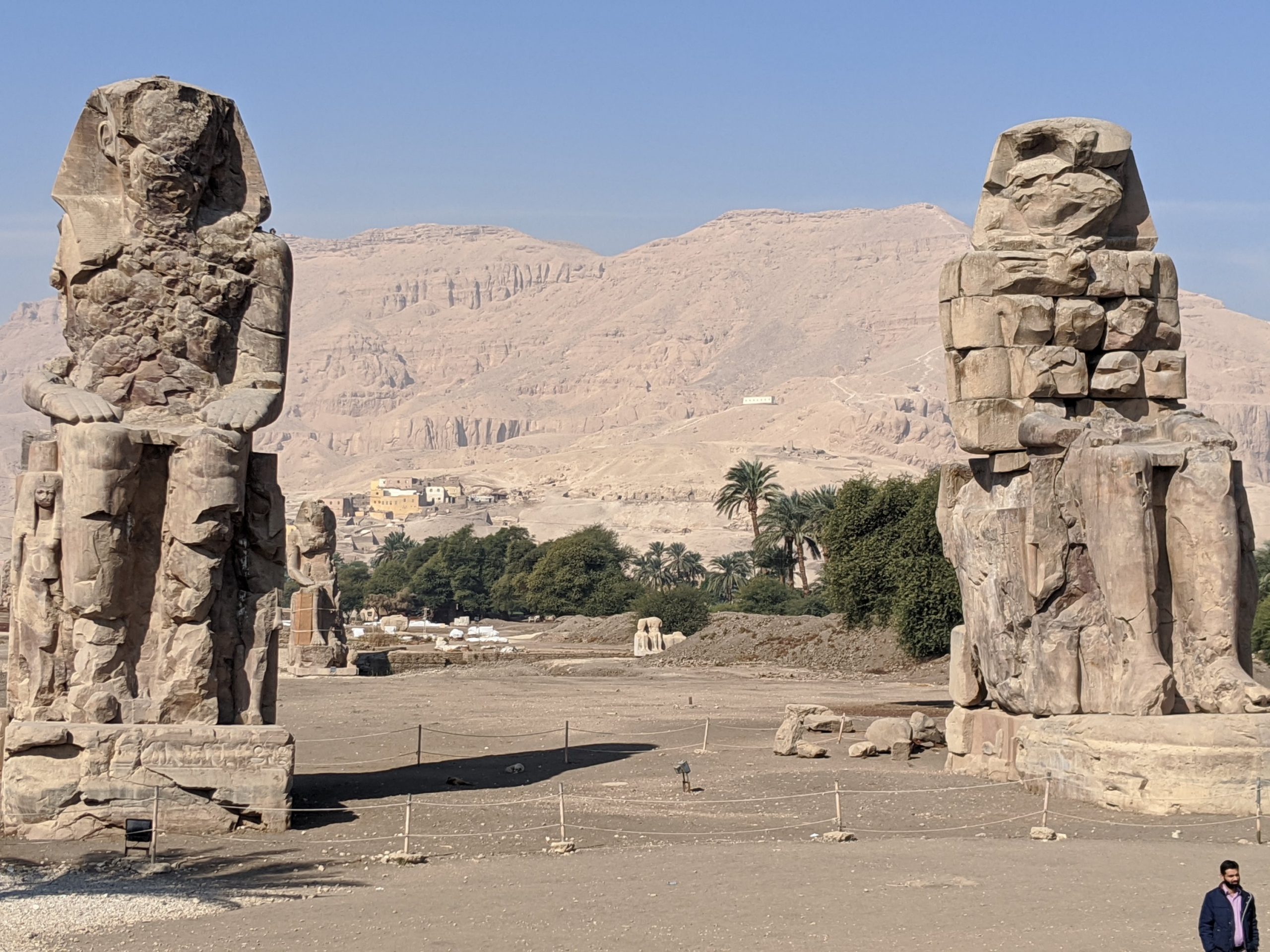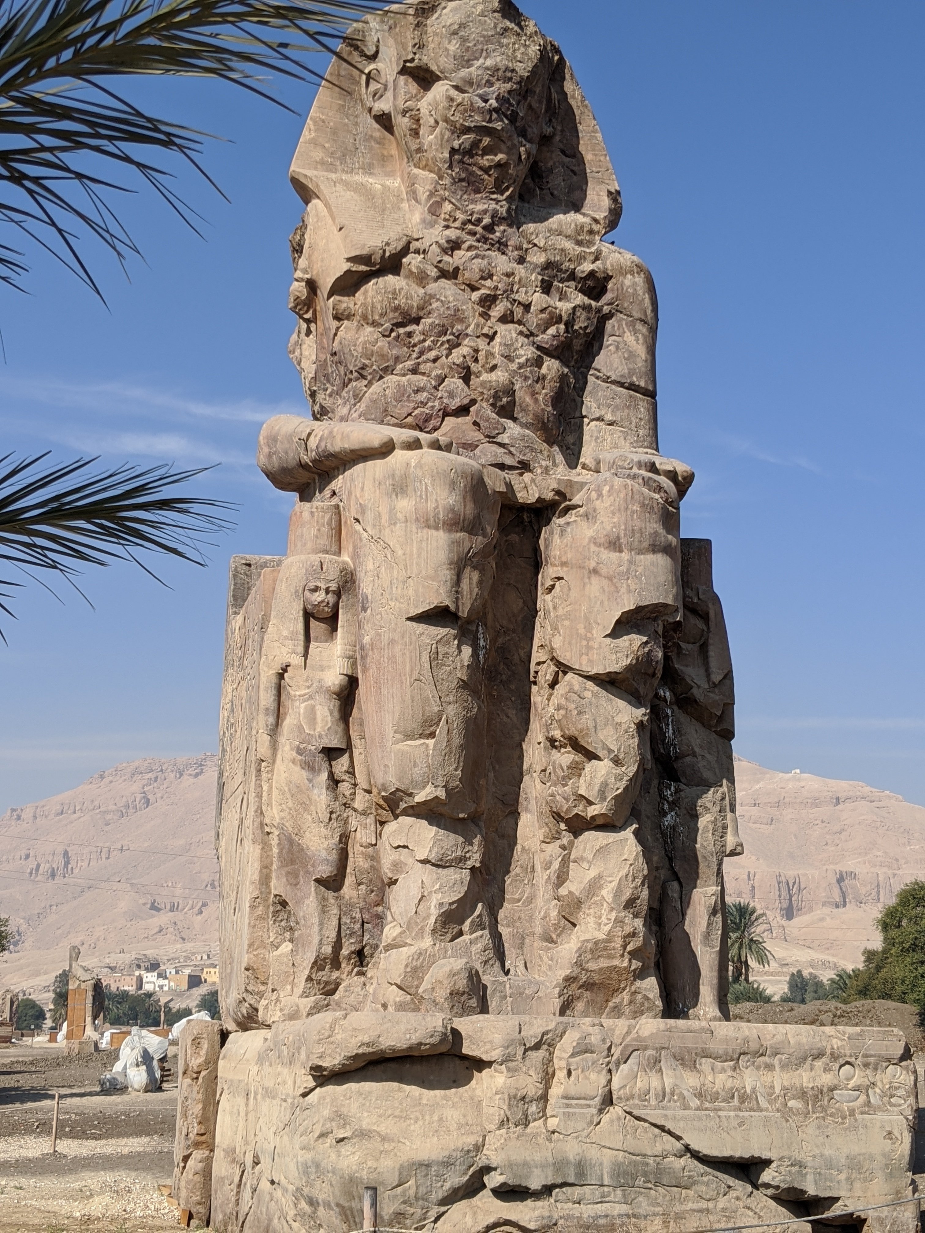 The Colossi of Memnon are two massive faceless stone statues of the Pharaoh Amenhotep III from 1350 BCE, in the Theban Necropolis in Luxor. Memnon was slain by Achilles during the Trojan war. They are cut from a single block of stone. The statues sit at the funerary entrance of the temple and that part is currently being excavated. The ground level was as high as these statues when they were discovered.