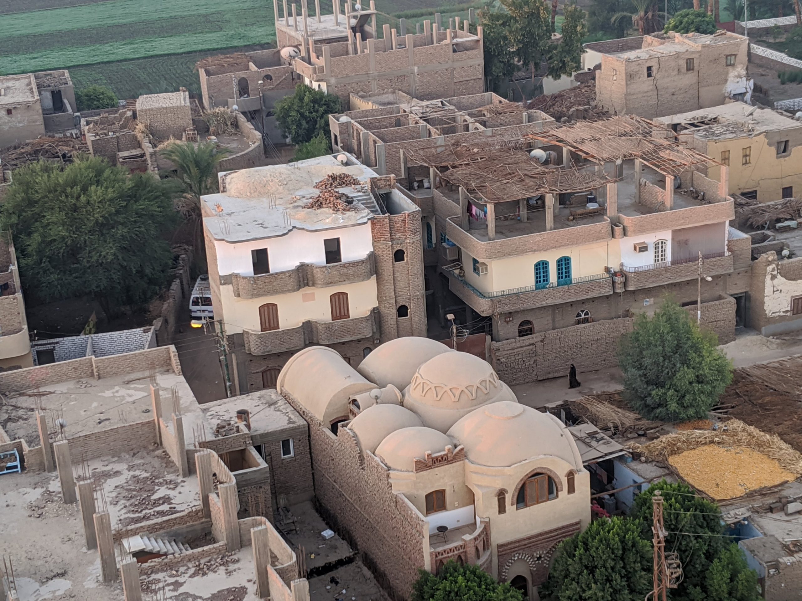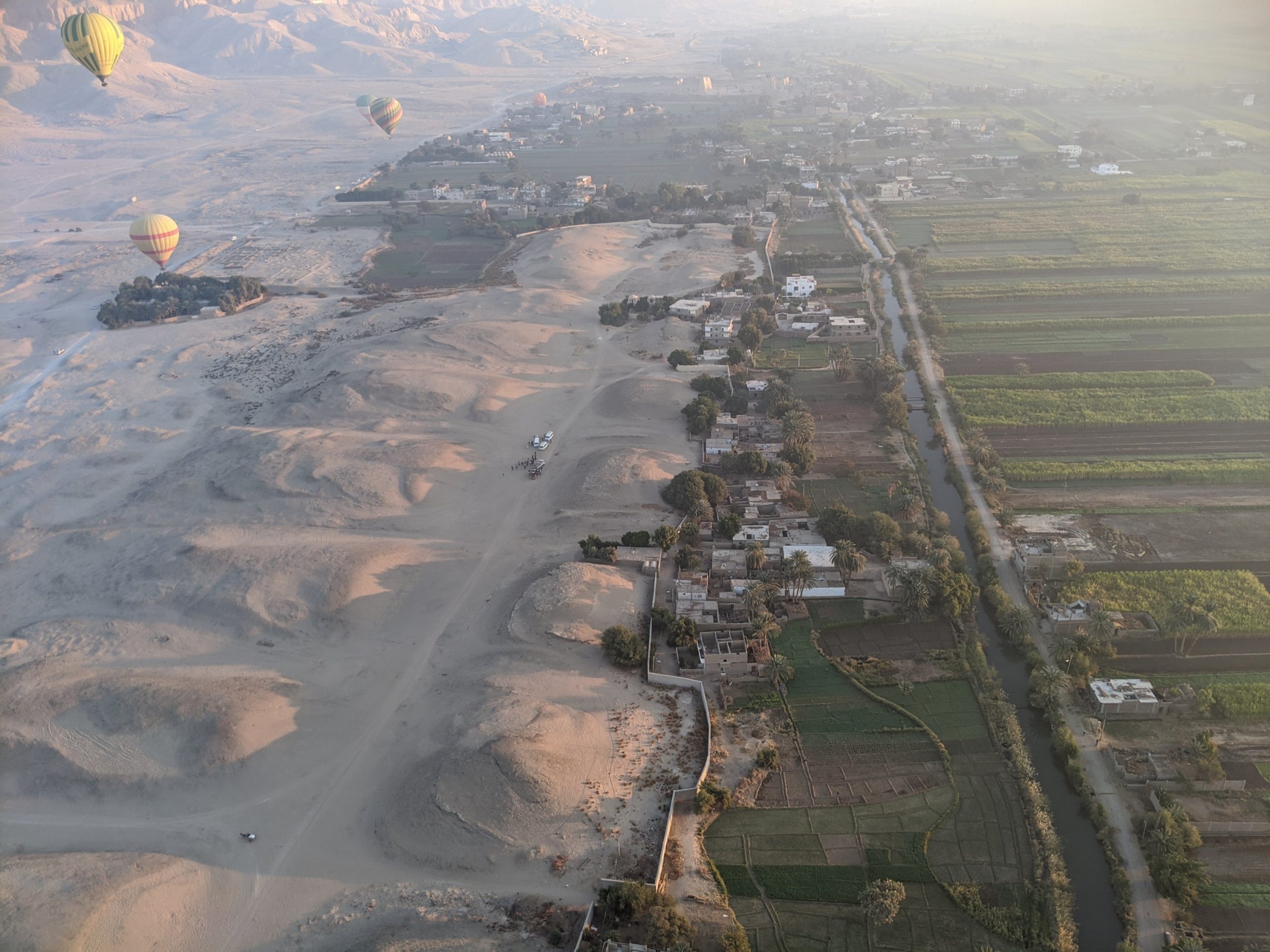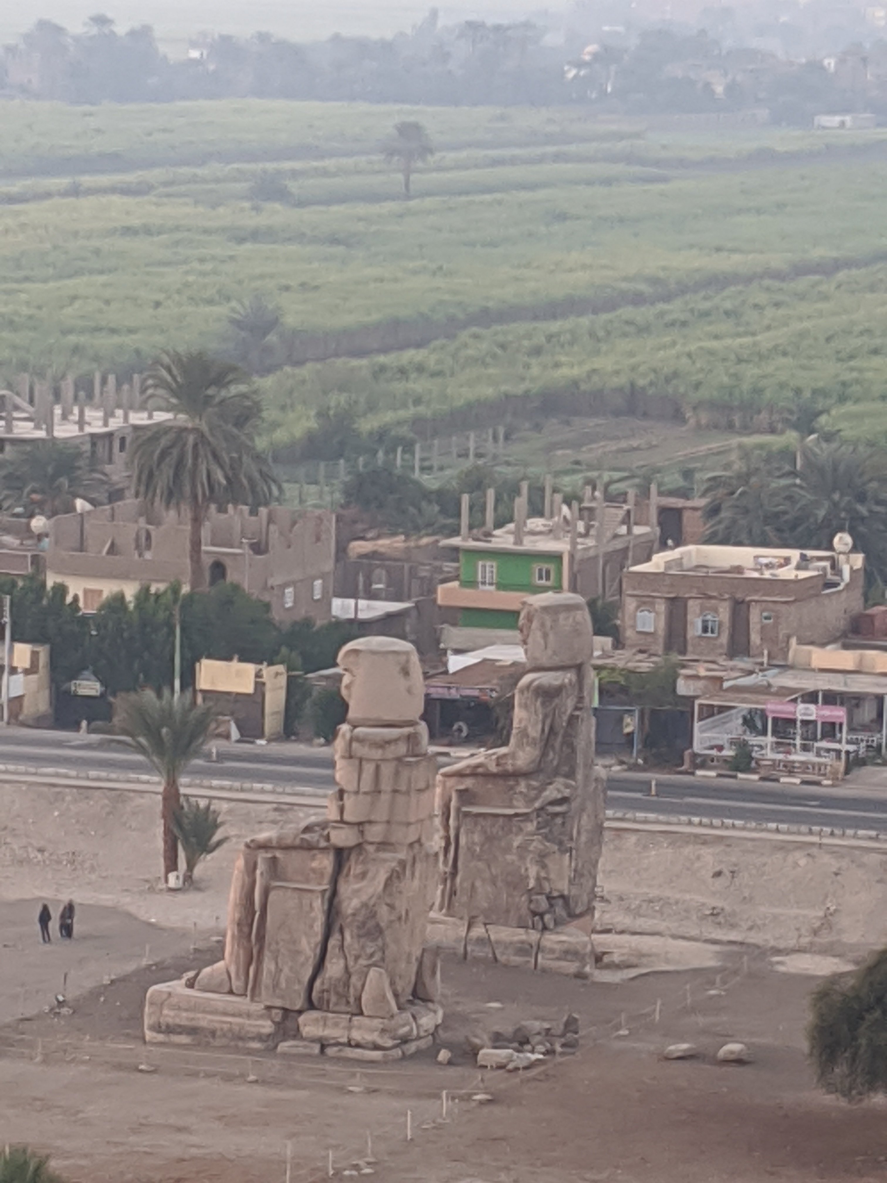 Views during sunrise. Vote of the colossi from above.You can see the irrigation channels that keep the area green. It is not an Oasis but fed from the NileSugar cane is a major crop which requires a lot of sunlight and water.