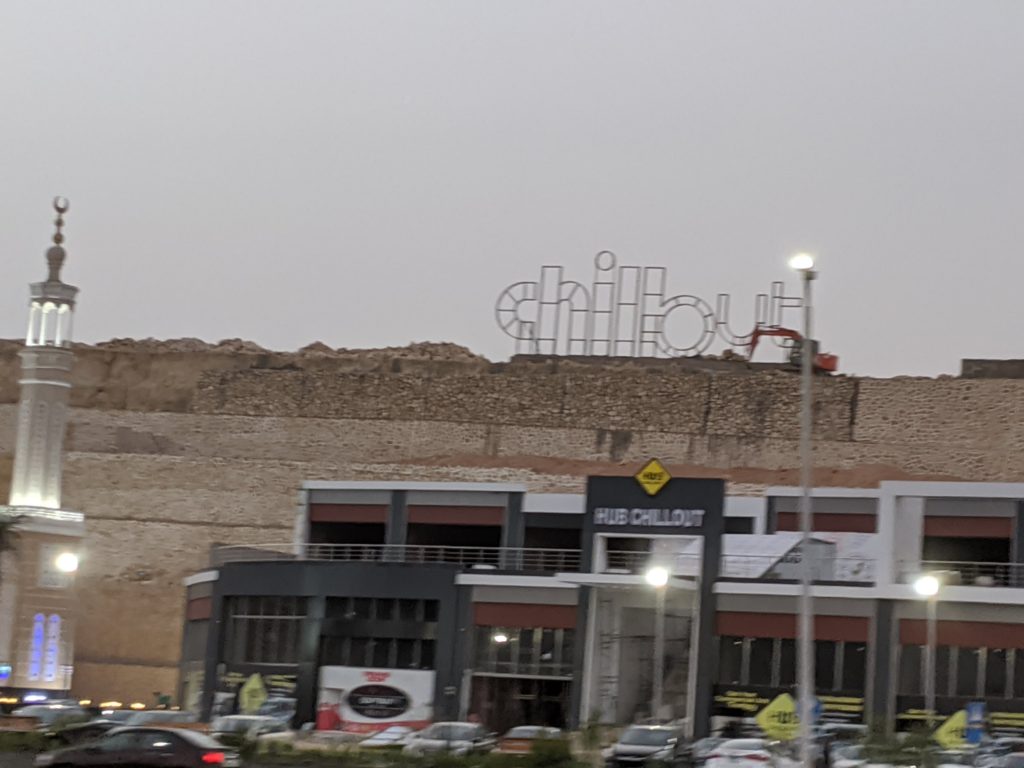 For dinner we went to a great seafood restaurant called Ibn Hamido in New Cairo. It was fabulous and very famous. On the way I found other decorations as well as a mosque with a service station next to it. The sign in the hill says chill out!