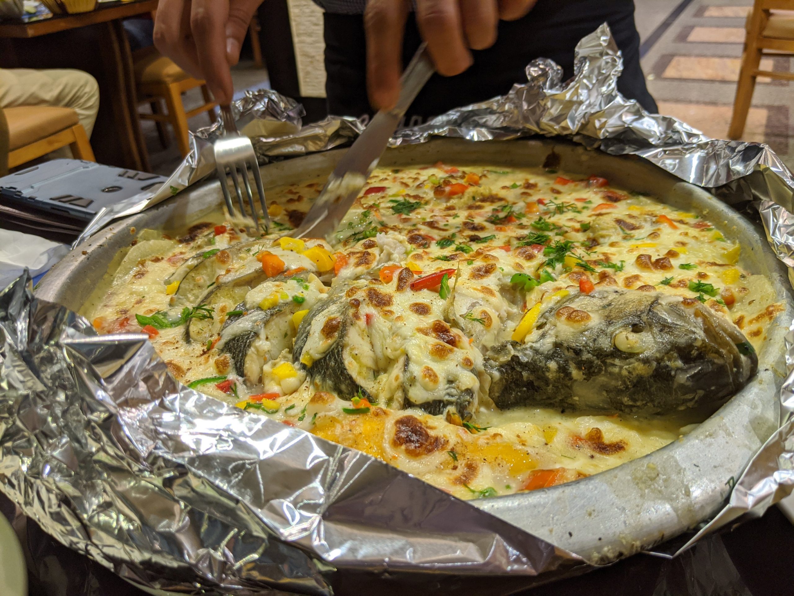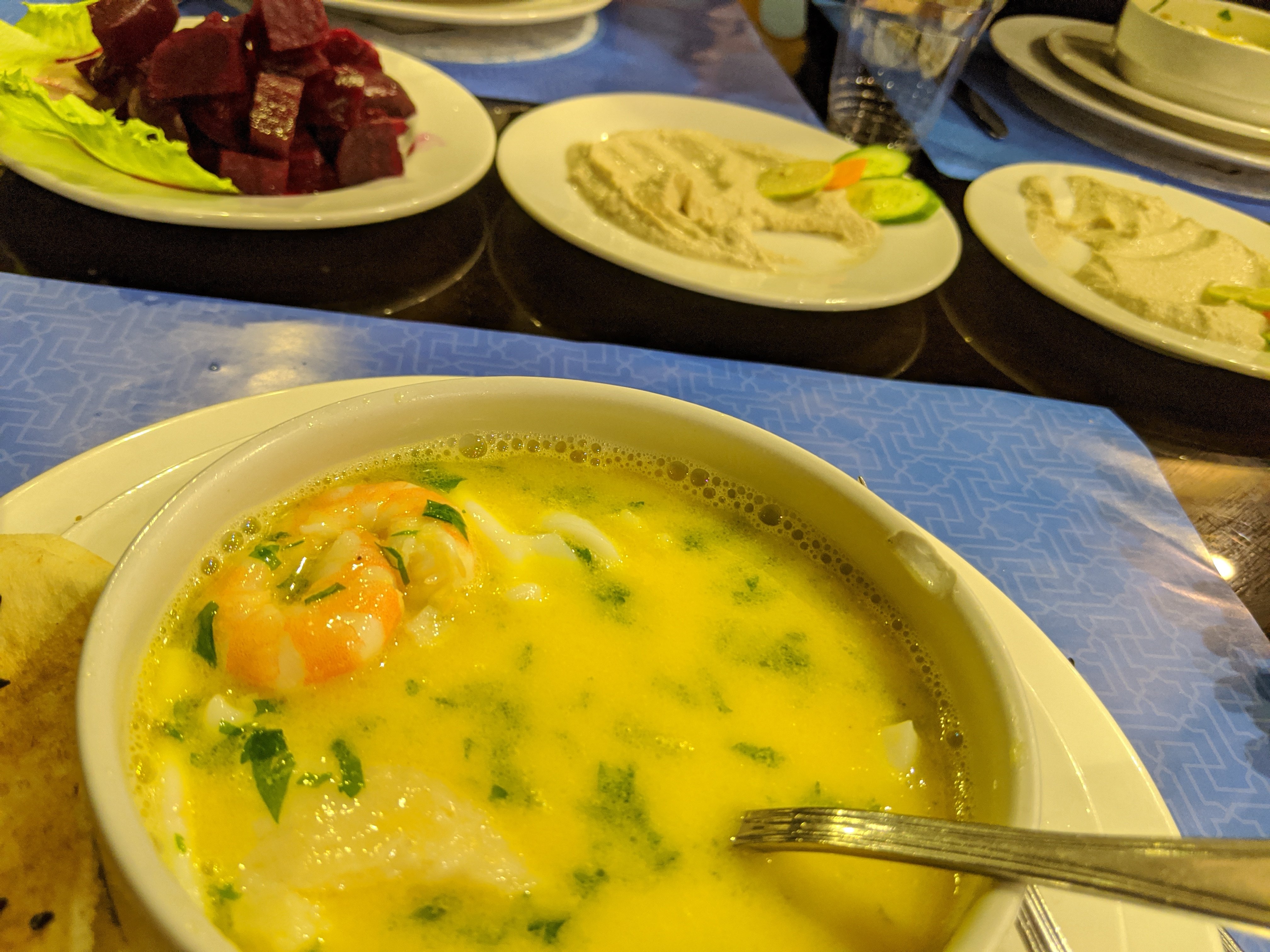 The seafood bisque was buttery but not too rich. We also had Sea Bass on a bed of gratin potatoes. The shrimp, fish, and tahini were delicious.