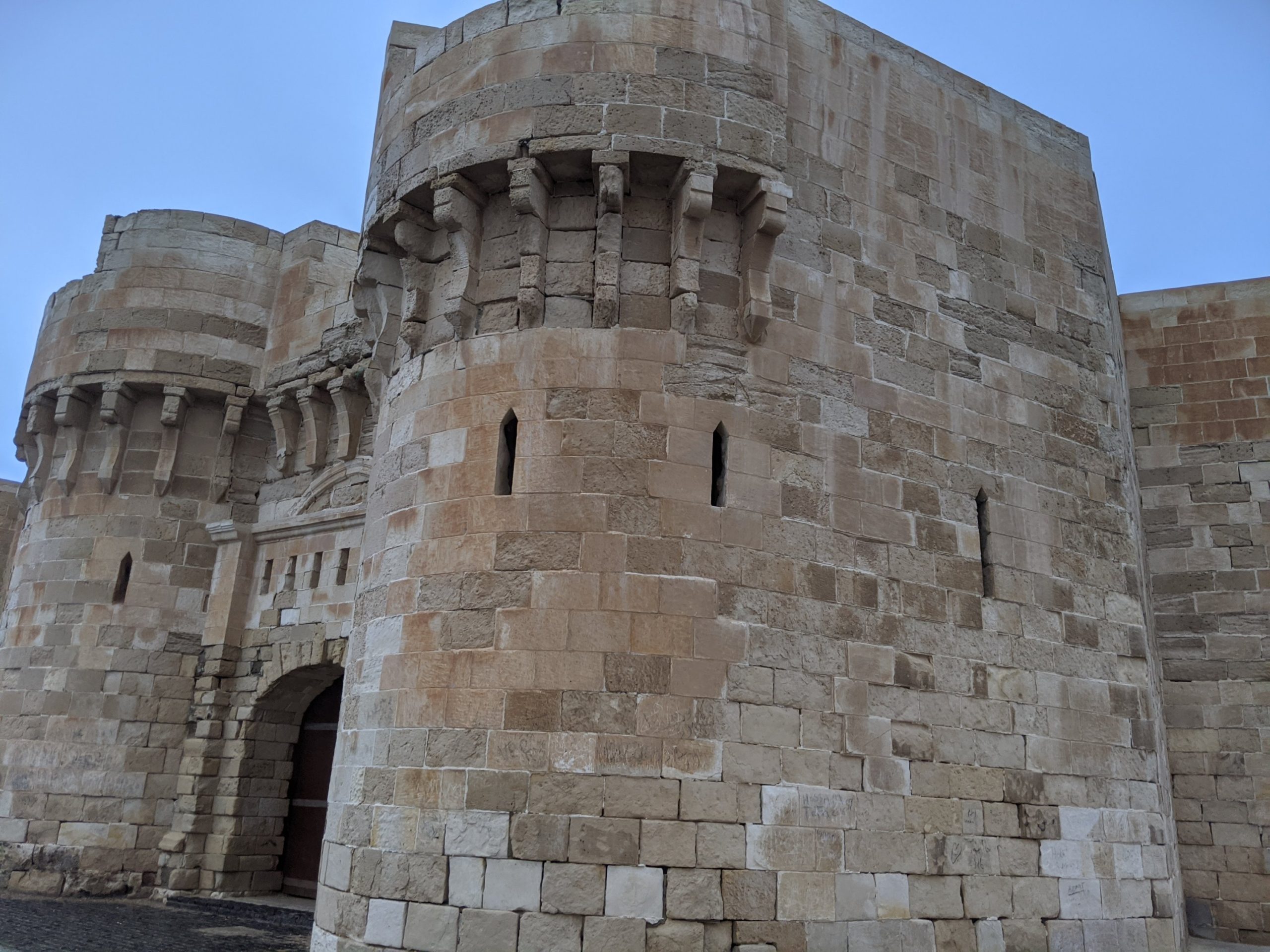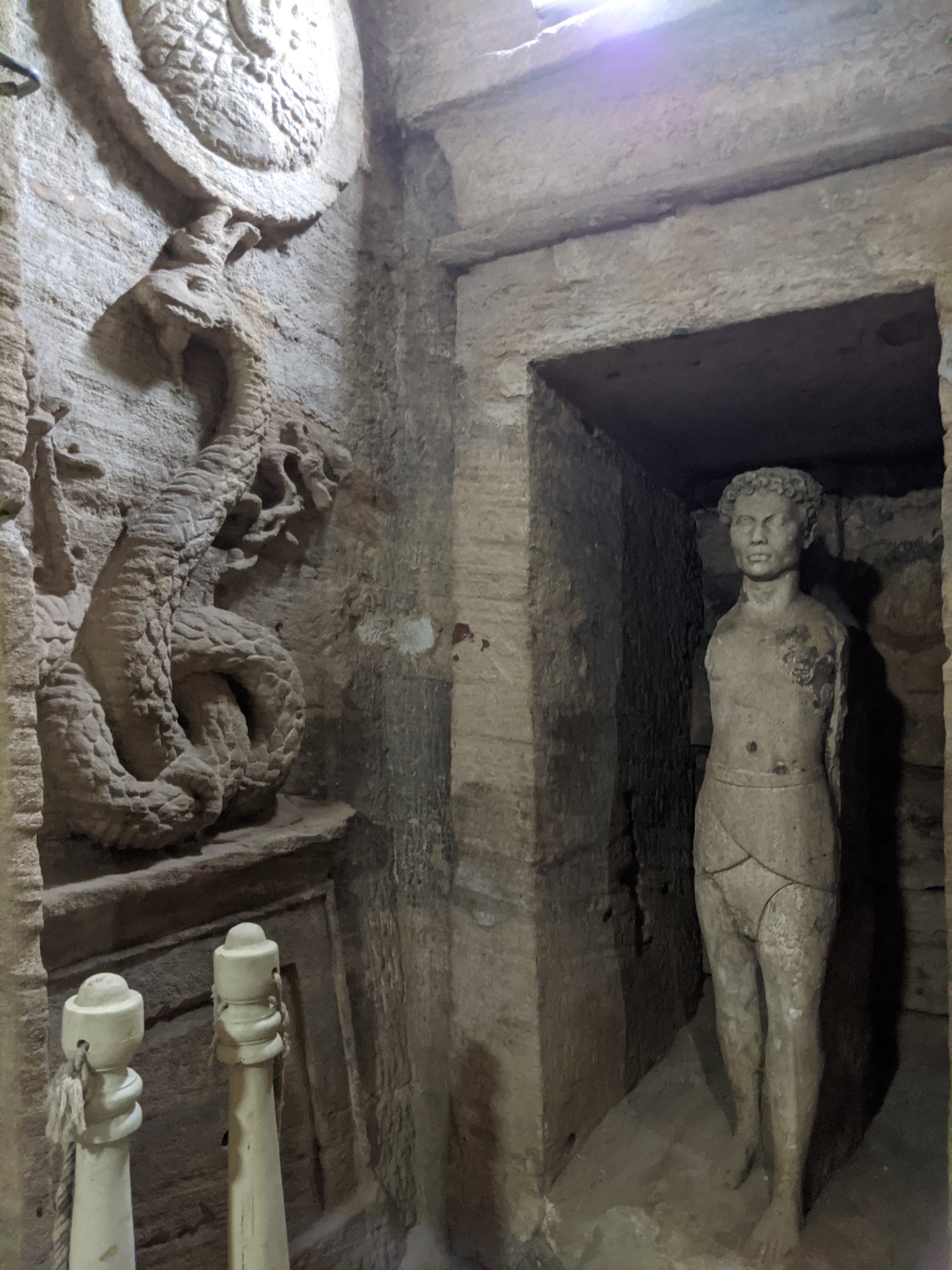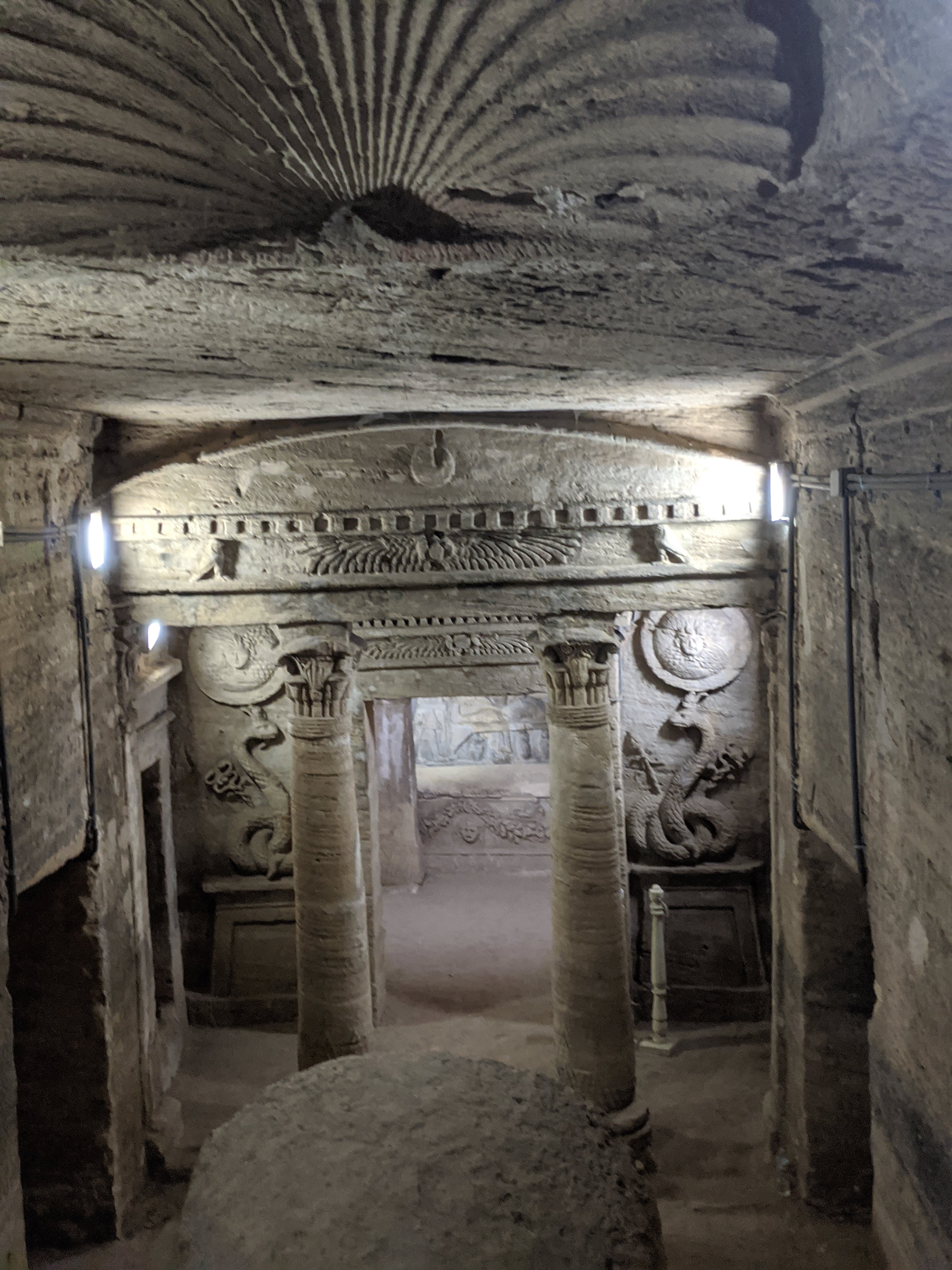 We started at the Catecombs of Kom El Shuqafa. You can see Roman, Greek and Egyptian culture as some statues are Egyptian in style with Roman clothes and hair. The circular staircase was used to transport deceased bodies down the middle and leads down into the tombs. They were constructed in 200 AD. It was discovered in 1900 when a donkey accidentally fell into the access shaft.