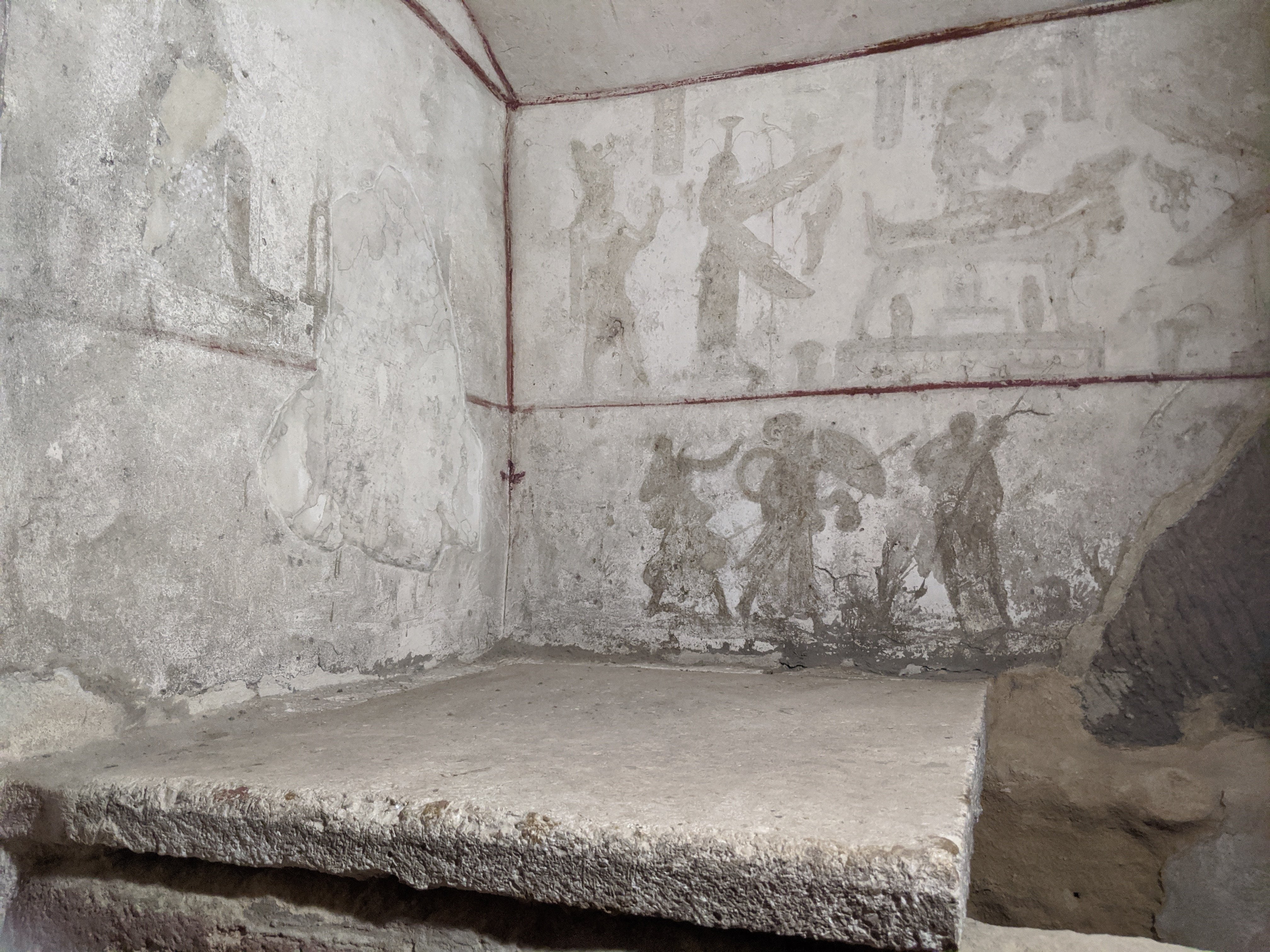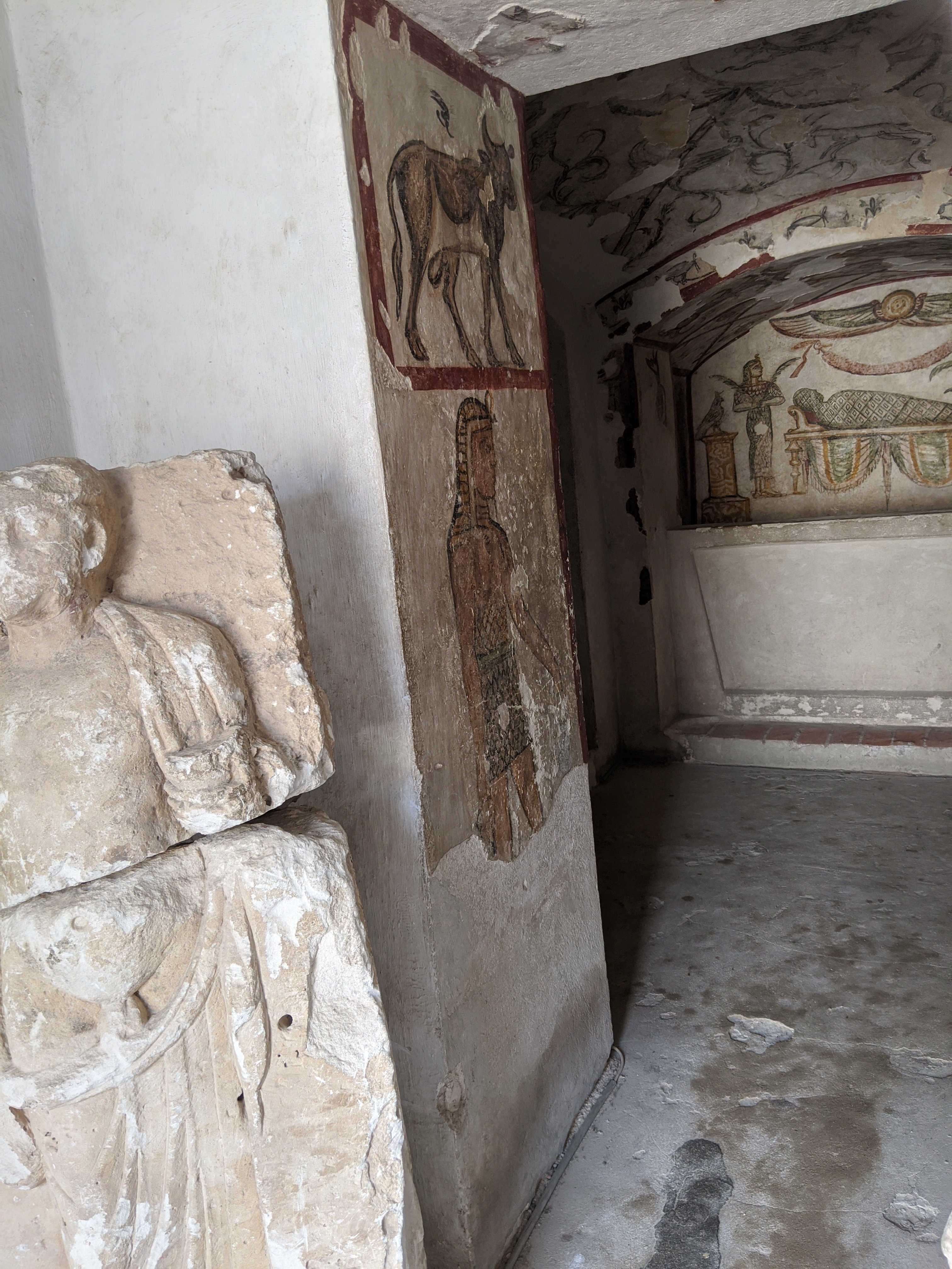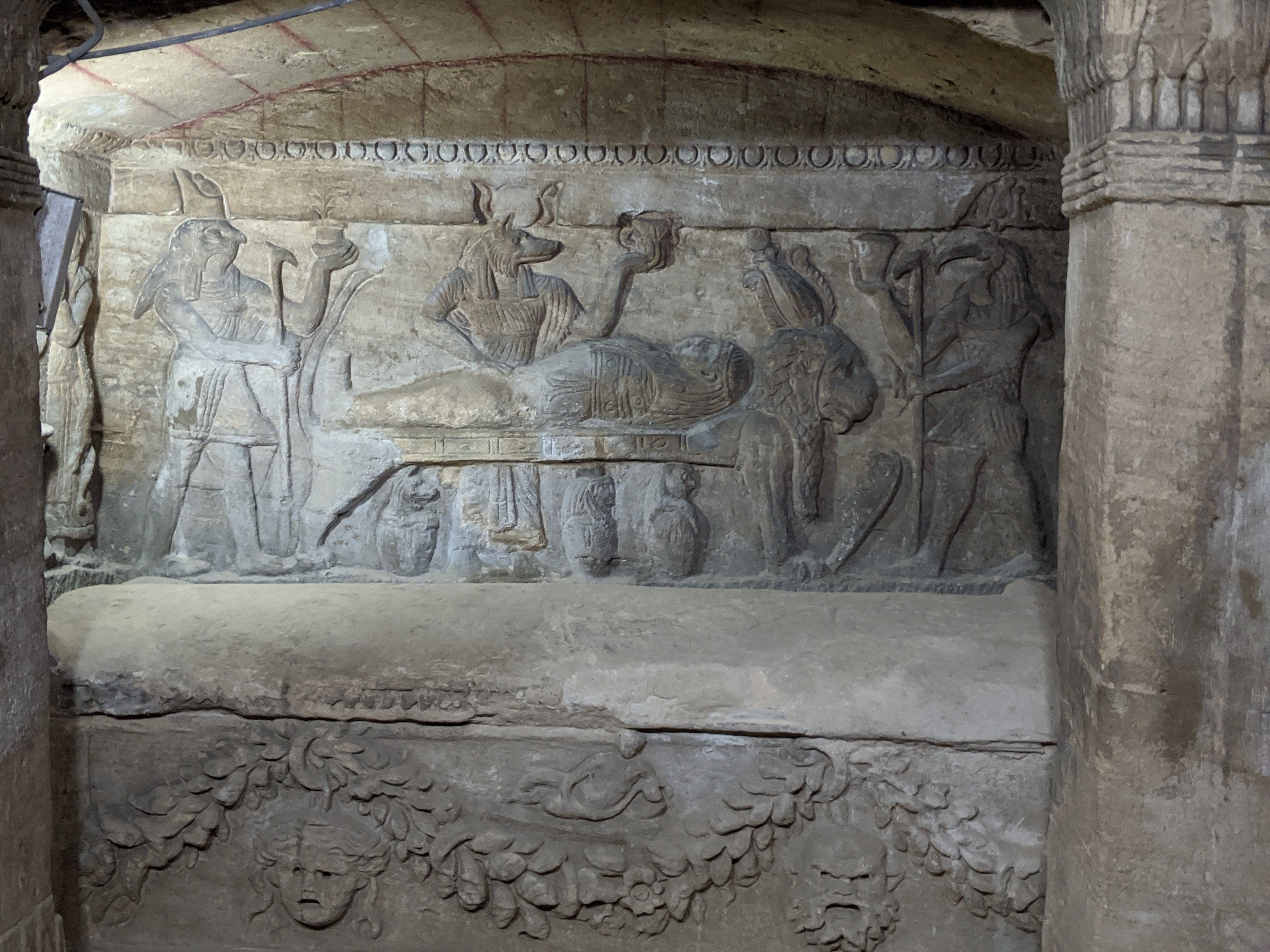 Outside the burial chamber.Inside the vault are carvings that served as protectors of the dead.Tombs. Originally this was designed for a single family but it was said that horse remains were also found here.This is a wardian tomb.Inside a Tigran tomb. There is a front room, back room, and open court that is found inside the tomb. This was unearthed elsewhere in Alexandria and reconstructed here.Stone with carvings of the burial process.