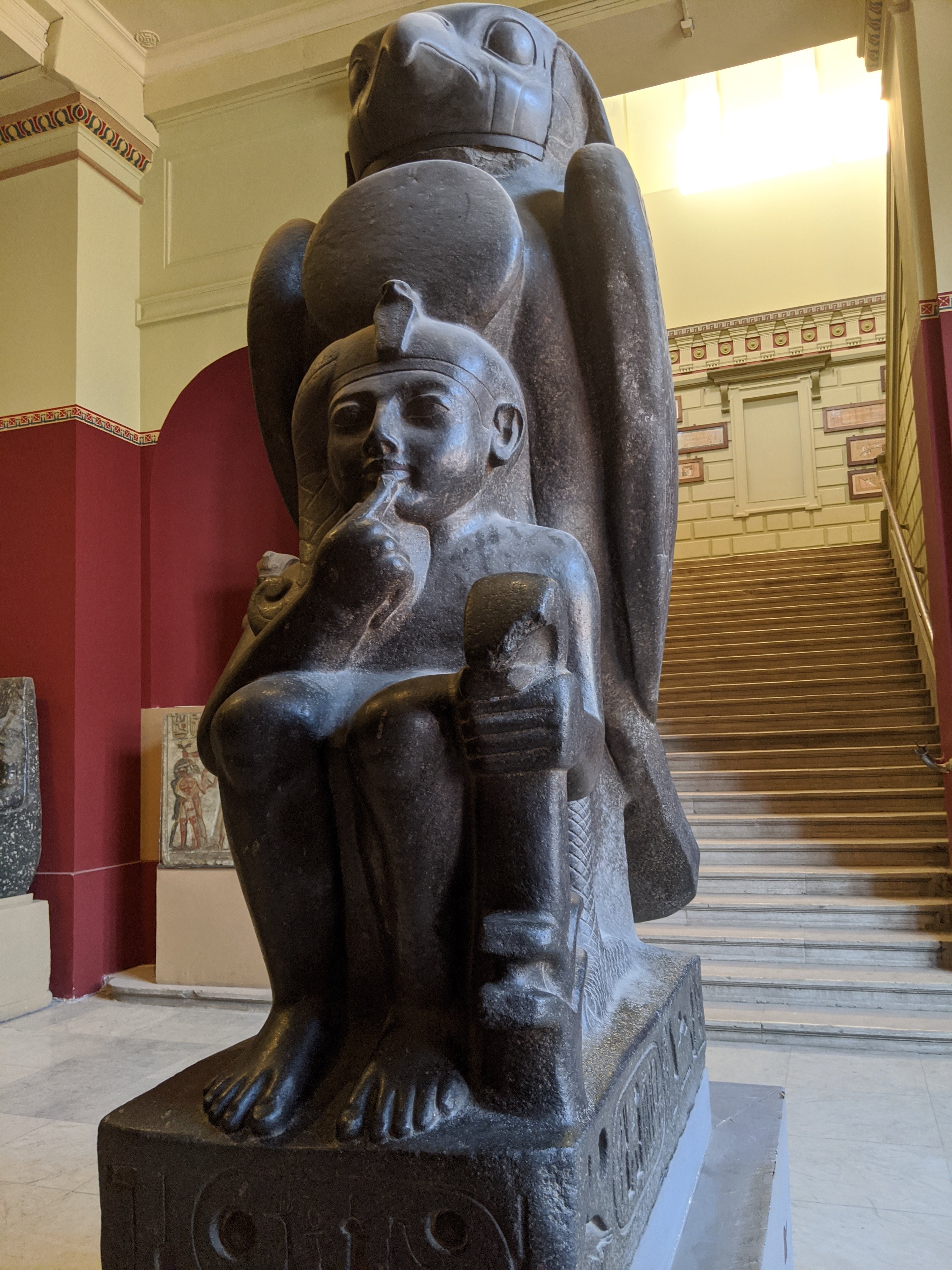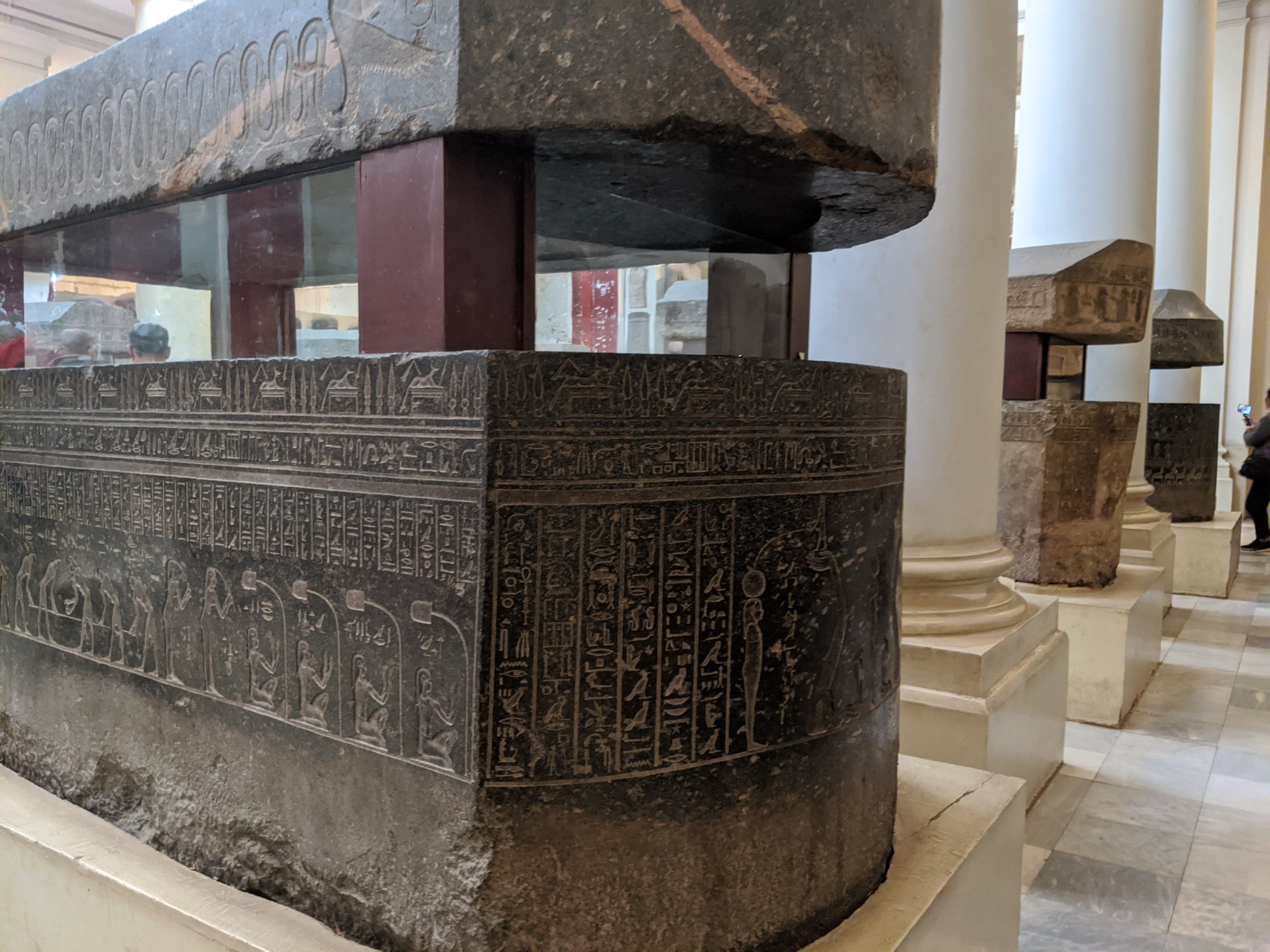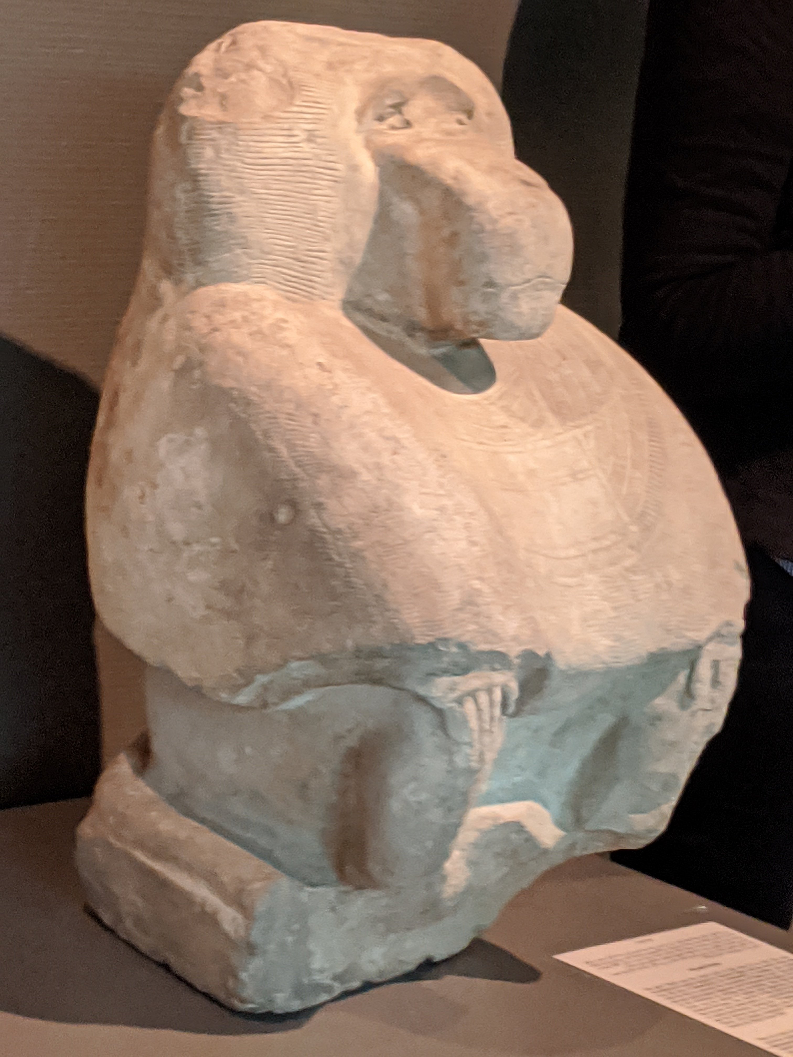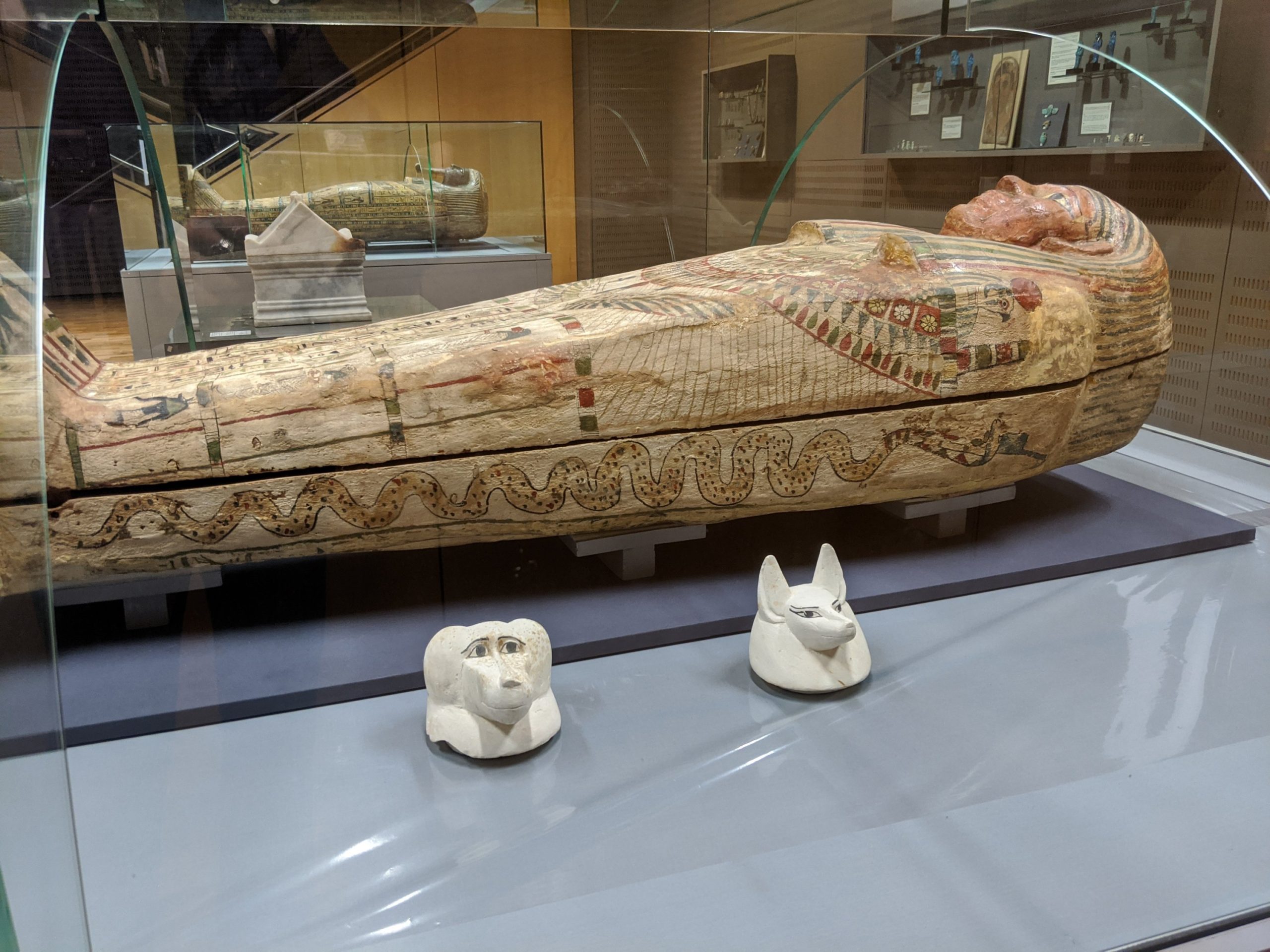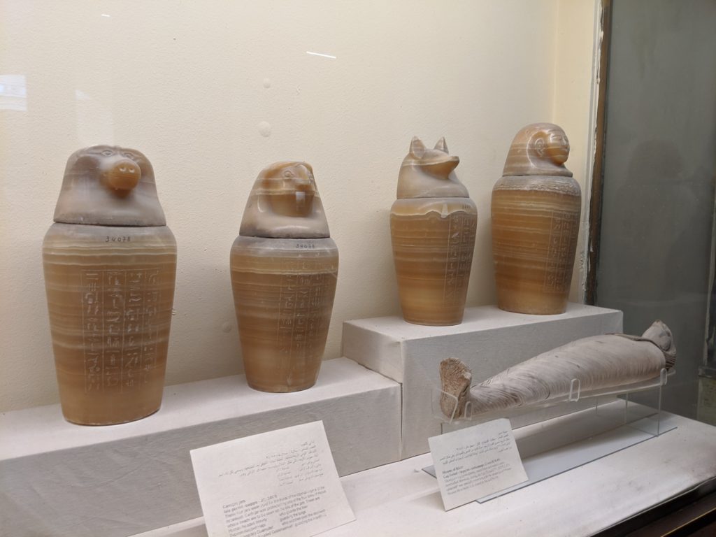 Egyptian alphabet.Egyptian god of the moon which is a blending of a baboon and an Ibis.The top of sarcophagus of a child.The torso of Hercules. There is incredible detail in the muscles.Alexander.Ancient sundial for tracking time by placing it facing the South to catch the sun’s rays. This is from 2000 BC.The heads of the Canopic jars that held the internal organs. Imsety had a human head and carried and protected the liver. Qebehsenuf had a falcon’s head and carried and protected the intestines. Hapy had the head of a baboon and carried and protected the lungs. Duamatef had the head of a jackal and carried and protected the stomach.This Mosaic is from the original library. It shows exceptional detail including the expression on the dog.