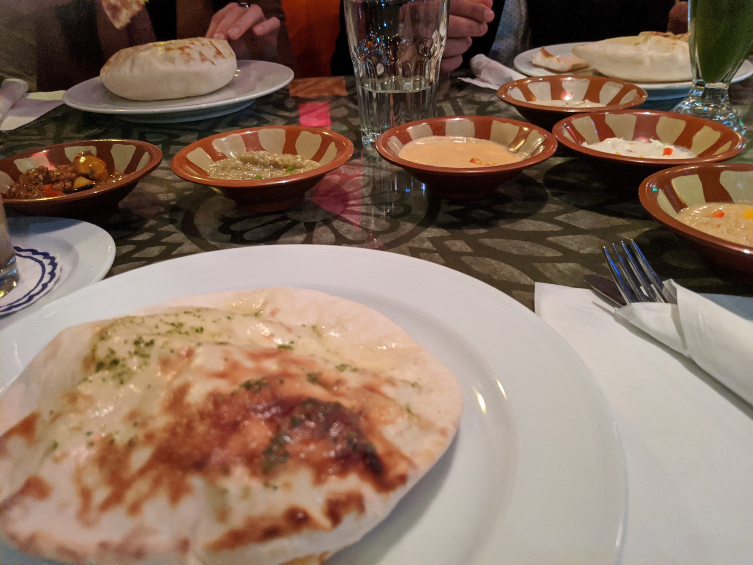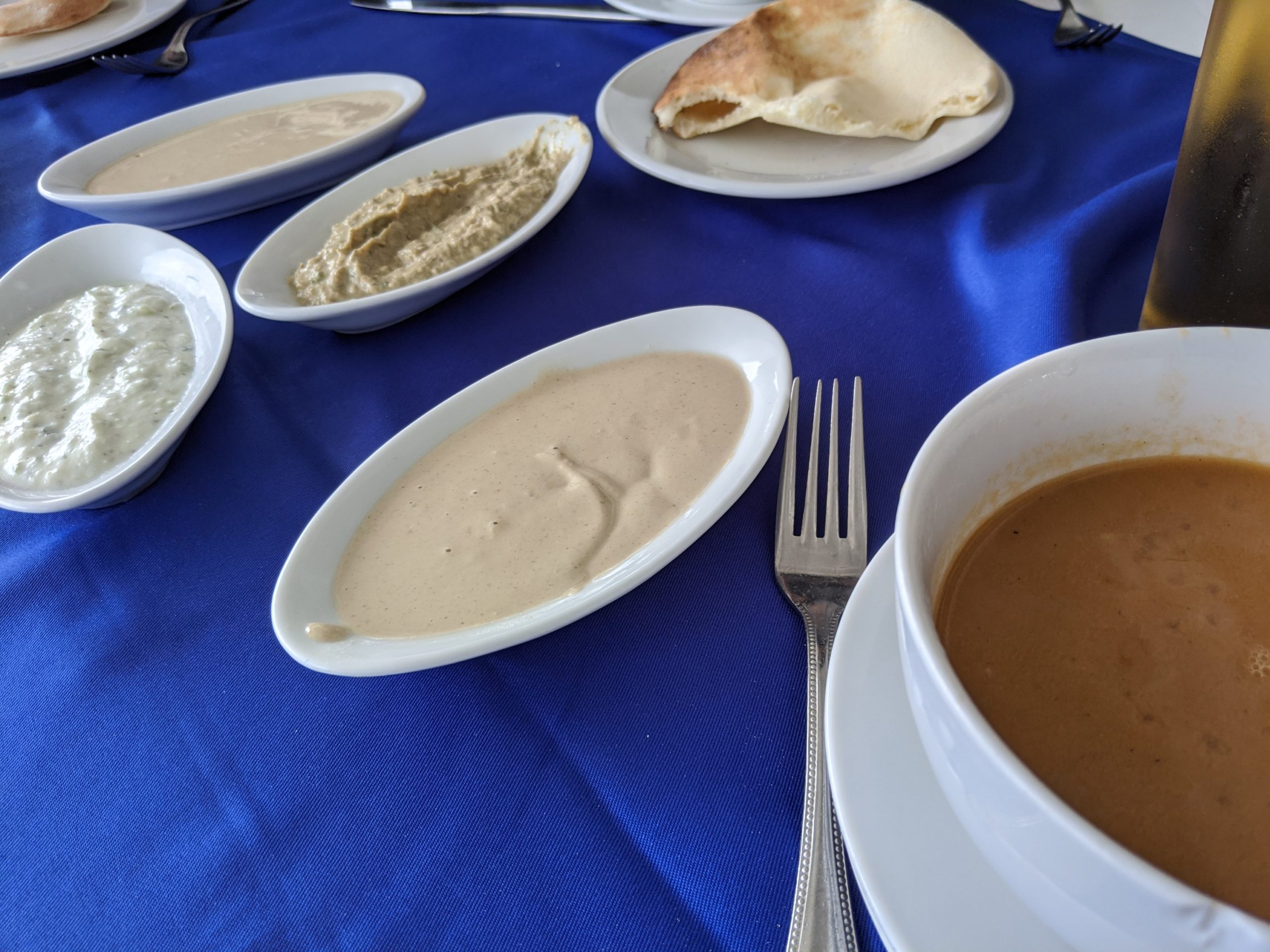 Lebanese bread with assorted dips as an appetizer that is brought automatically to your table.