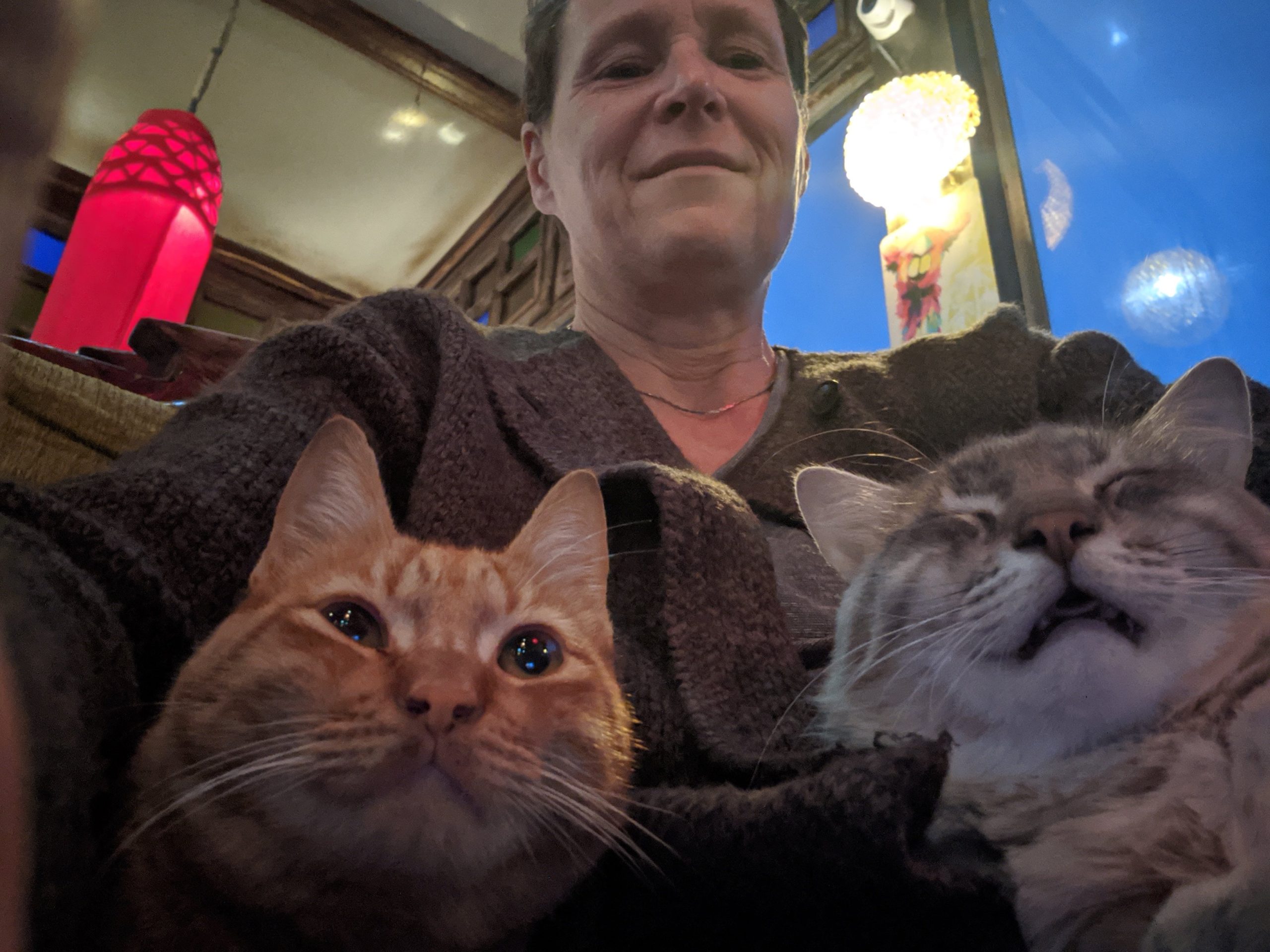 We ate at night at Shark. It is set up like Bedouin. Carpets, chairs with cushions… The food was wonderful but so were the cats. As is usual with people who know me, I attract animals. The cats would come and sit on my lap here. So funny. The grey one just wanted to relax and