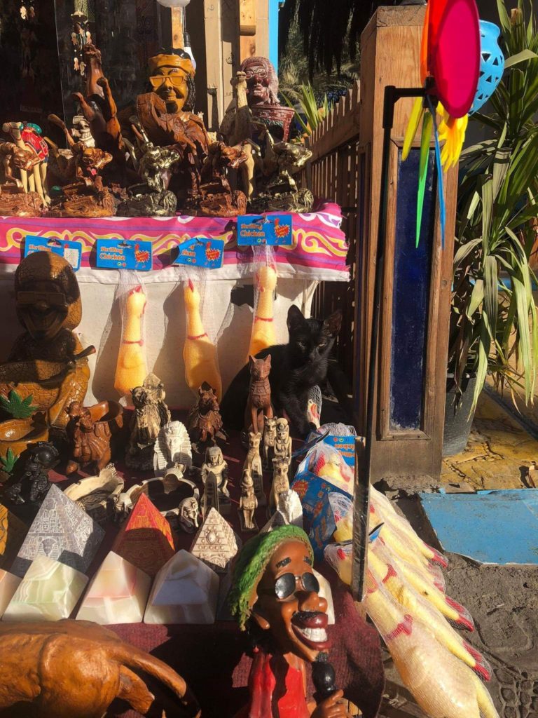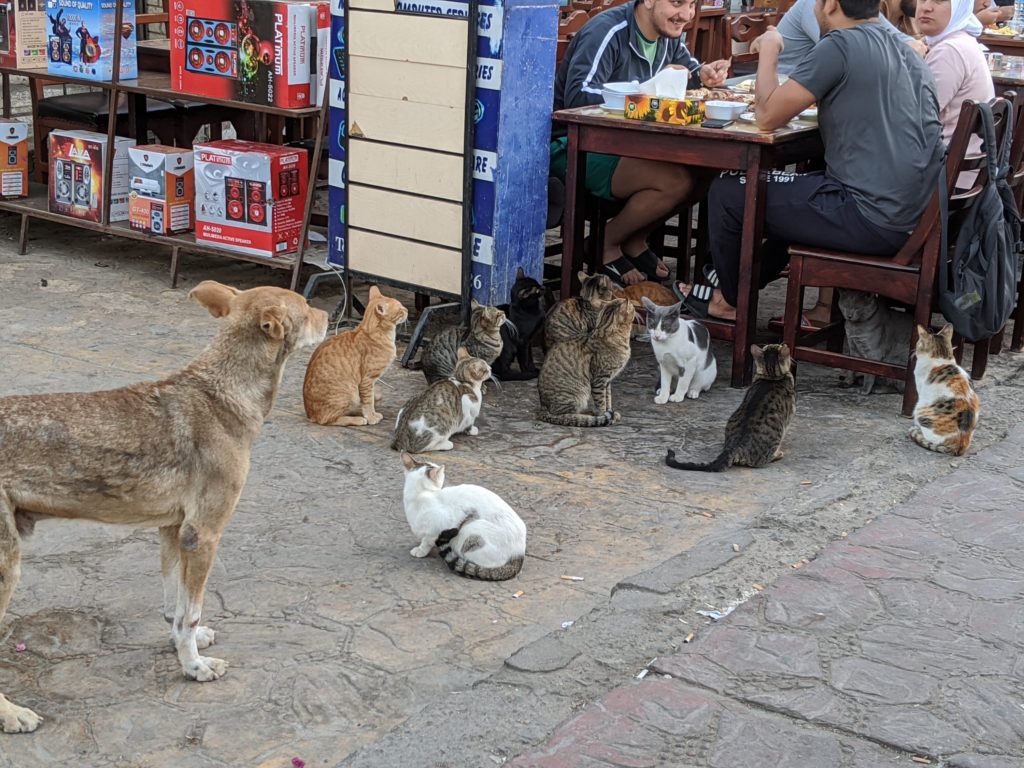 Outside one of the restaurants there was a large amount of cats congregated. The poor dog stood in the back. He doesn’t stand a chance if any food is given.Nicole took this picture of a black cat sitting amongst cat statues. It is the Where’s Waldo of kitties.Nicole also took this picture along the Red Sea. Beautiful!