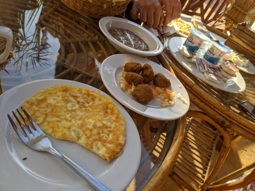 At the resort we have been eating traditional Egyptian breakfast which is eggs, foul (yummy fava bean dish), homemade cheese, cucumbers/pita bread, fruit…