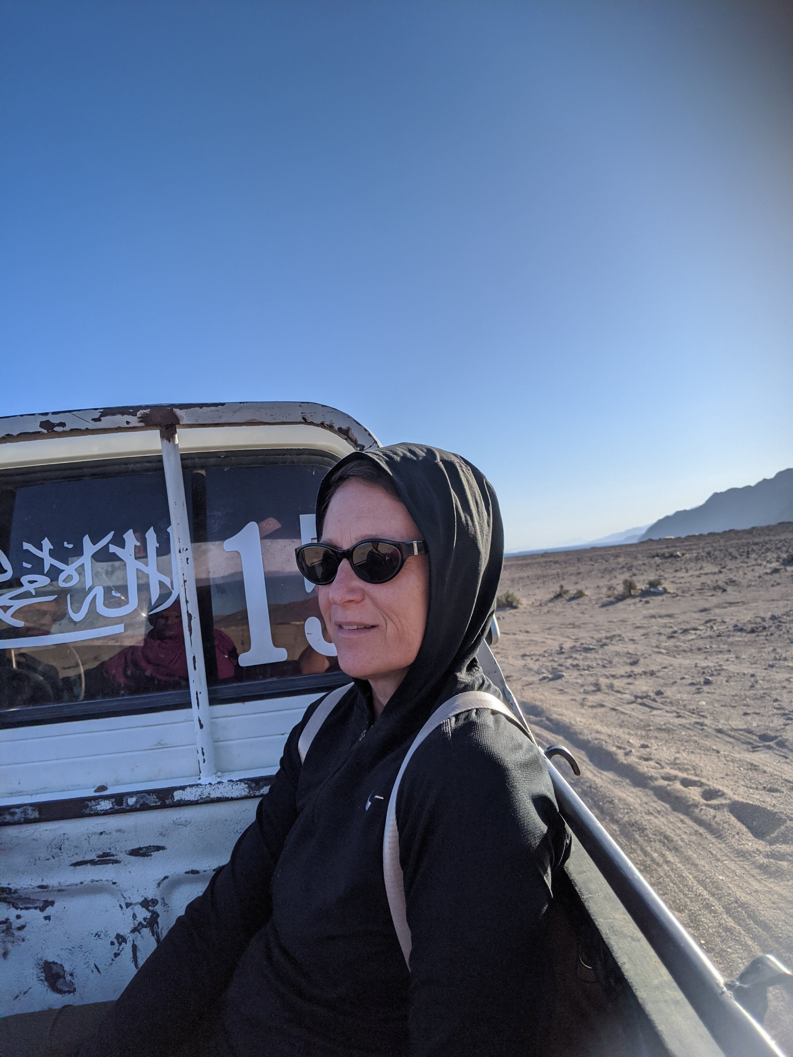 One of the Egyptians told me I looked like a badass. Funny! The scarf was needed to keep sand out of your face.We had to ride on roads for part of the journey to get to the next access point in the desert between the mountains.