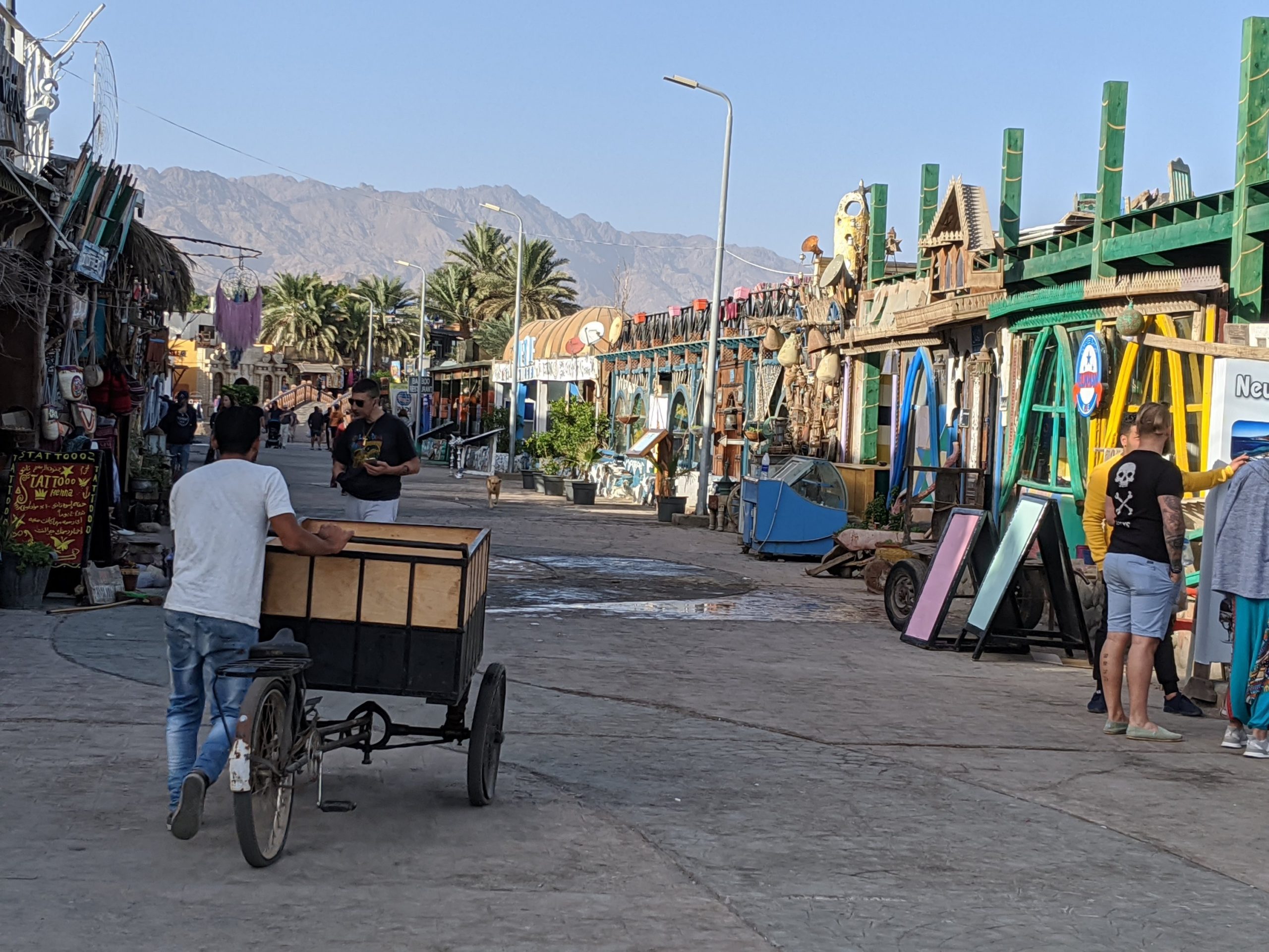 Dahab used to be a Bedouin fishing village. In fact you can have dinner at night in the desert with traditional Bedouin food. The corniche along the Red Sea has many shops, restaurants, and dive centers.