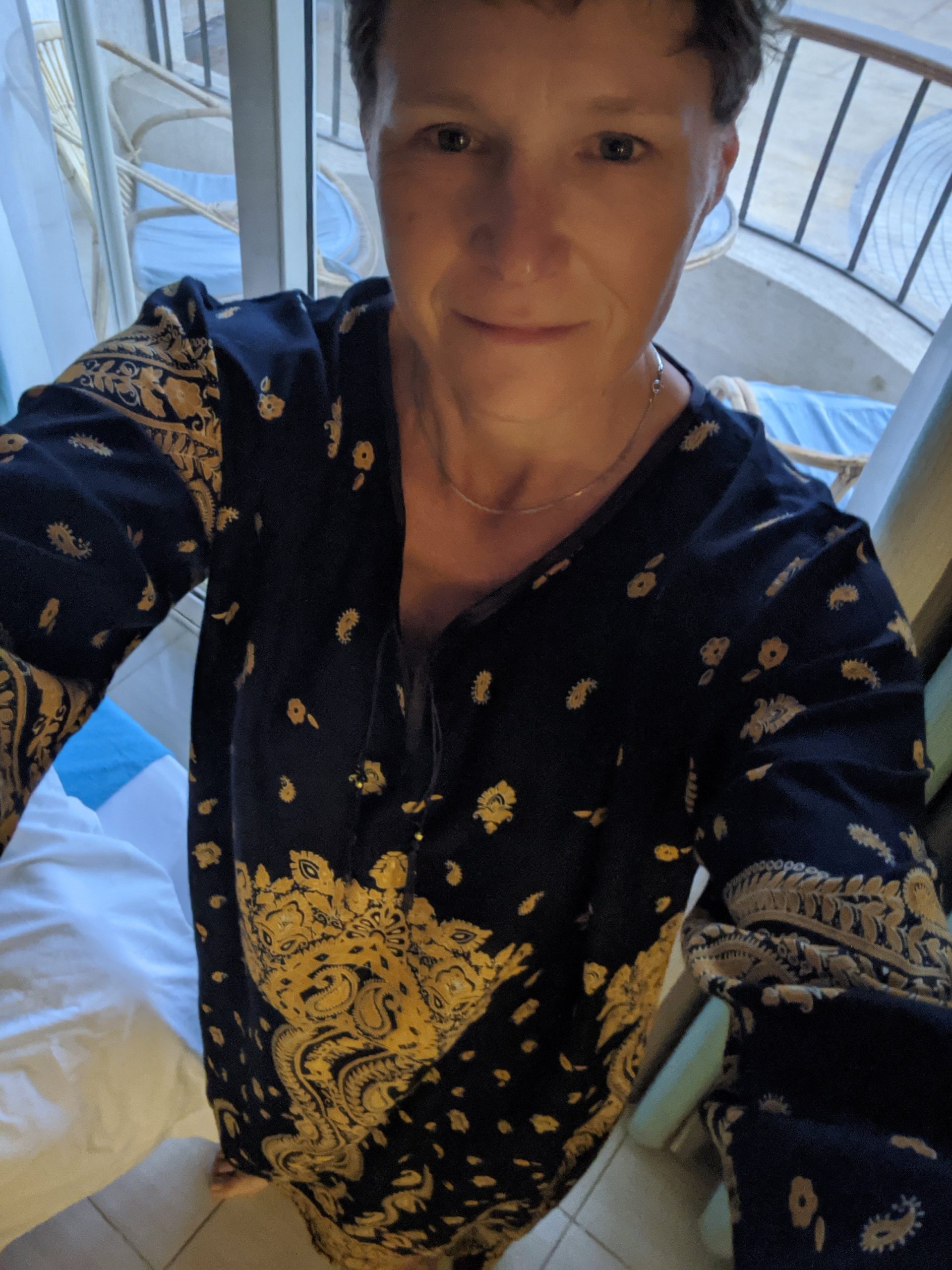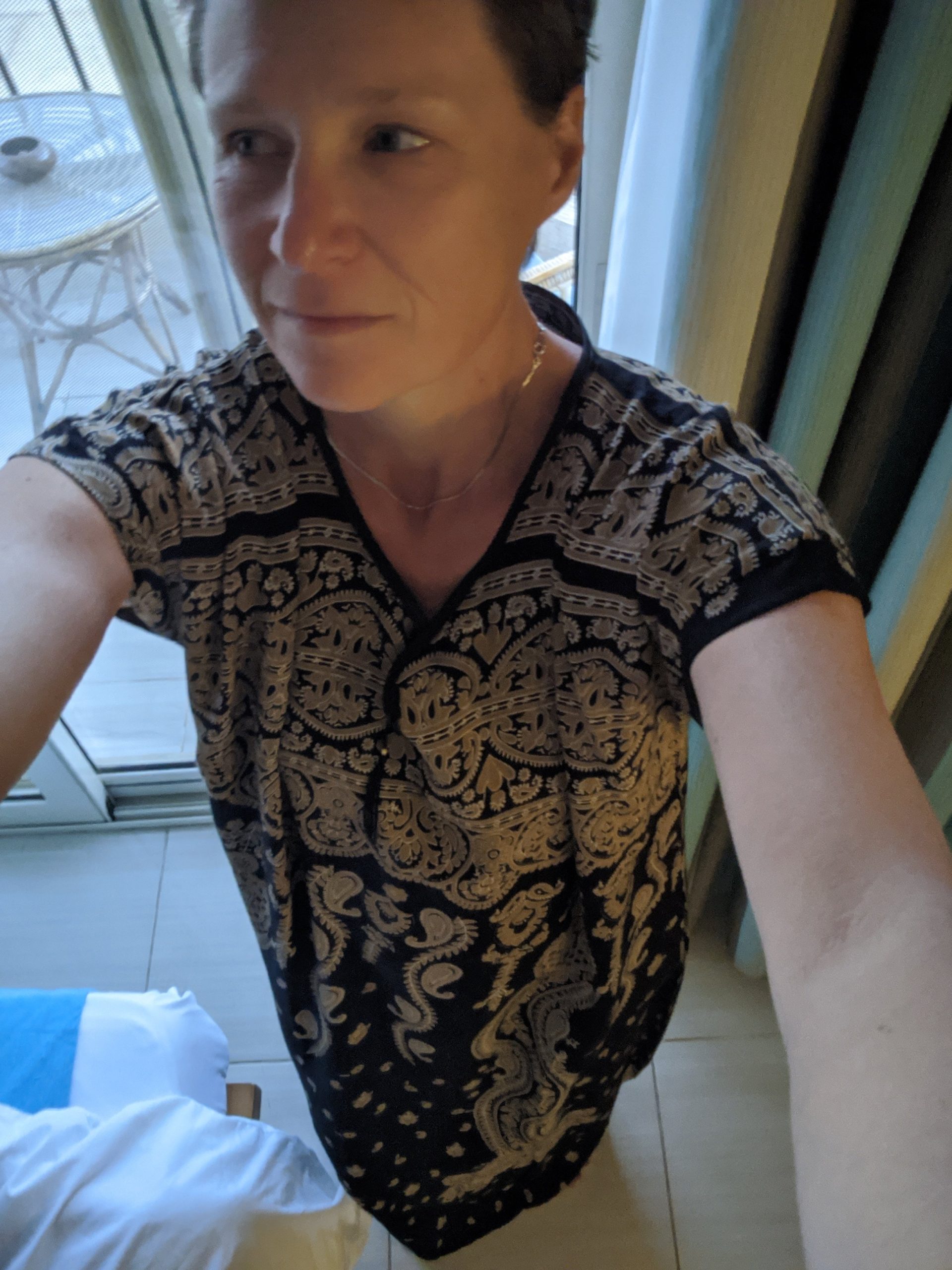 I went shopping for caftans. I remember my mom wearing them in the 70’s and lately I think they would be really comfortable for lounging. I found a long sleeve one and then found this short sleeve that was very pretty.