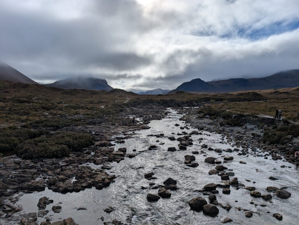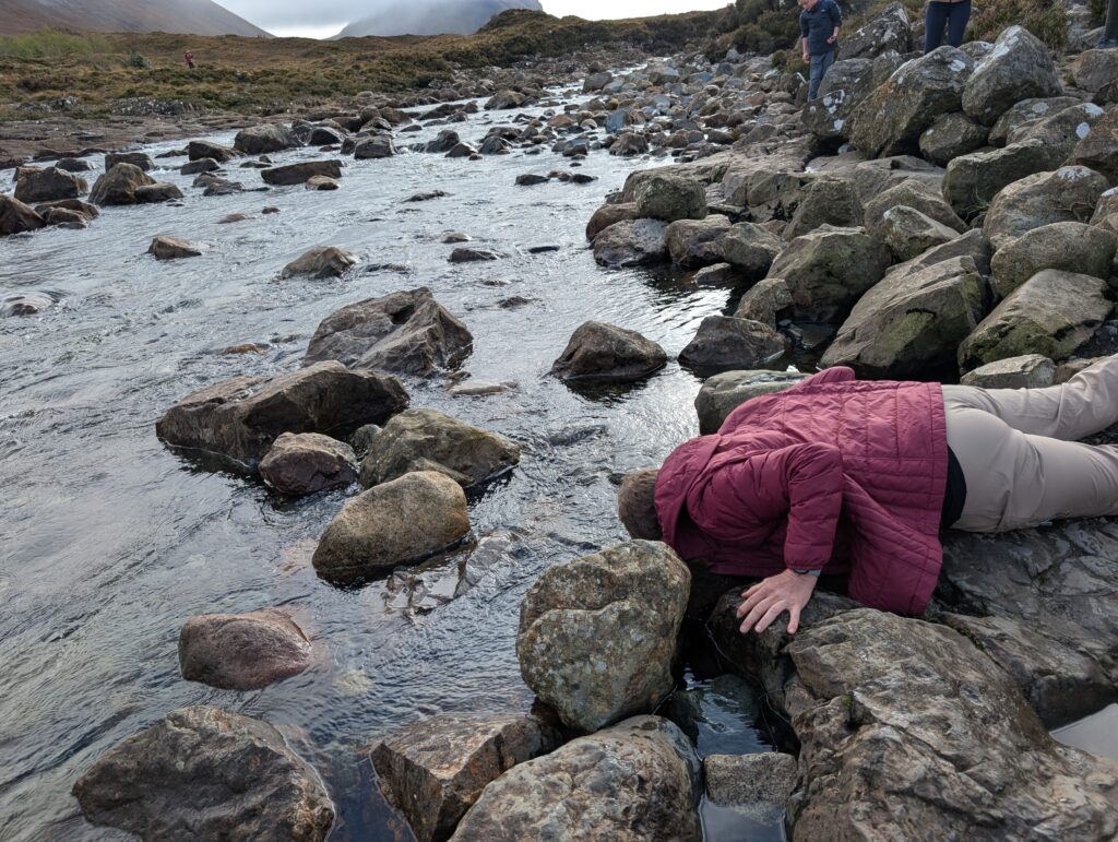 The pioneers that climbed the Cuillins were John Mackenzie and Norman Collie. Their statue faces the Cuillins. I joined in putting my face in the river as it is to bring good health and longevity.