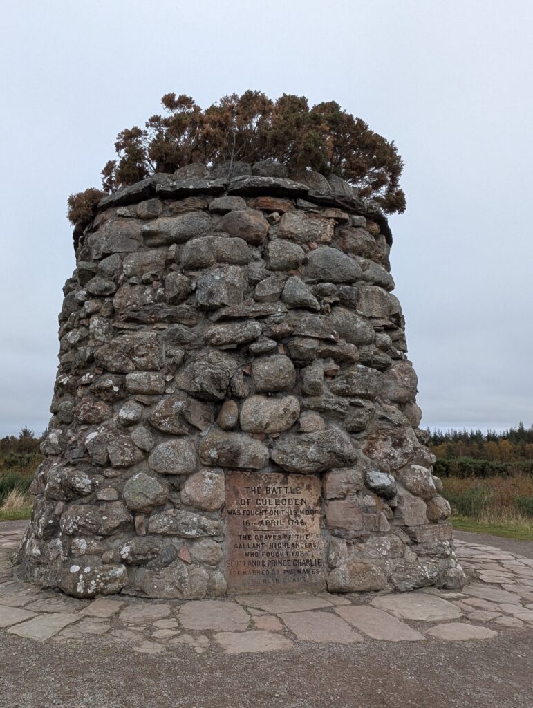 We also visited the Culloden battlefield. It is a great site to learn about Scottish history. For centuries the Stuarts in Scotland challenged the English throne to restore Catholic rule from the Protestants (I was always intrigued by Mary Queen of Scots and Elizabeth I). The bonny Prince joined the Jacobite clans with some aid from the French to try to take London. The final battle was here where a series of unfortunate mistakes led to their massacre. The history of both sides is laid out well in the museum before entering the battlefield. Red flags for UK and blue for Scotland are marked where the battle lines started. Rock markers for where the various clans fell and were buried in a mass grave can be seen. Some weathering makes a few difficult to read. There is also a memorial cairn on the site.