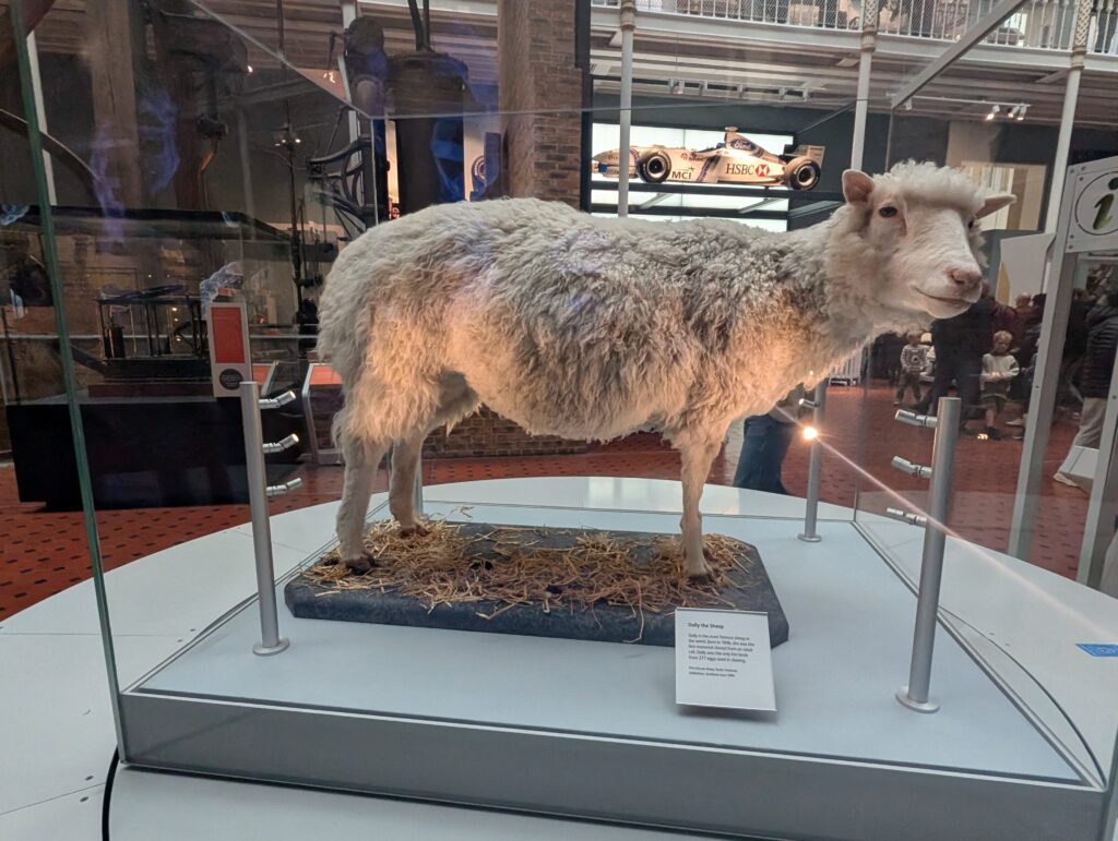 The National museum had many exhibits from all over the world. The most interesting was the body of Dolly, the cloned sheep. She had been preserved and was on display.