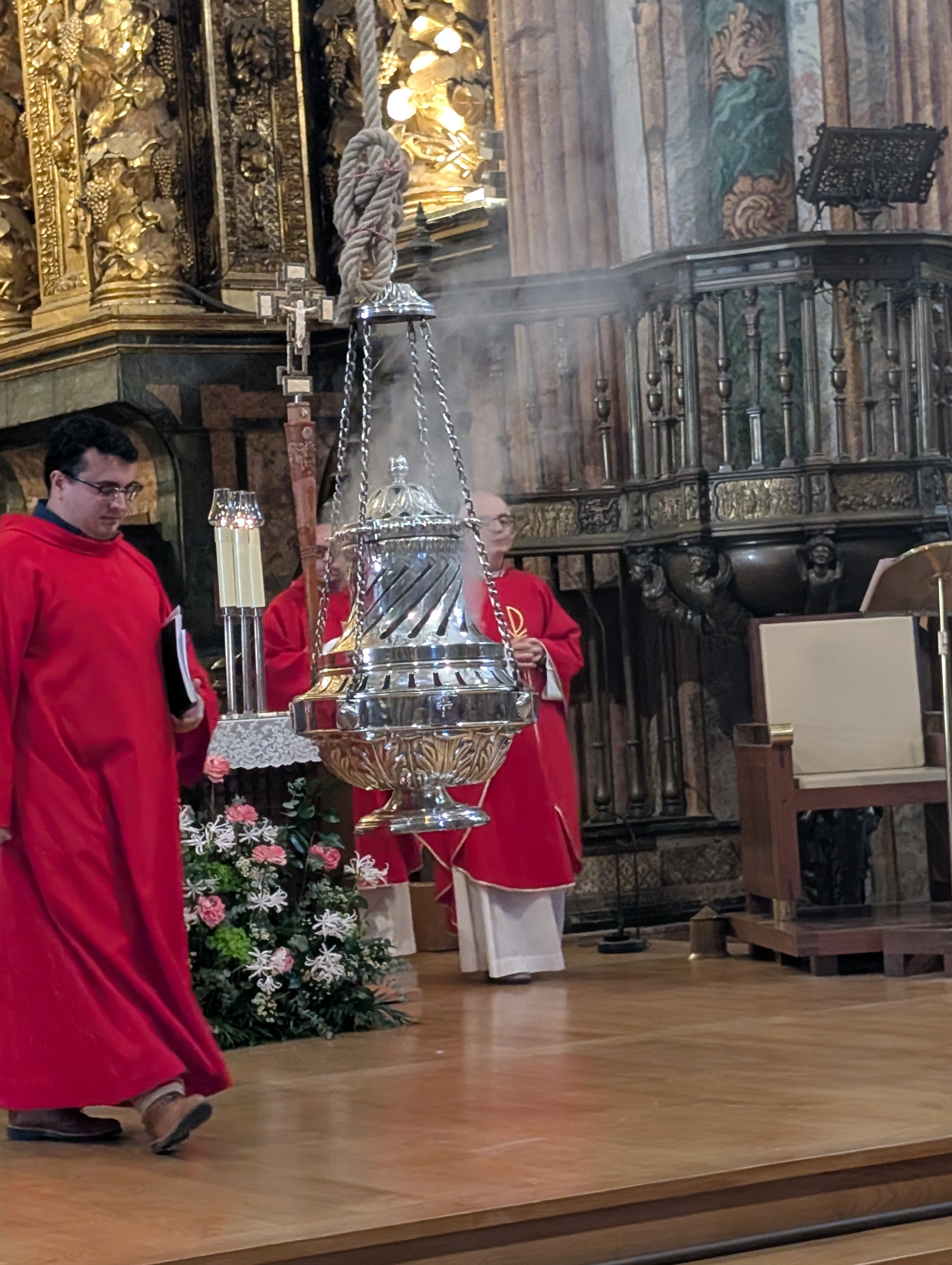 The Botafumeiro has been used since the Middle Ages to help remove smells from the cathedral (not much bathing back then). Today it is a tradition in Santiago and we were privileged to see it.