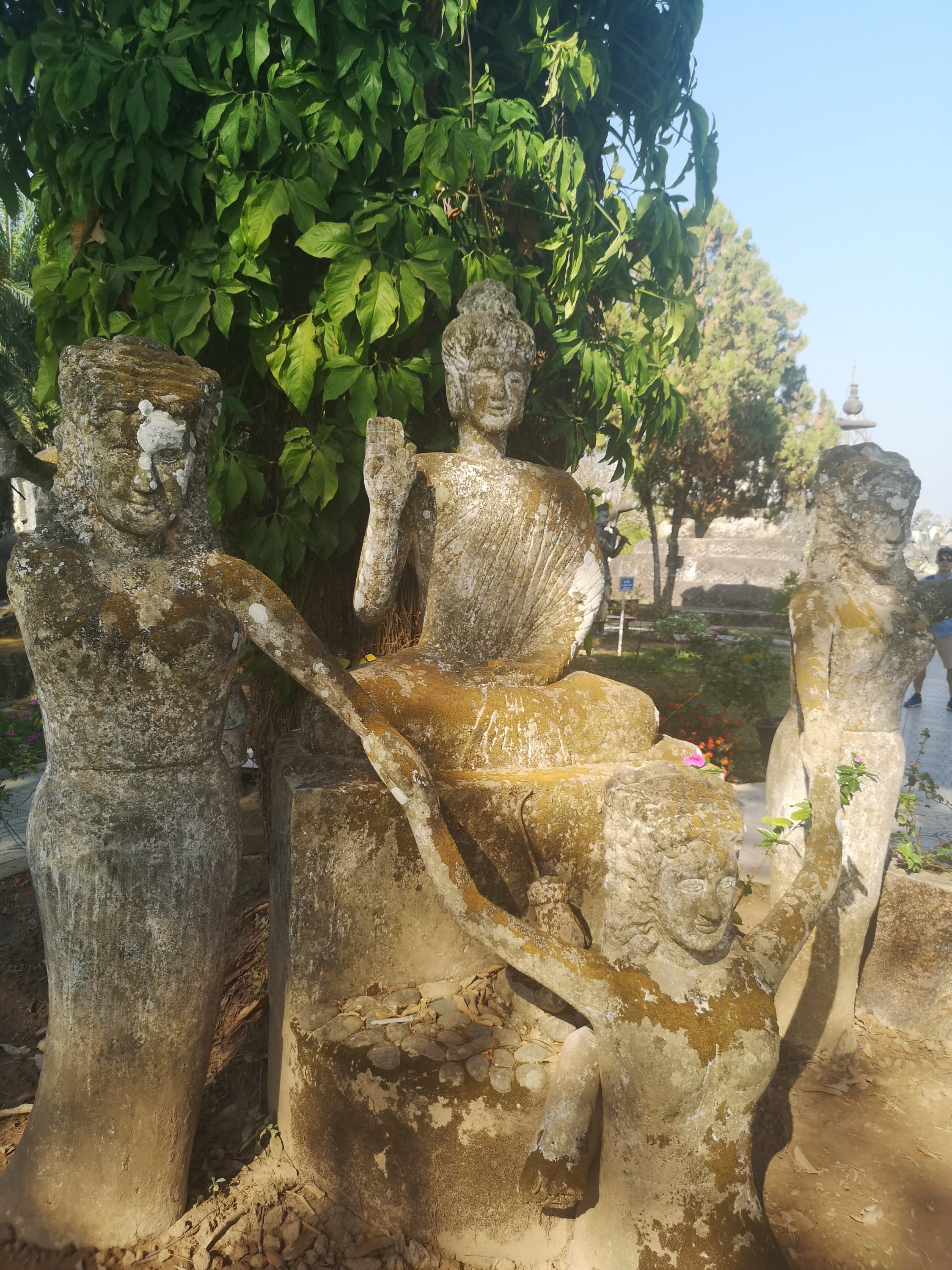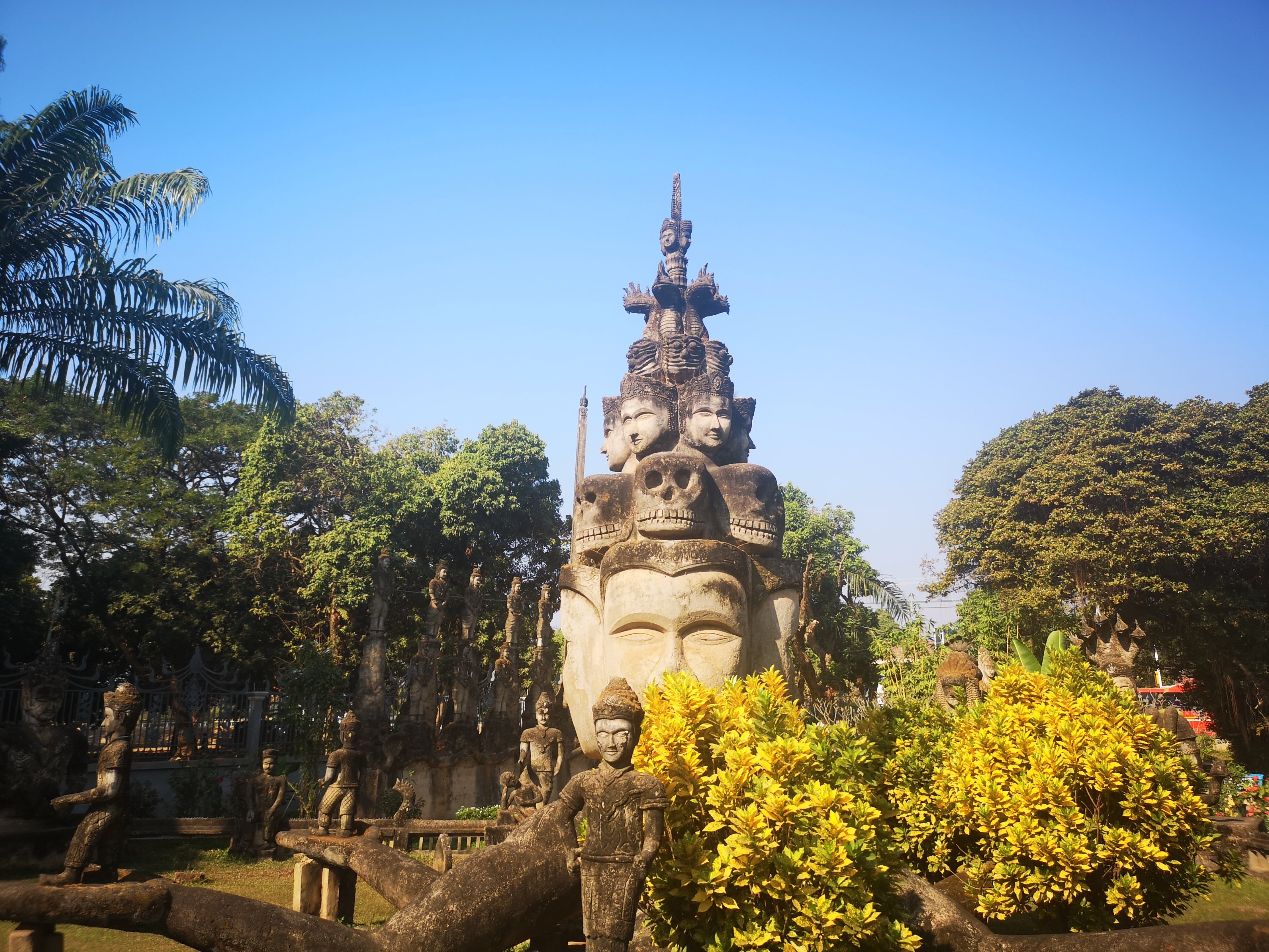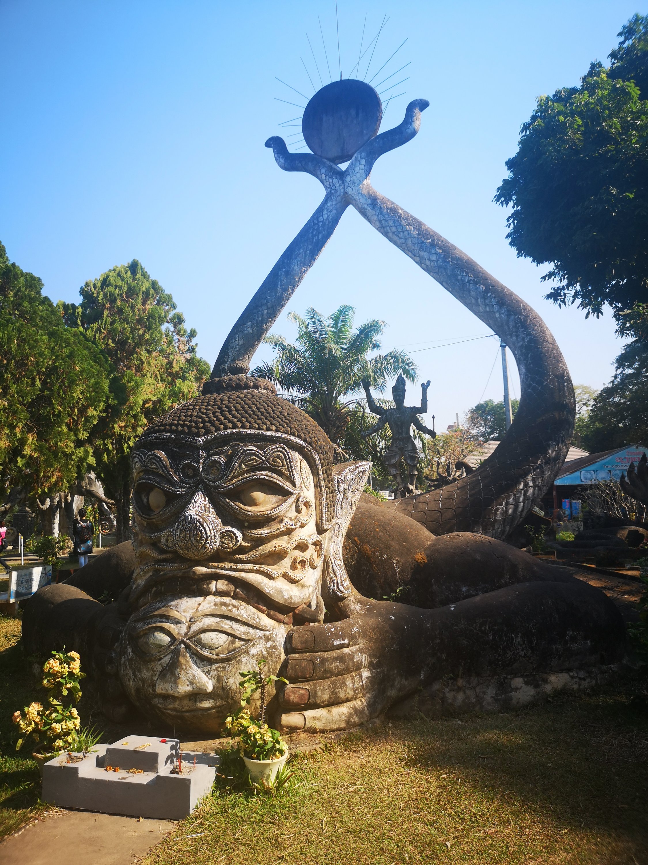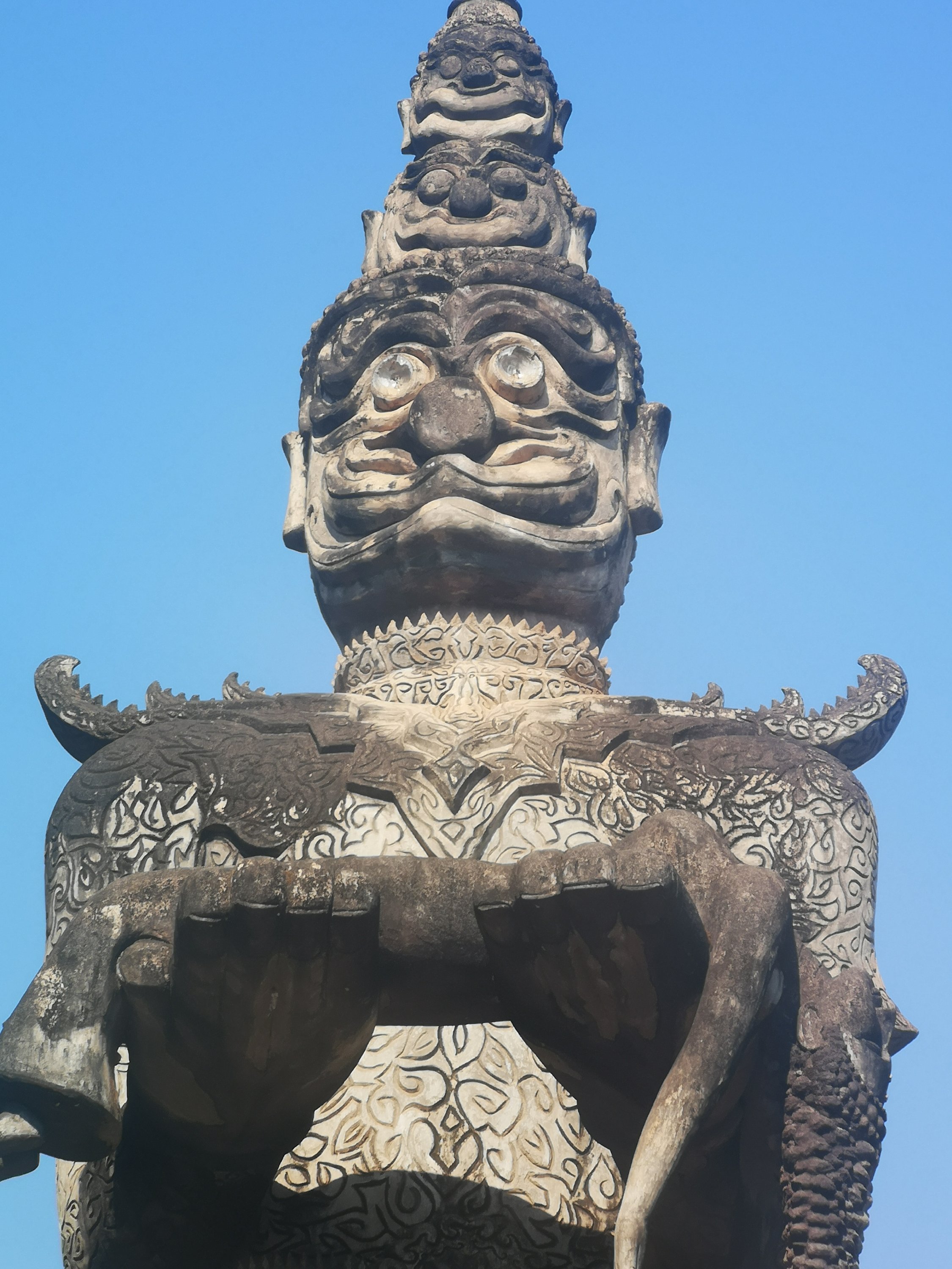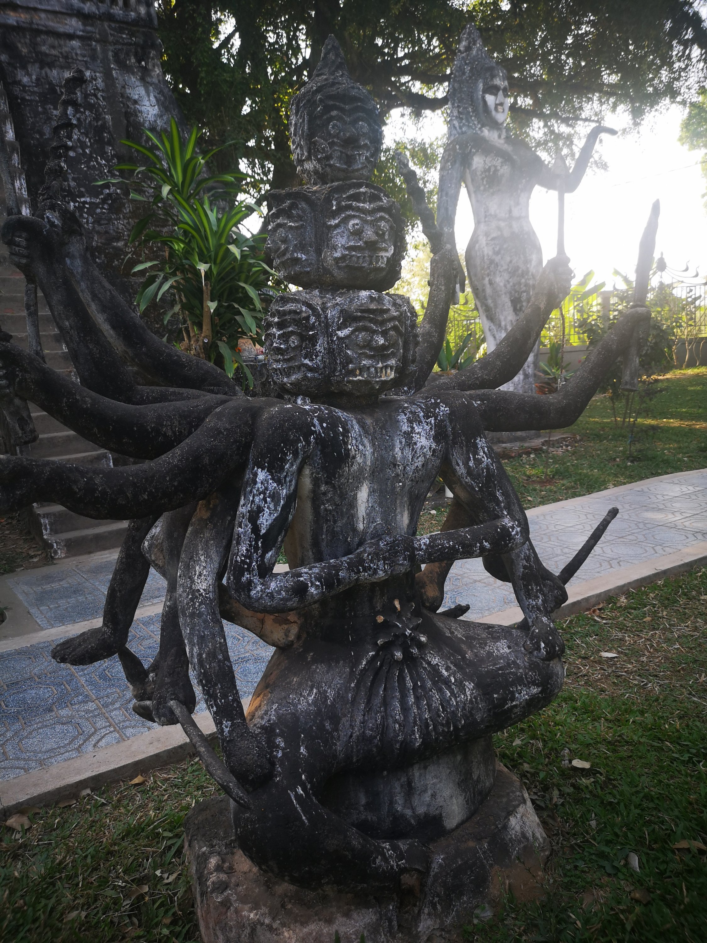 Buddha Park is also known as Xiang Khan, it means “Spirit City”. There are no traditional Buddha statues. Built by Luang Pu, who styled the park in Buddhist and Hindu mythology erected statues built by amateurs to showcase that mythology. The statues are bizarre and cool at the same timeand each tells a story. As it was my last morning in Vientiane and we needed to check out of the hotel, we did not spend time to do the audio tour. During unrest during the revolution in Laos in 1975, he fled the city into Thailand (Nong Khai) which is less than 1 kn away and built a similar park there. You can see the Laos park from the highest structure in the park in Thailand.
