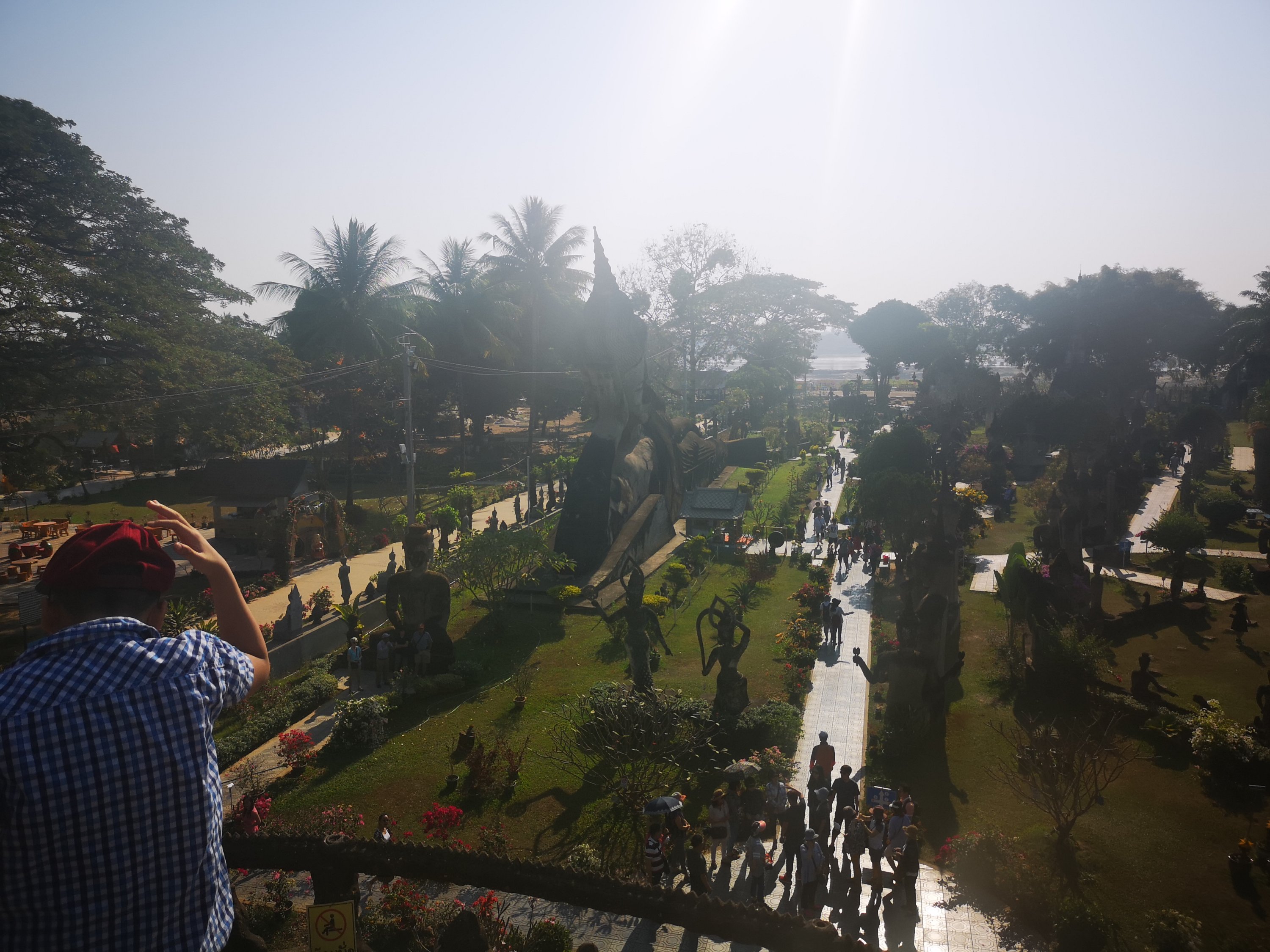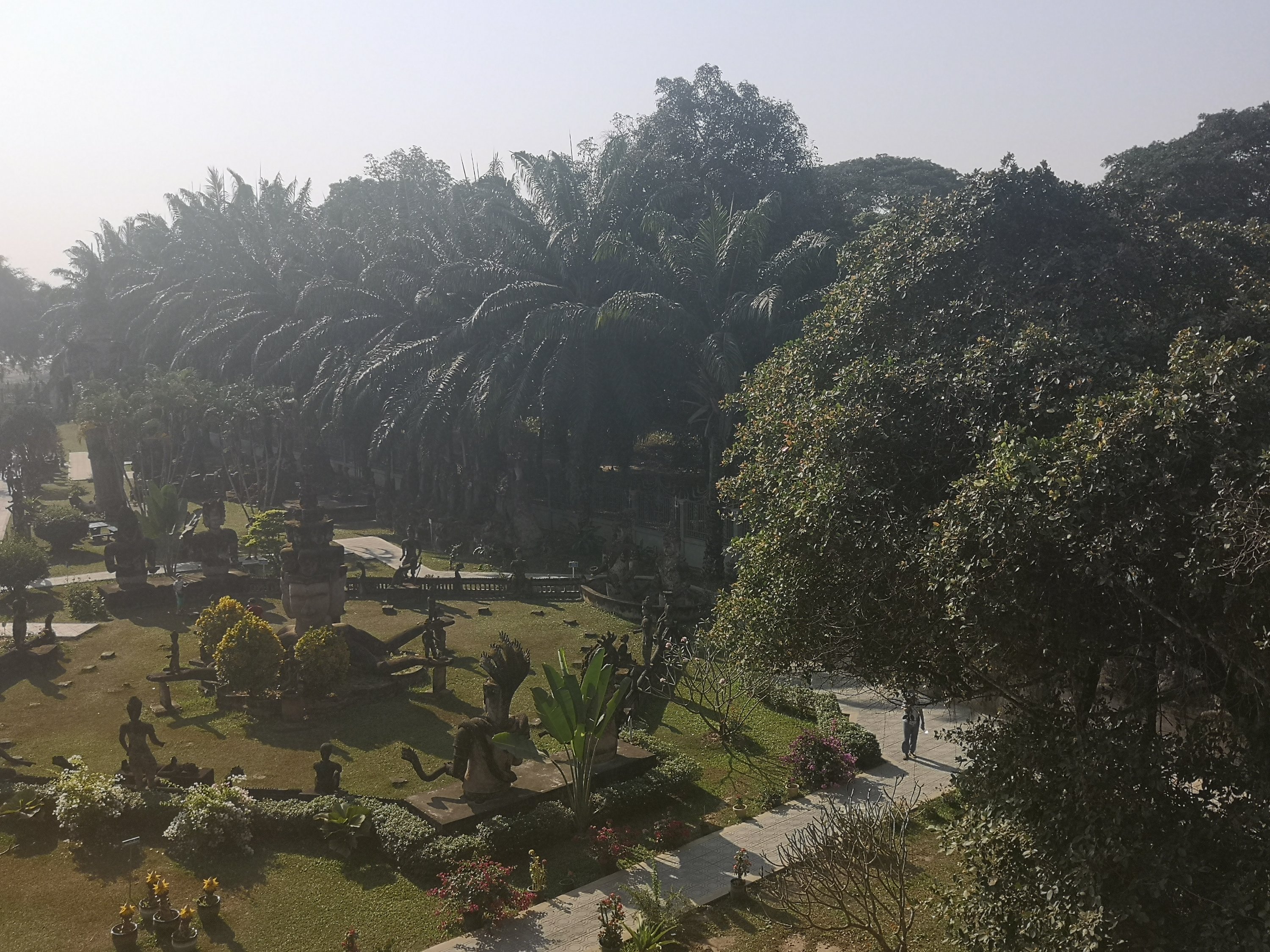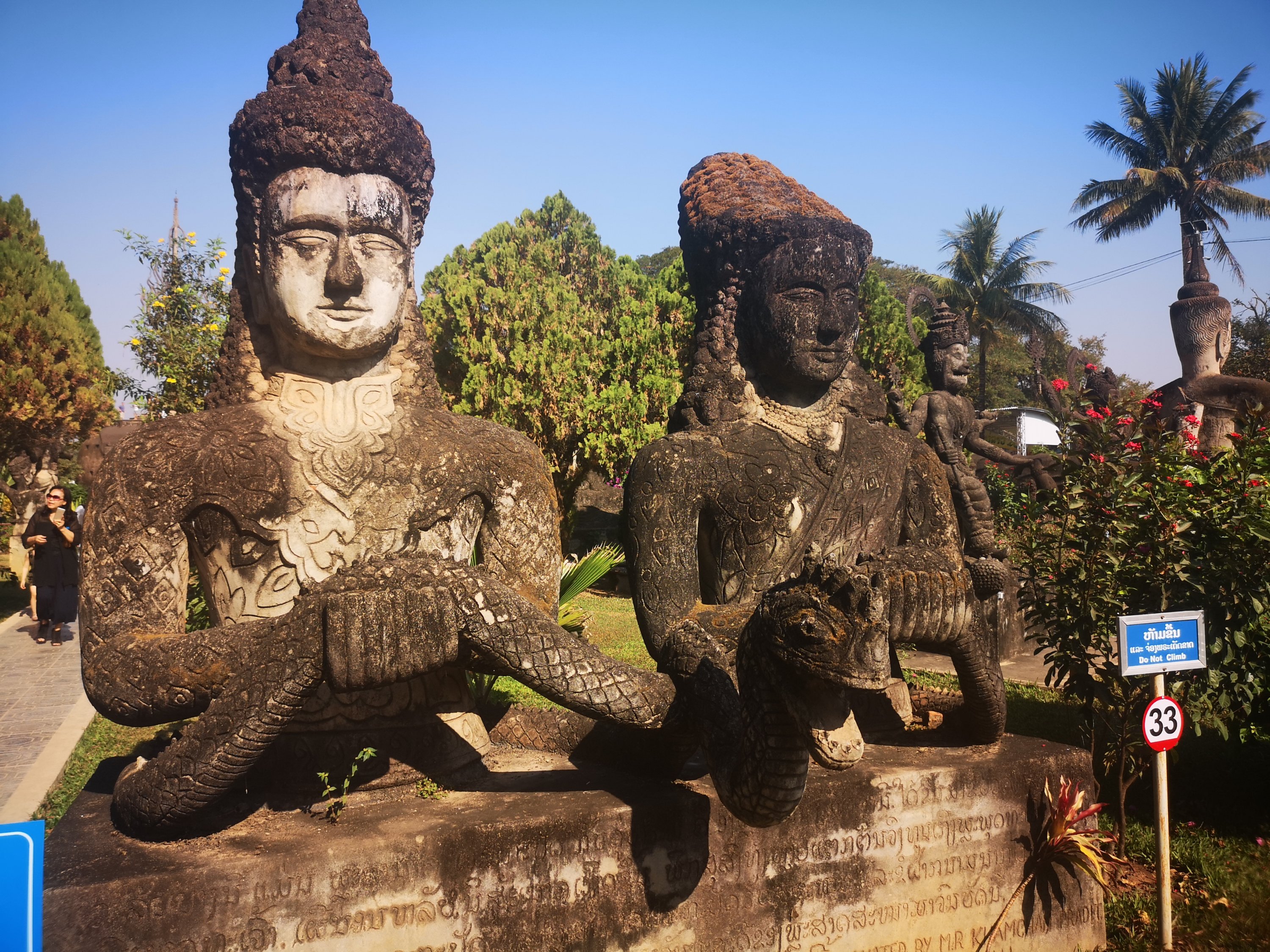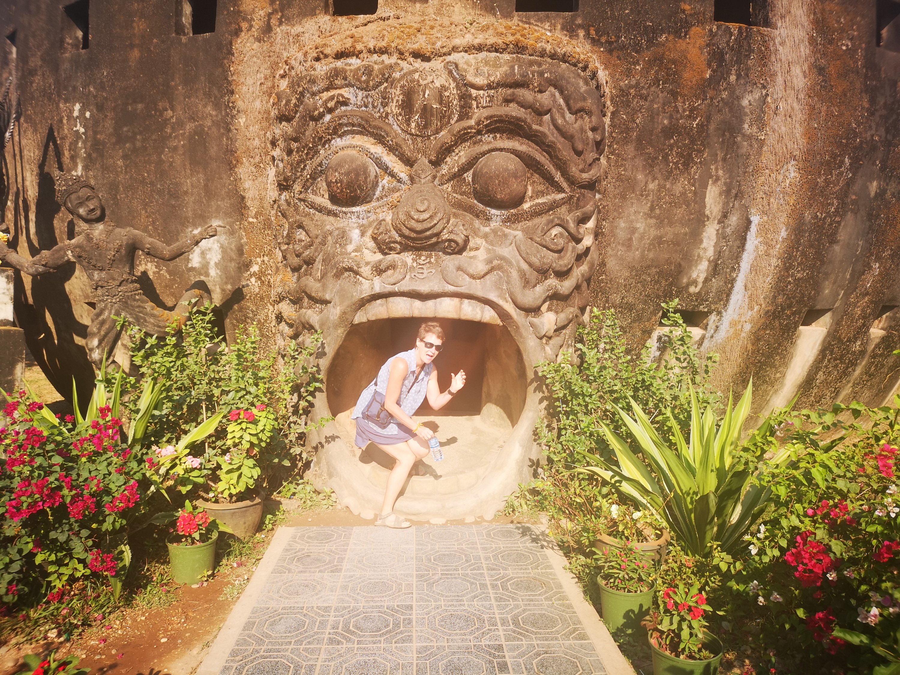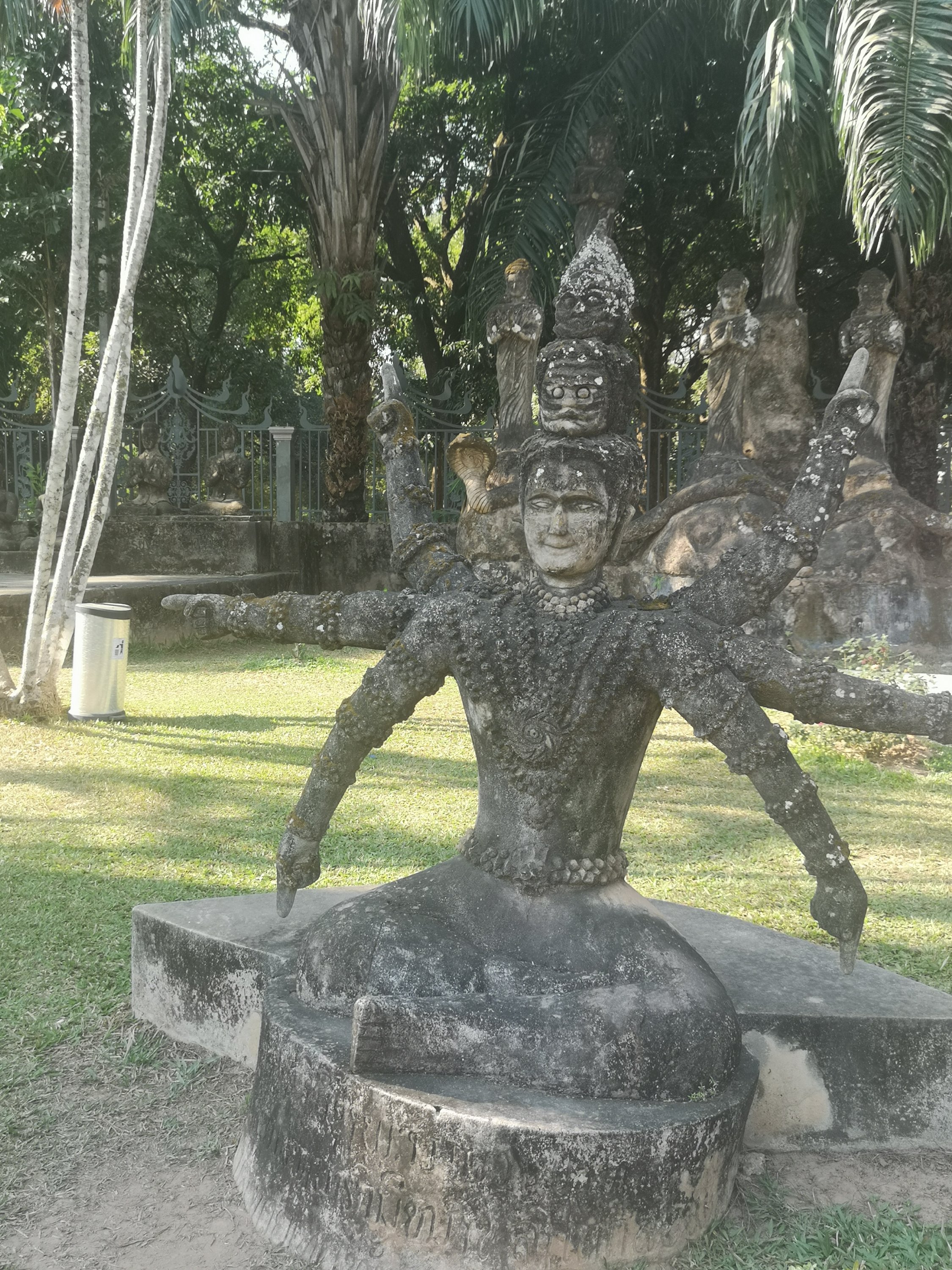 Buddha Park is also known as Xiang Khan, it means “Spirit City”. There are no traditional Buddha statues. Built by Luang Pu, who styled the park in Buddhist and Hindu mythology erected statues built by amateurs to showcase that mythology. The statues are bizarre and cool at the same timeand each tells a story. As it was my last morning in Vientiane and we needed to check out of the hotel, we did not spend time to do the audio tour. During unrest during the revolution in Laos in 1975, he fled the city into Thailand (Nong Khai) which is less than 1 kn away and built a similar park there. You can see the Laos park from the highest structure in the park in Thailand.
