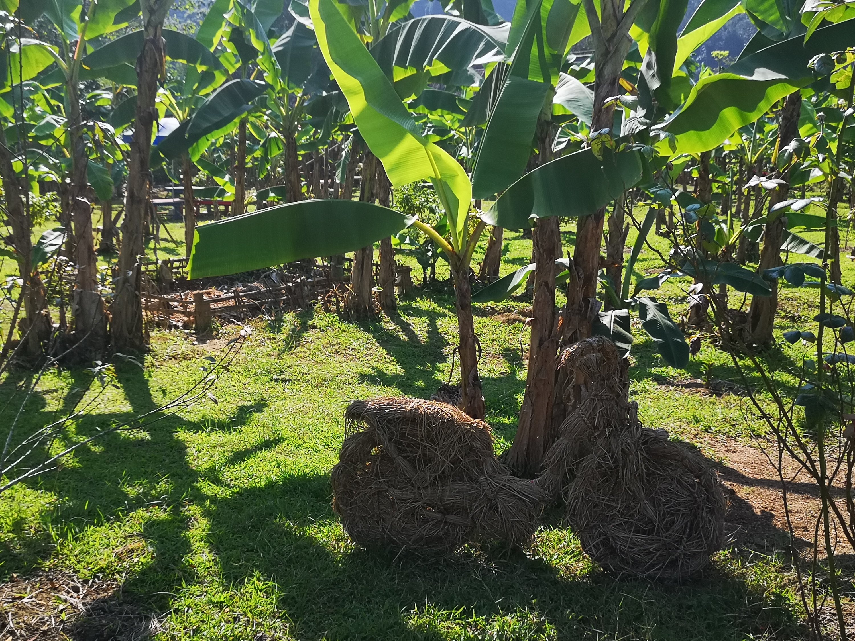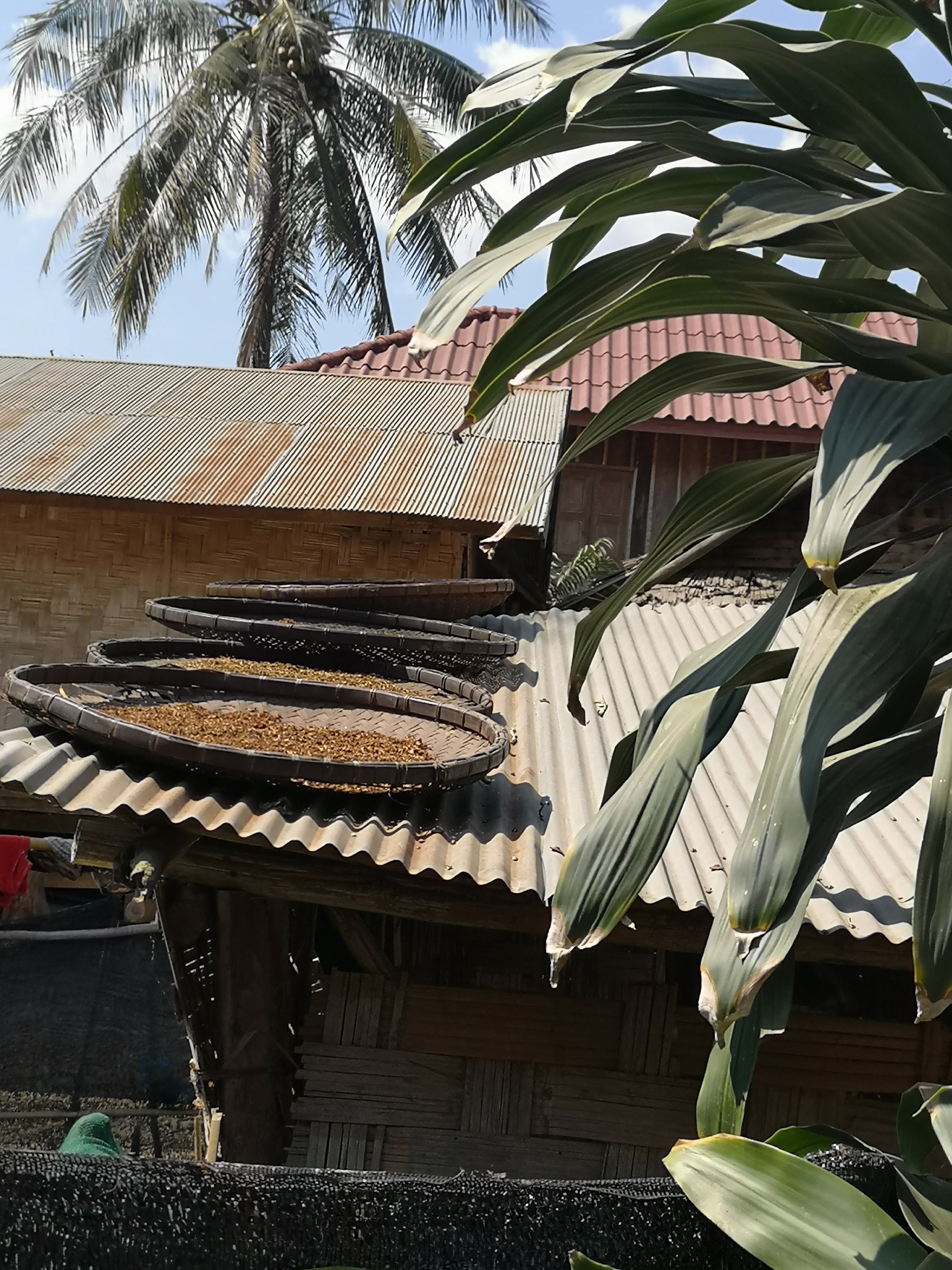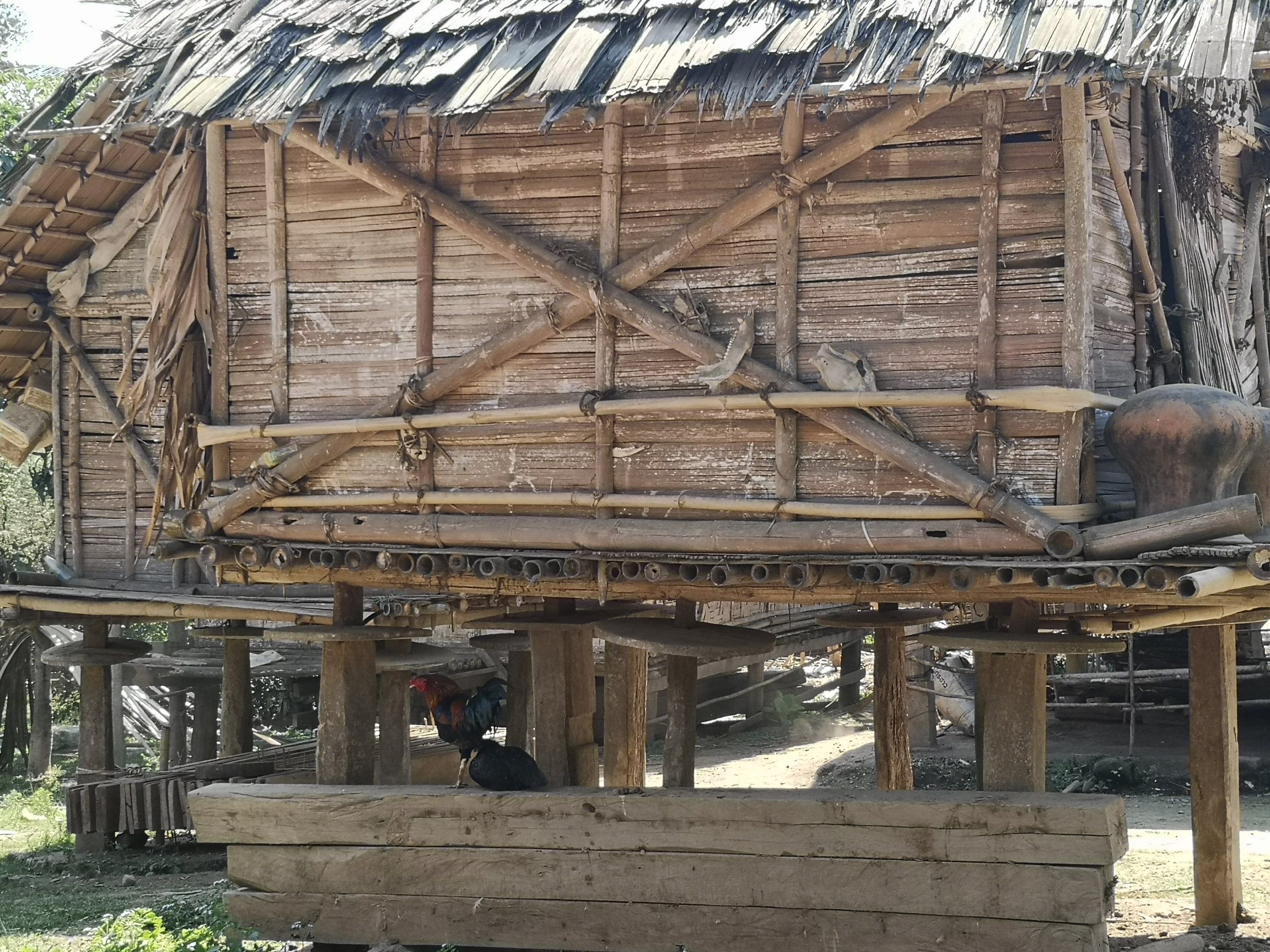 This hut is to house sticky rice. The disks on each leg stop the rats from climbing to get into the house. There are a lot of dogs and not much cats. Here dogs do a better job of controlling the rats.