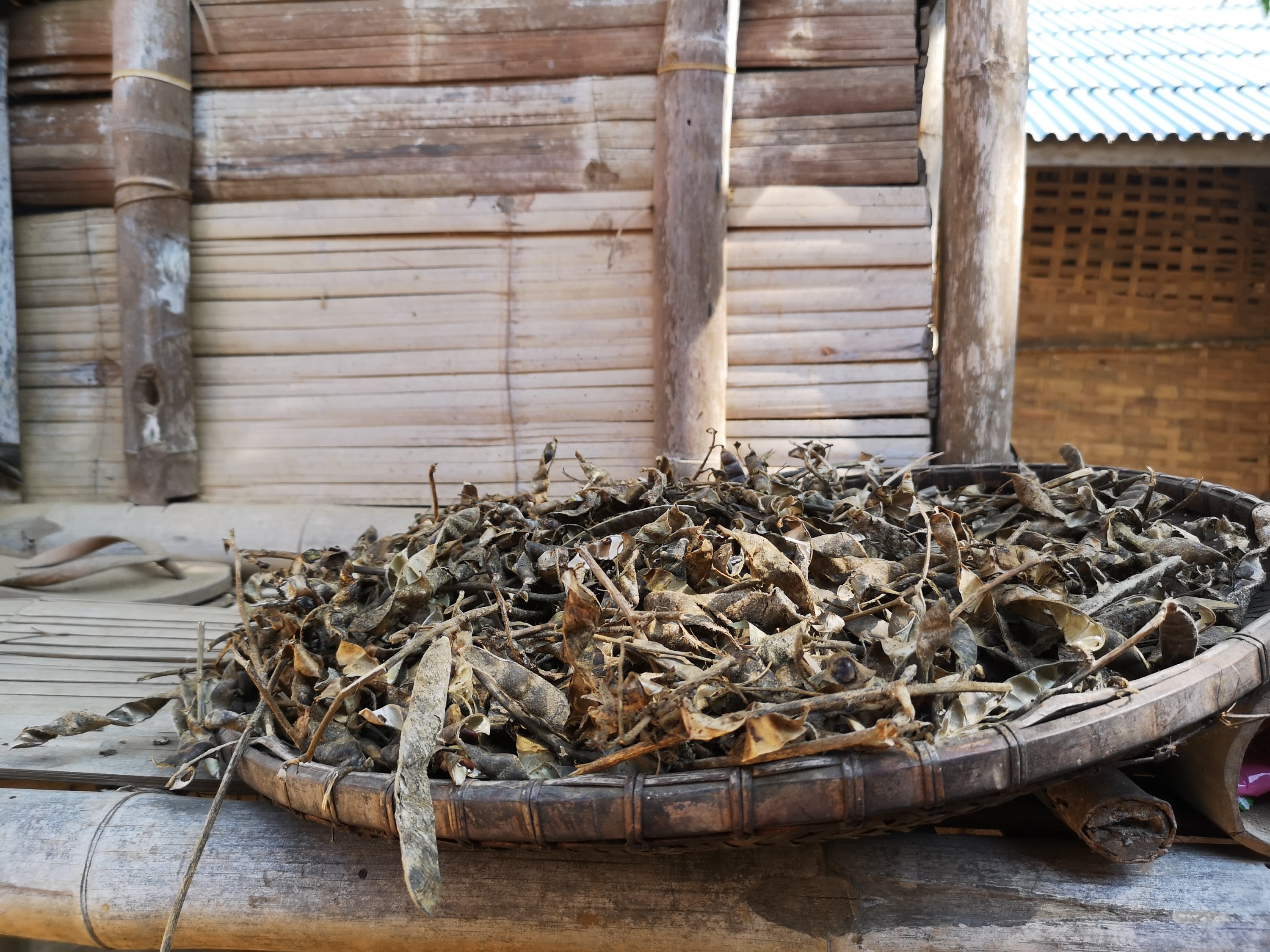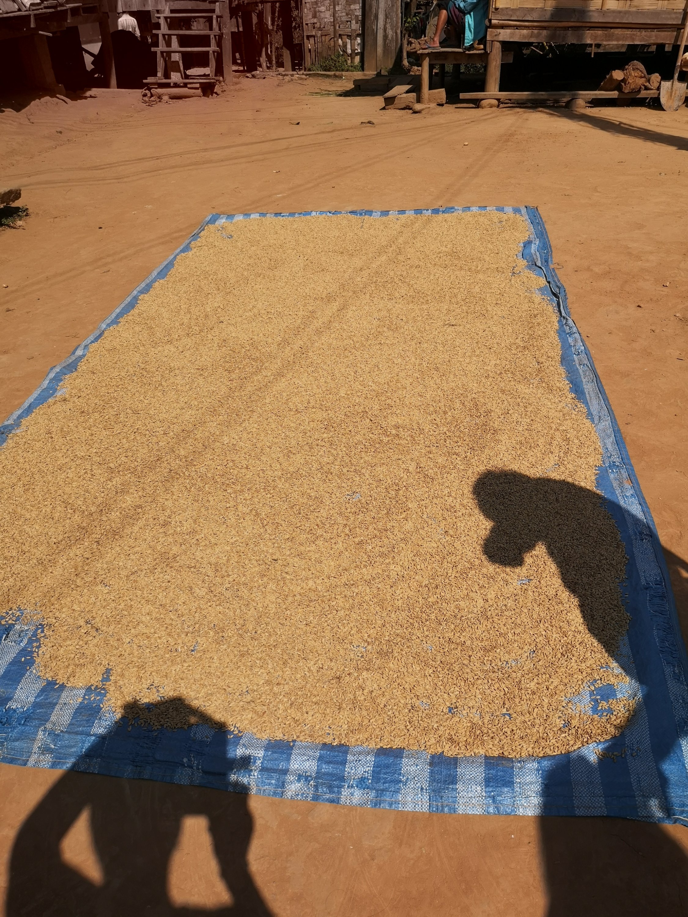 Drying the sticky rice grain. Some villages like this one can pool money for a machine to remove the outer covering or bran. Otherwise it is thrashed by hand.