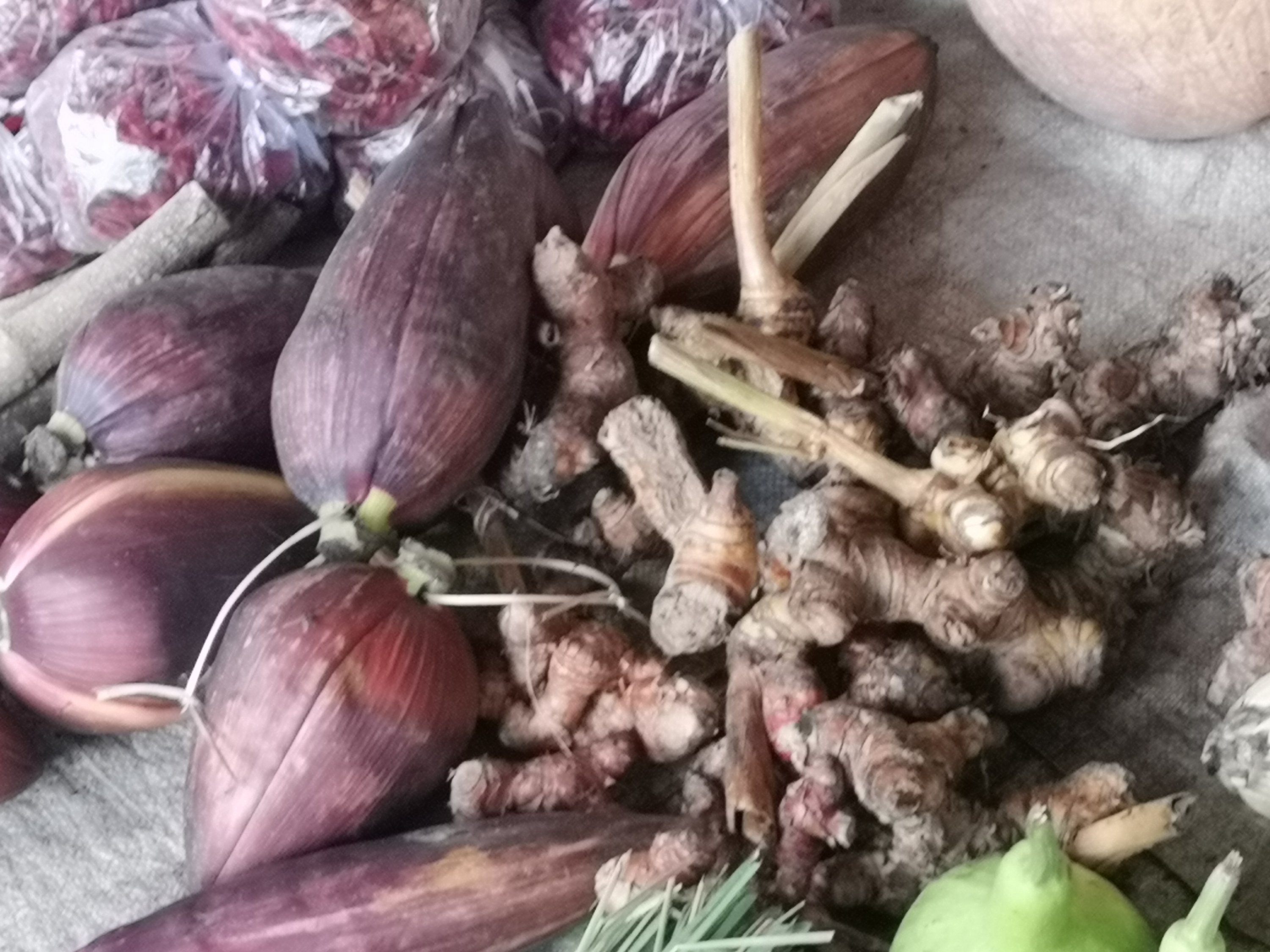 Here is banana flower and golangal. Both are used in cooking.