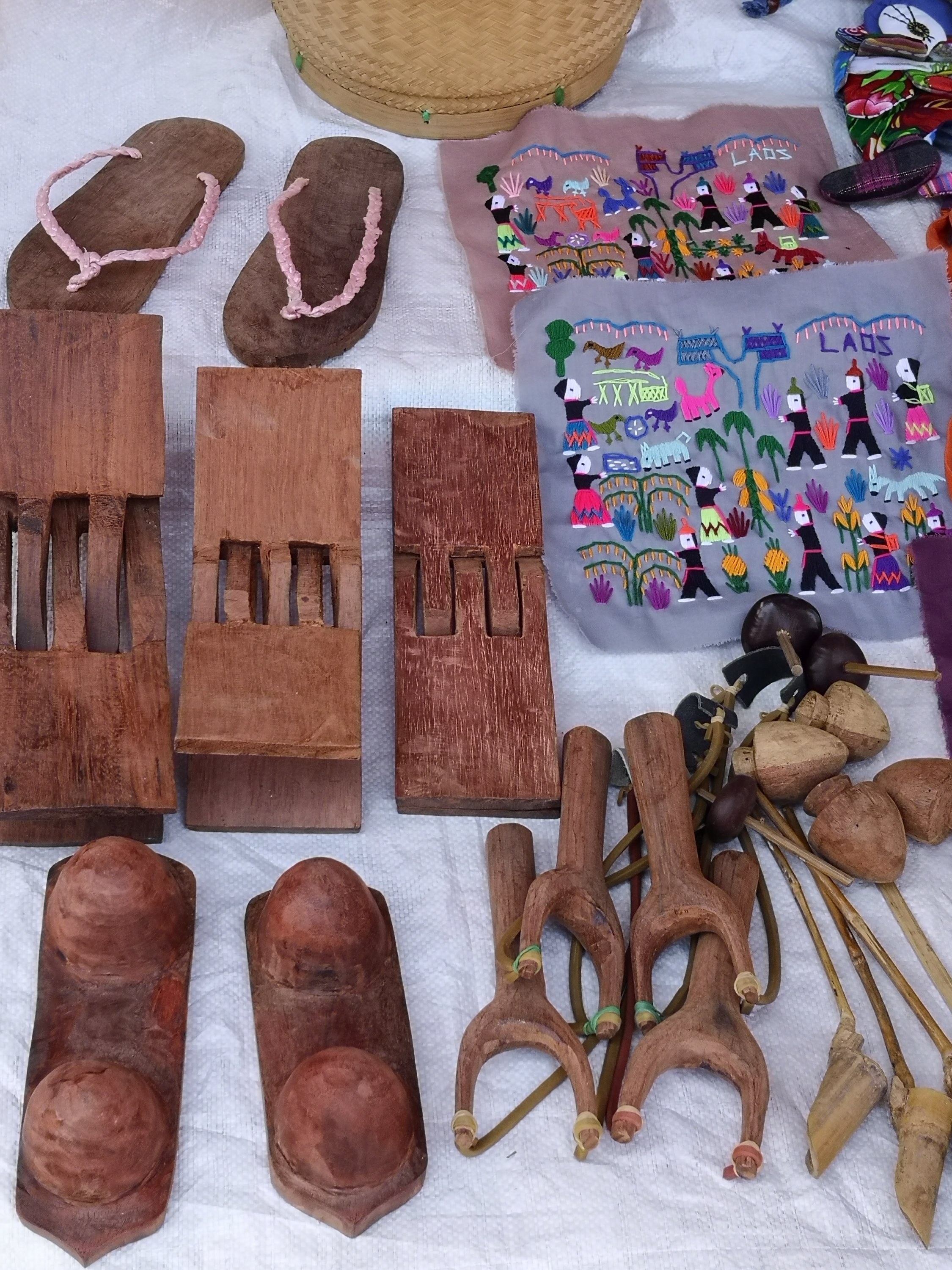 The wood pieces on the left side of this next picture is actually a pillow. You can put fabric on it but can adjust somewhat for your neck. At the bottom is a massager. On the top left is homemade sandals and yes they carved treads on the bottom.