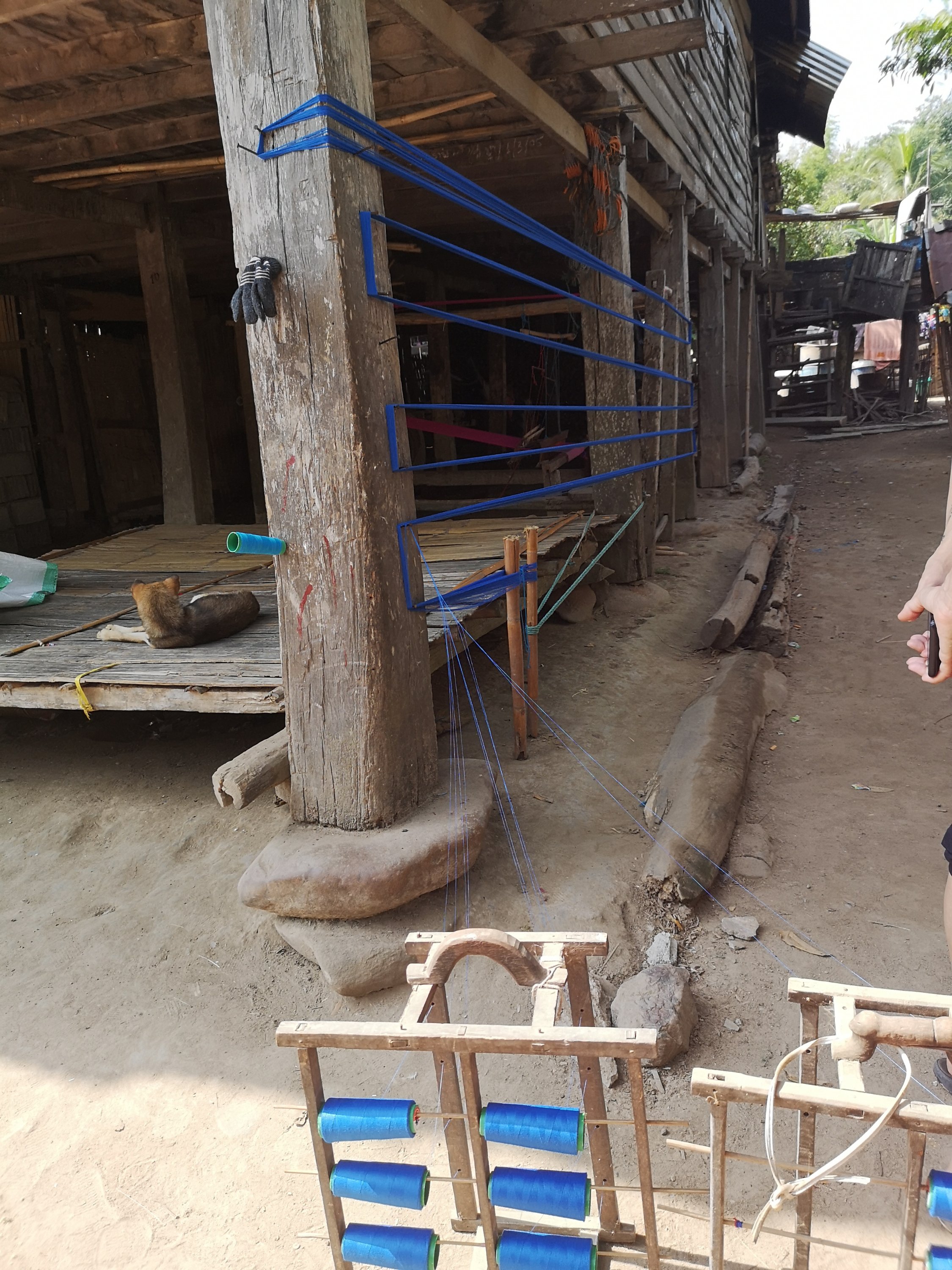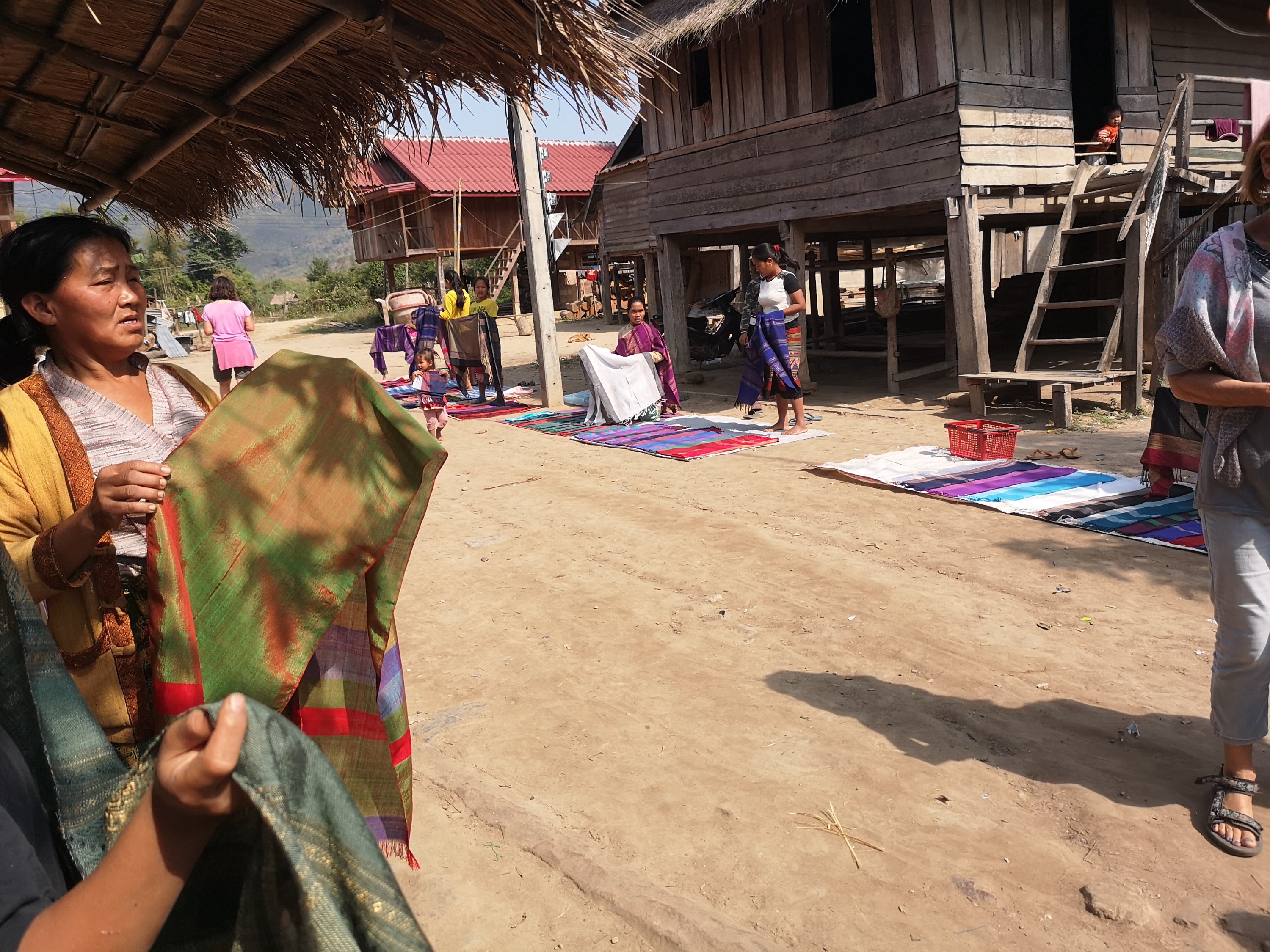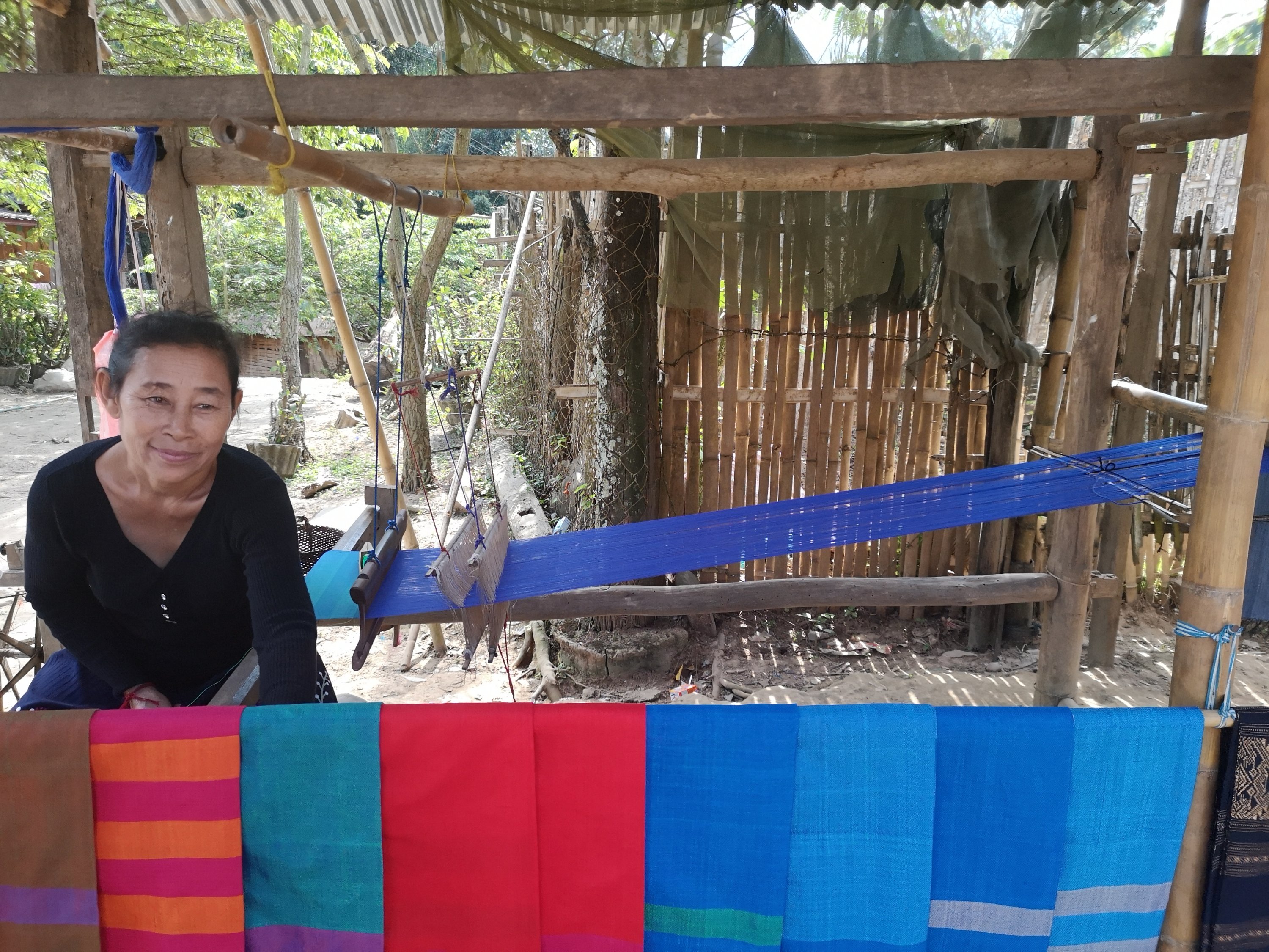 The villagers weave scarves and table runners to sell. It takes 2 days to make one. This is the loom that they use in the background of the first picture.