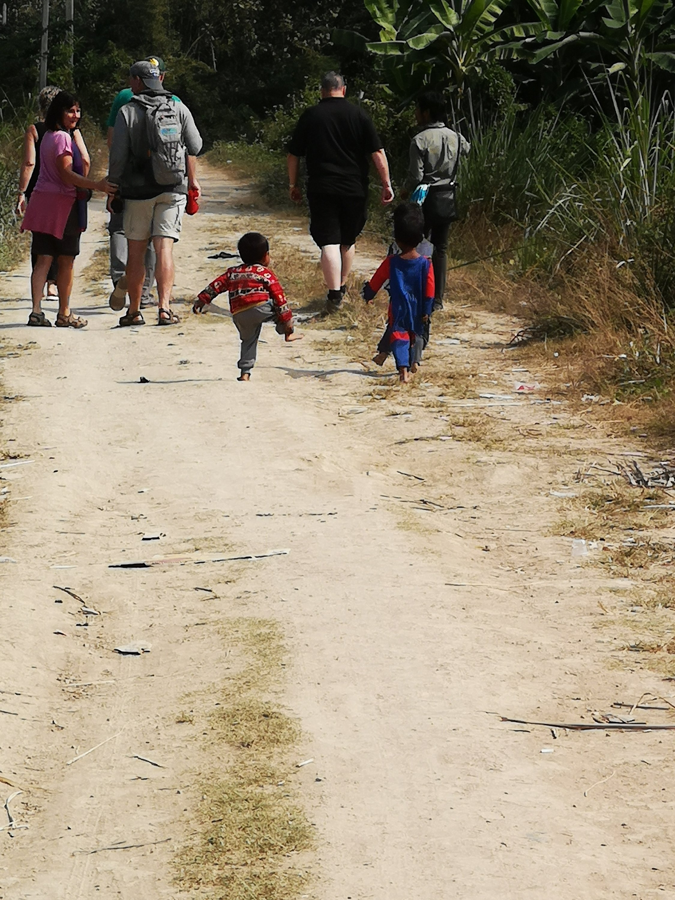 We walked along a path and these cuties followed us. We played games of gotcha, turning around quickly to surprise them and slapping hands. They had superhero shirts on and one had a cape too.