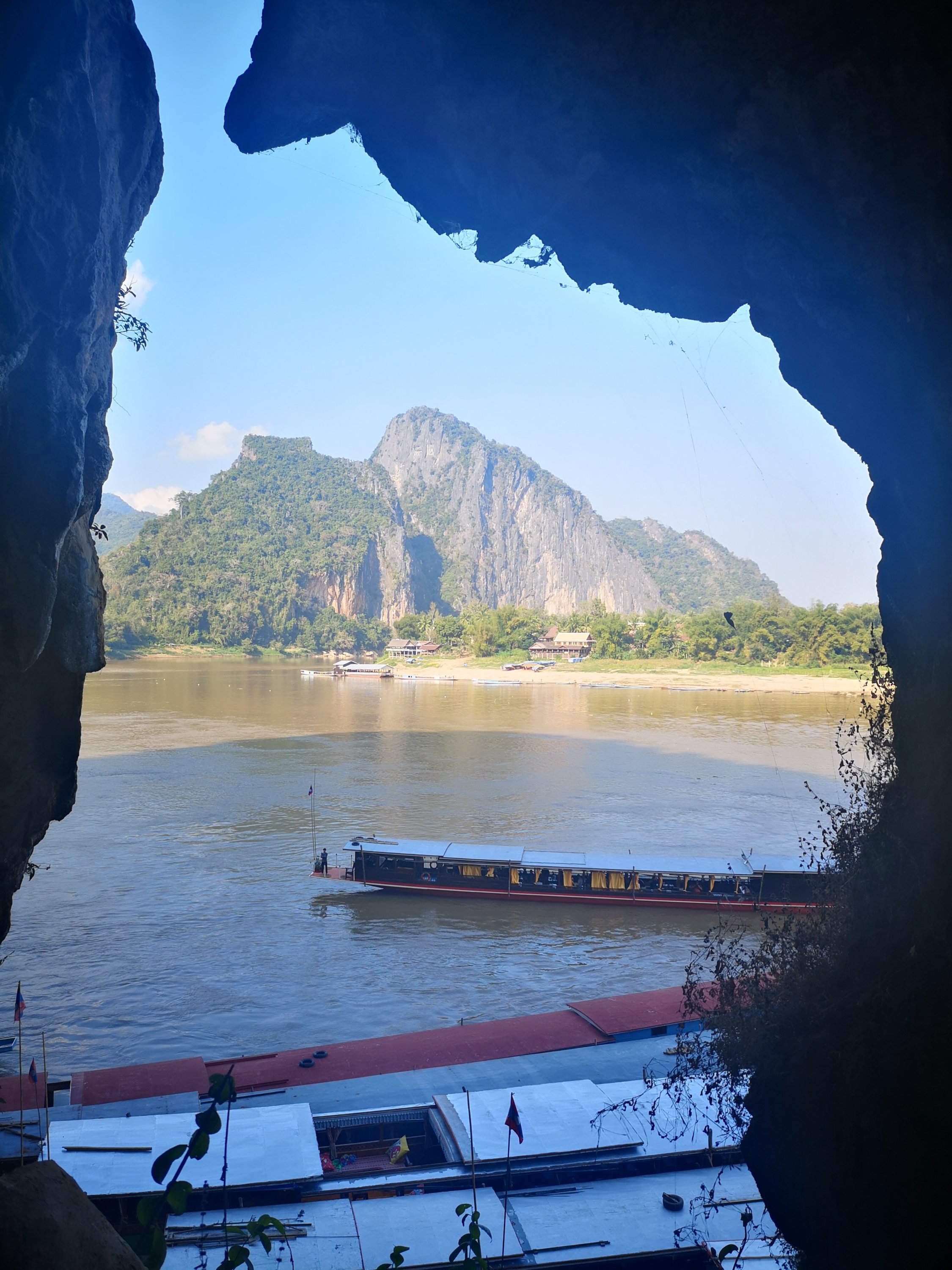 From inside the cave looking out towards the karst formations across the mekong.