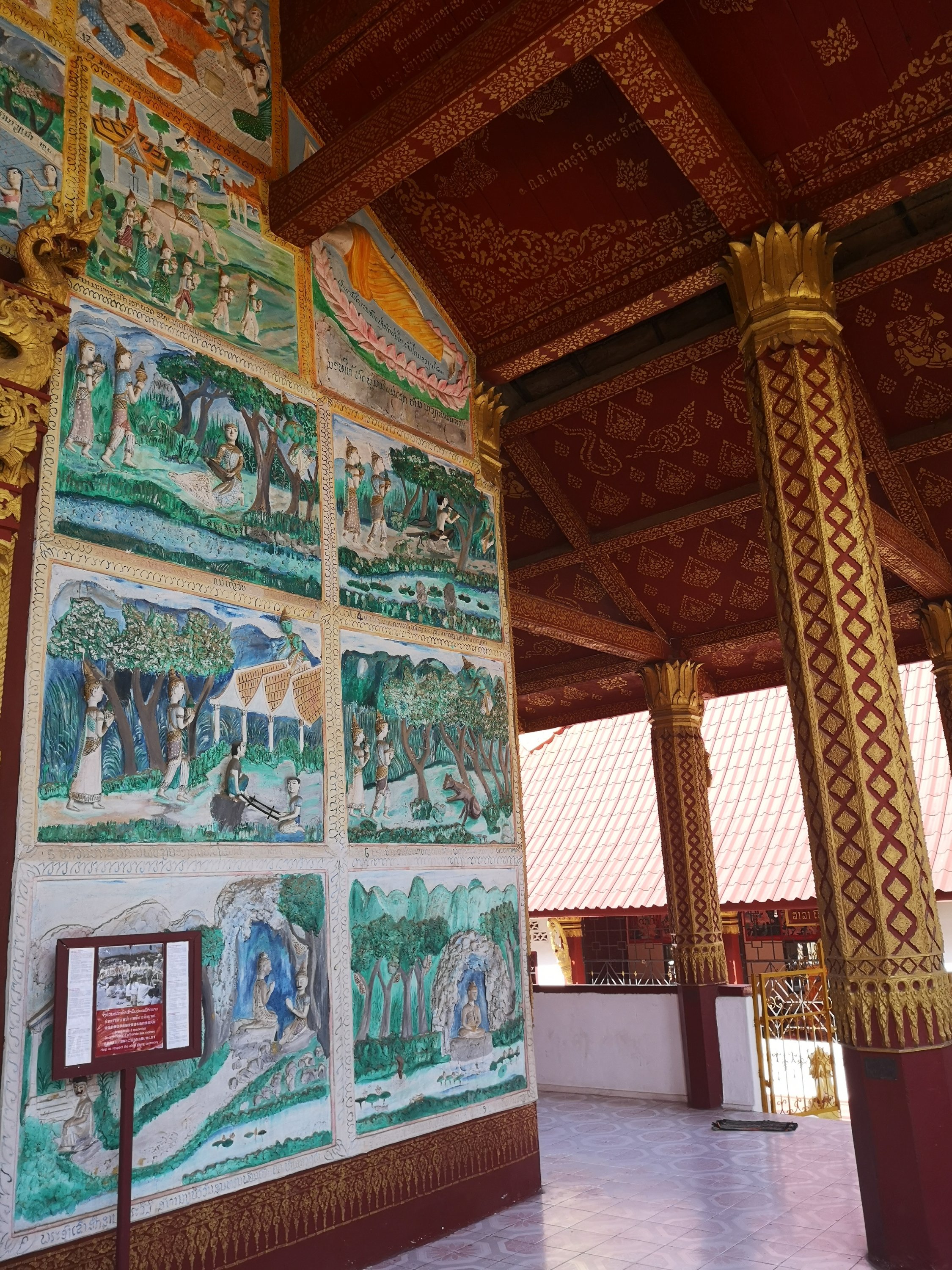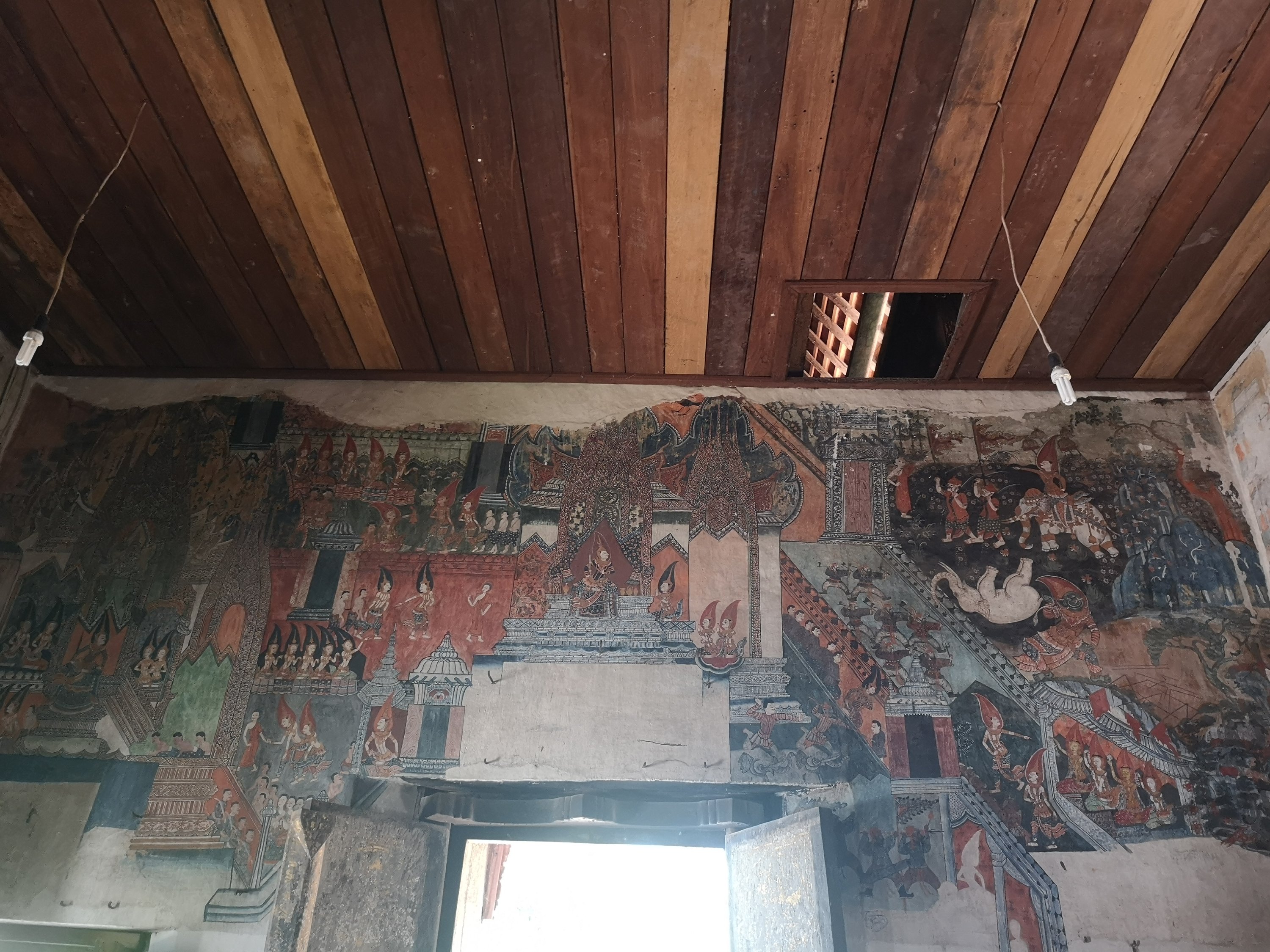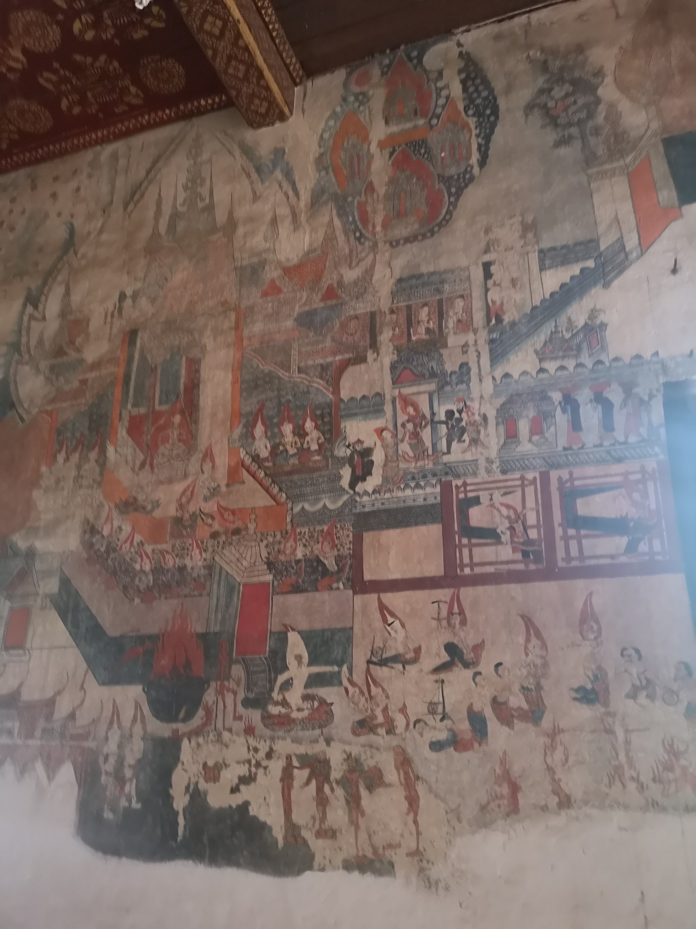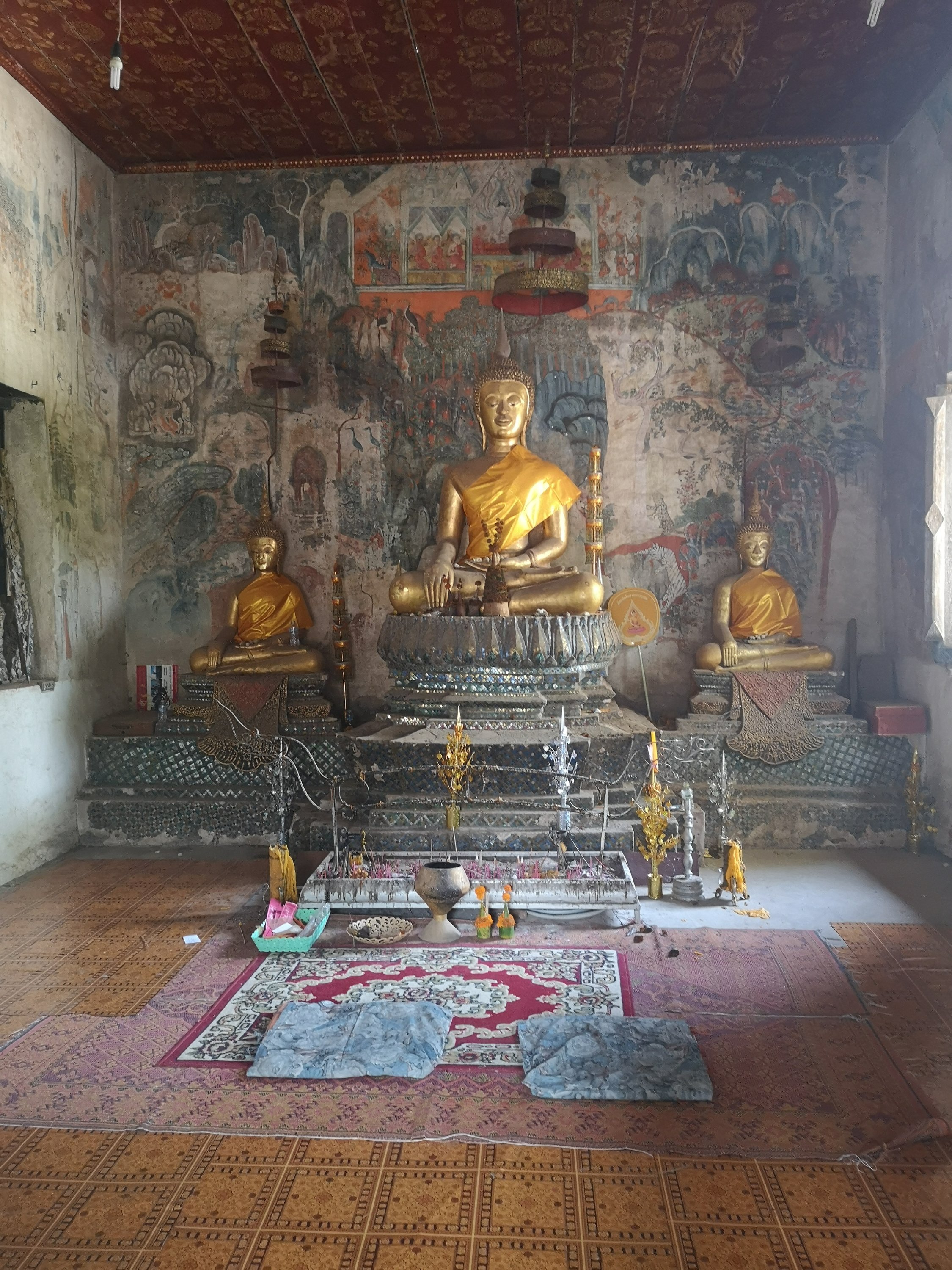 This wat has original 19th-century murals that depict historic scenes along the Mekong River. They chronicle visits by Chinese diplomats and warriors arriving by river or horse and are different than other temples as they show day to day living and not pictures of the story of the life of Buddha or other religious paintings.