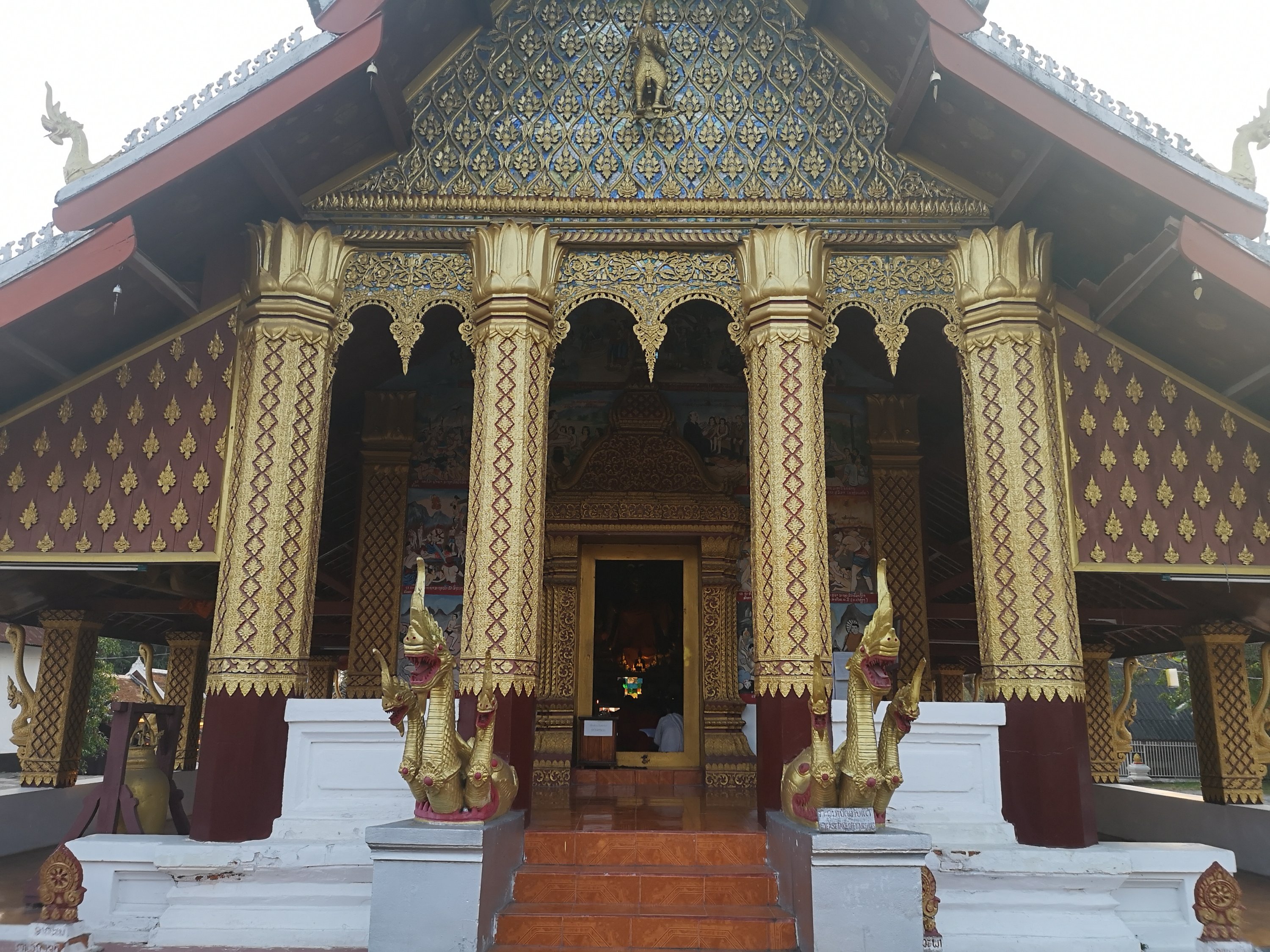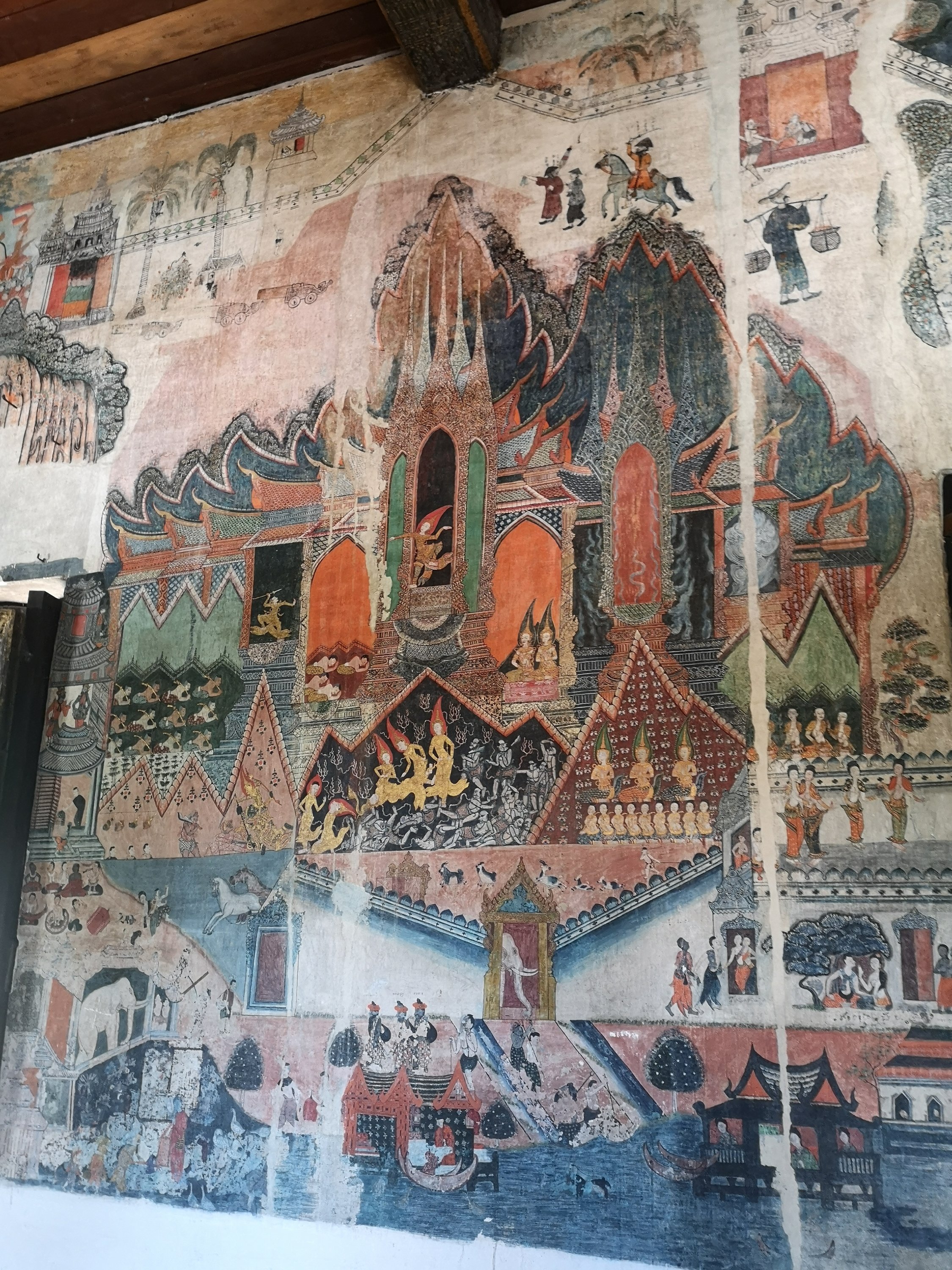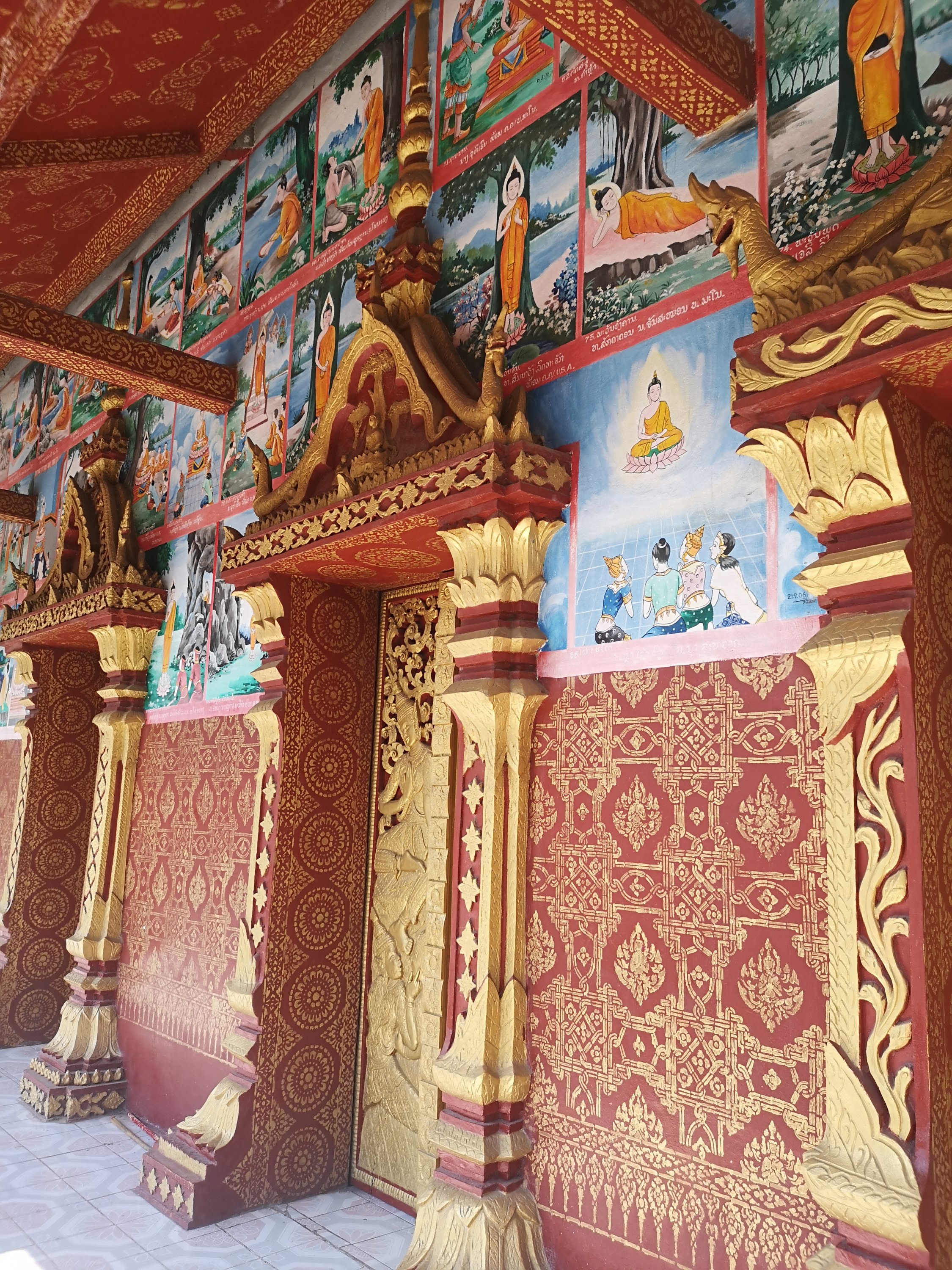 This wat has original 19th-century murals that depict historic scenes along the Mekong River. They chronicle visits by Chinese diplomats and warriors arriving by river or horse and are different than other temples as they show day to day living and not pictures of the story of the life of Buddha or other religious paintings.