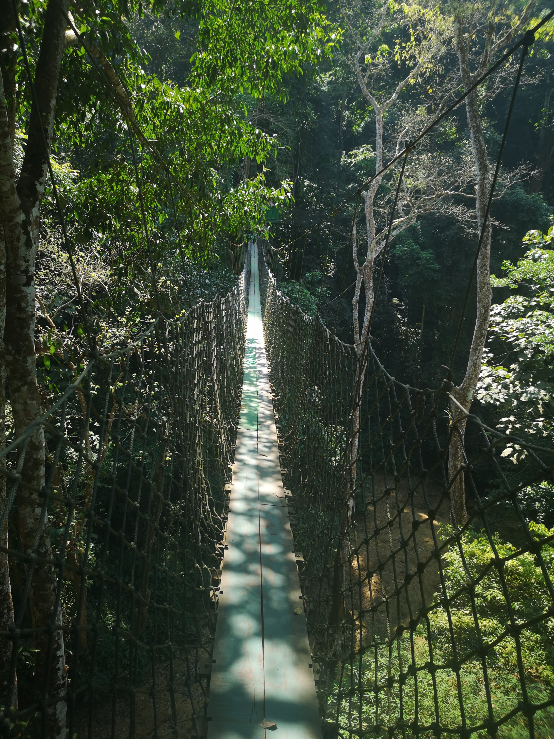 A bridge that goes between the trees in the jungle.