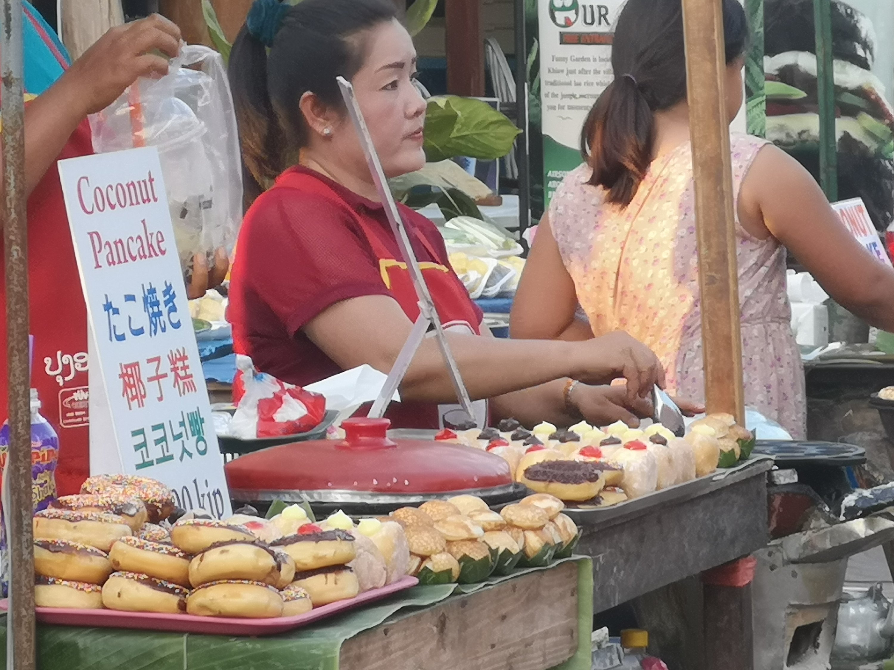 The coconut pancakes are so good. You are served them in a banana leaf. They are the small pancakes next to those big donuts.