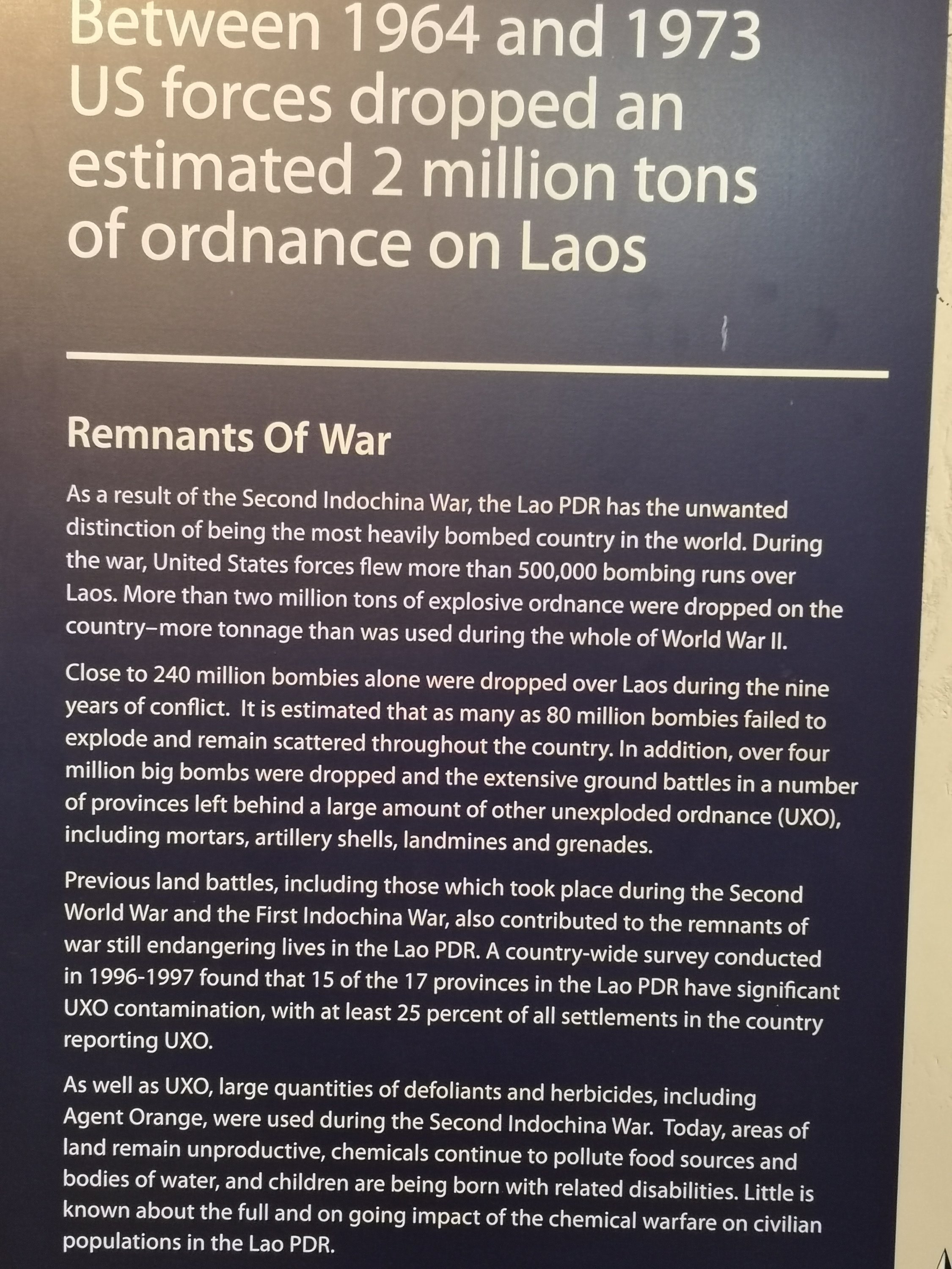 Laos was the most bombed country per capita during the Vietnam War, also known as the 2nd Indochina war. Primarily the bombing was to cut off supply lines for the north Vietnamese.