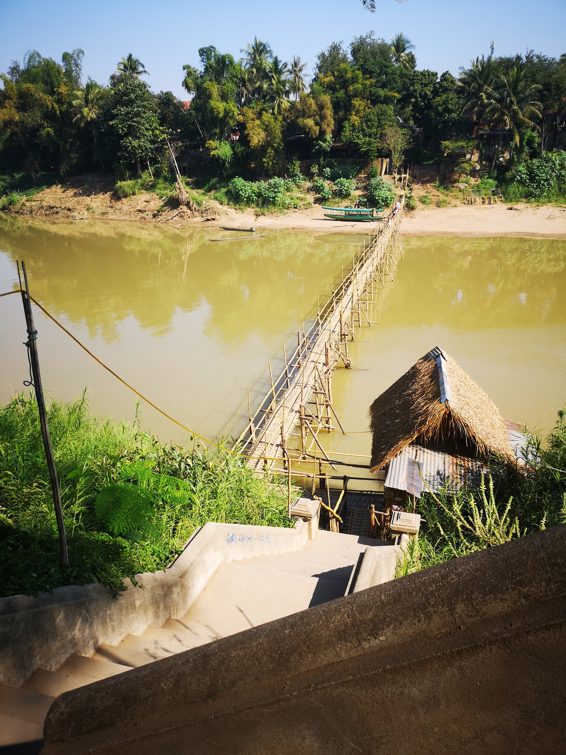 The way across the Nam Khan River is a bamboo bridge. There are boats that get you across and there is a bridge and roadway, but what is the fun in that?