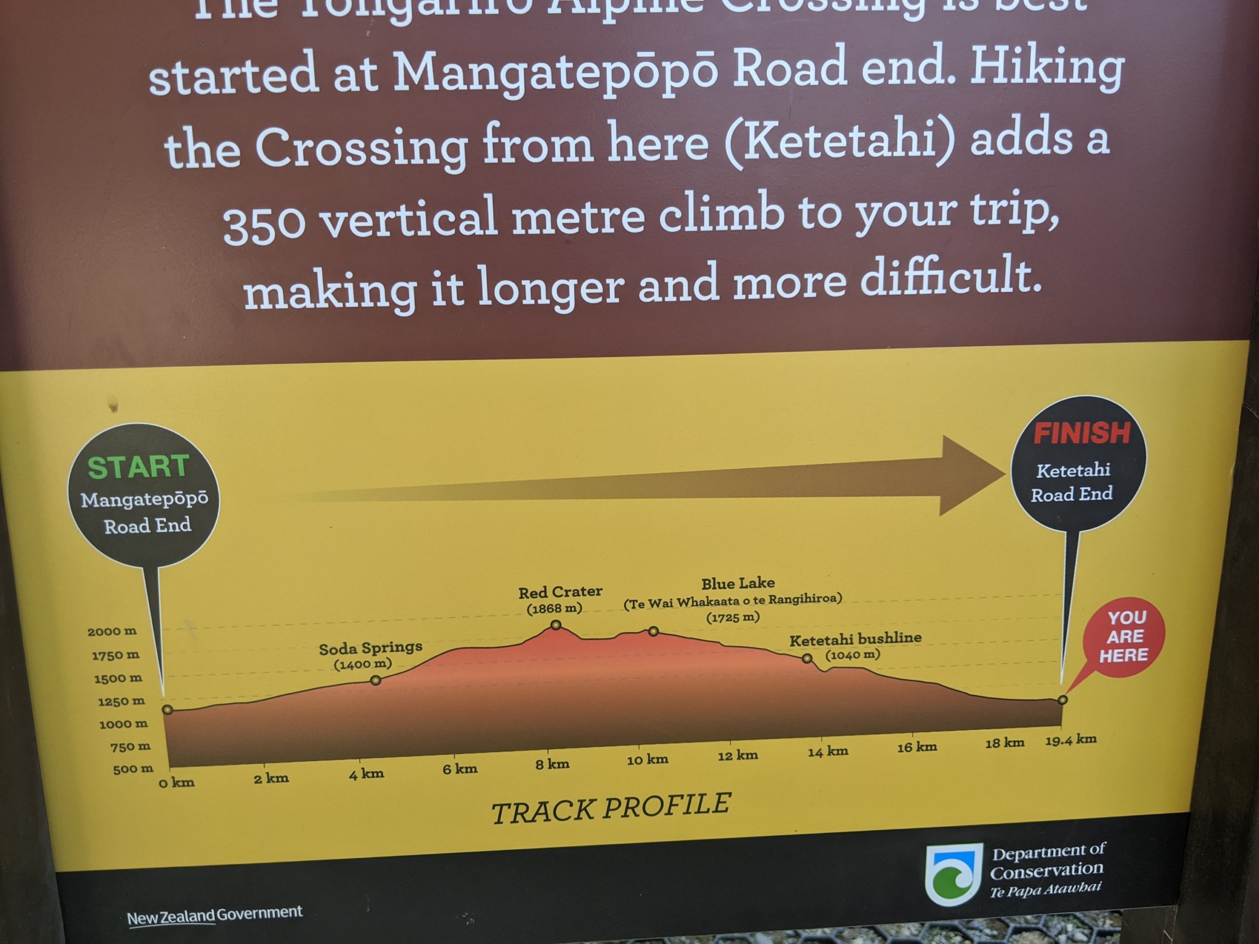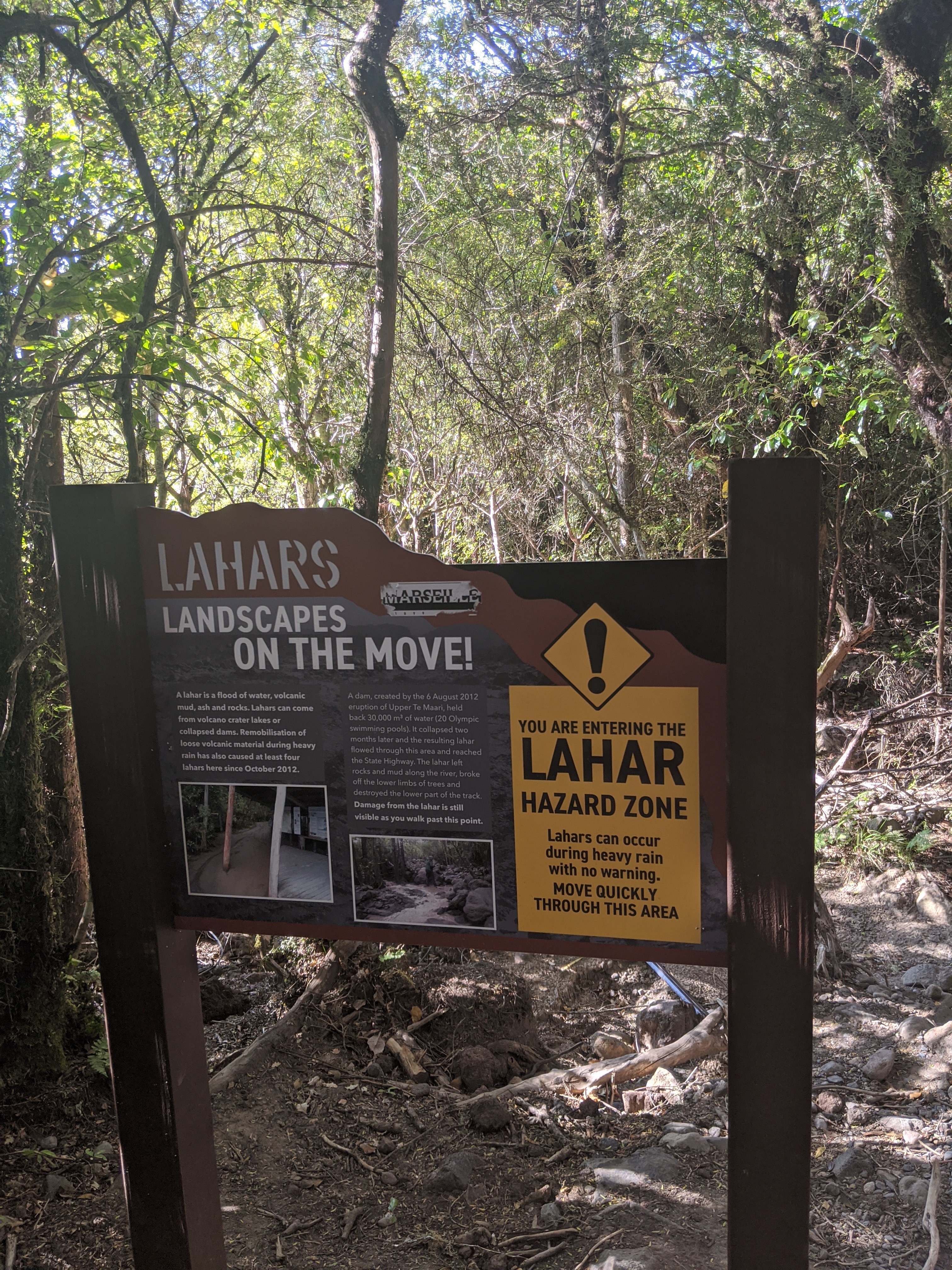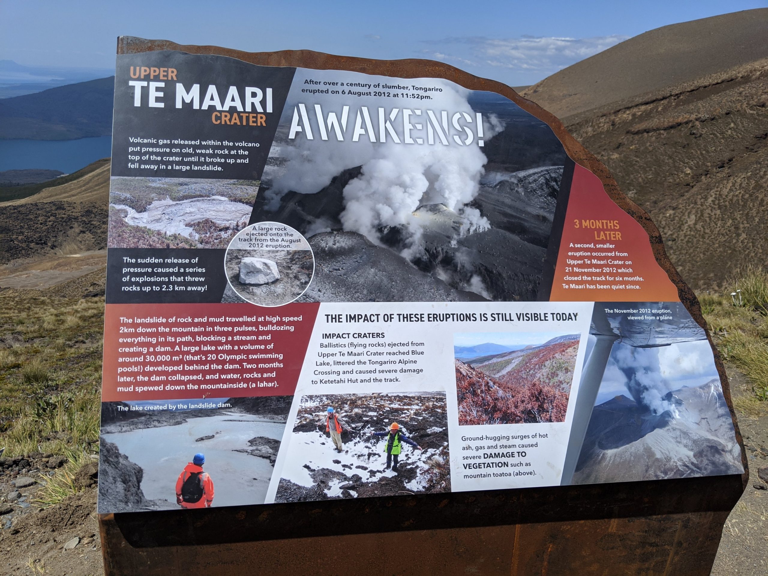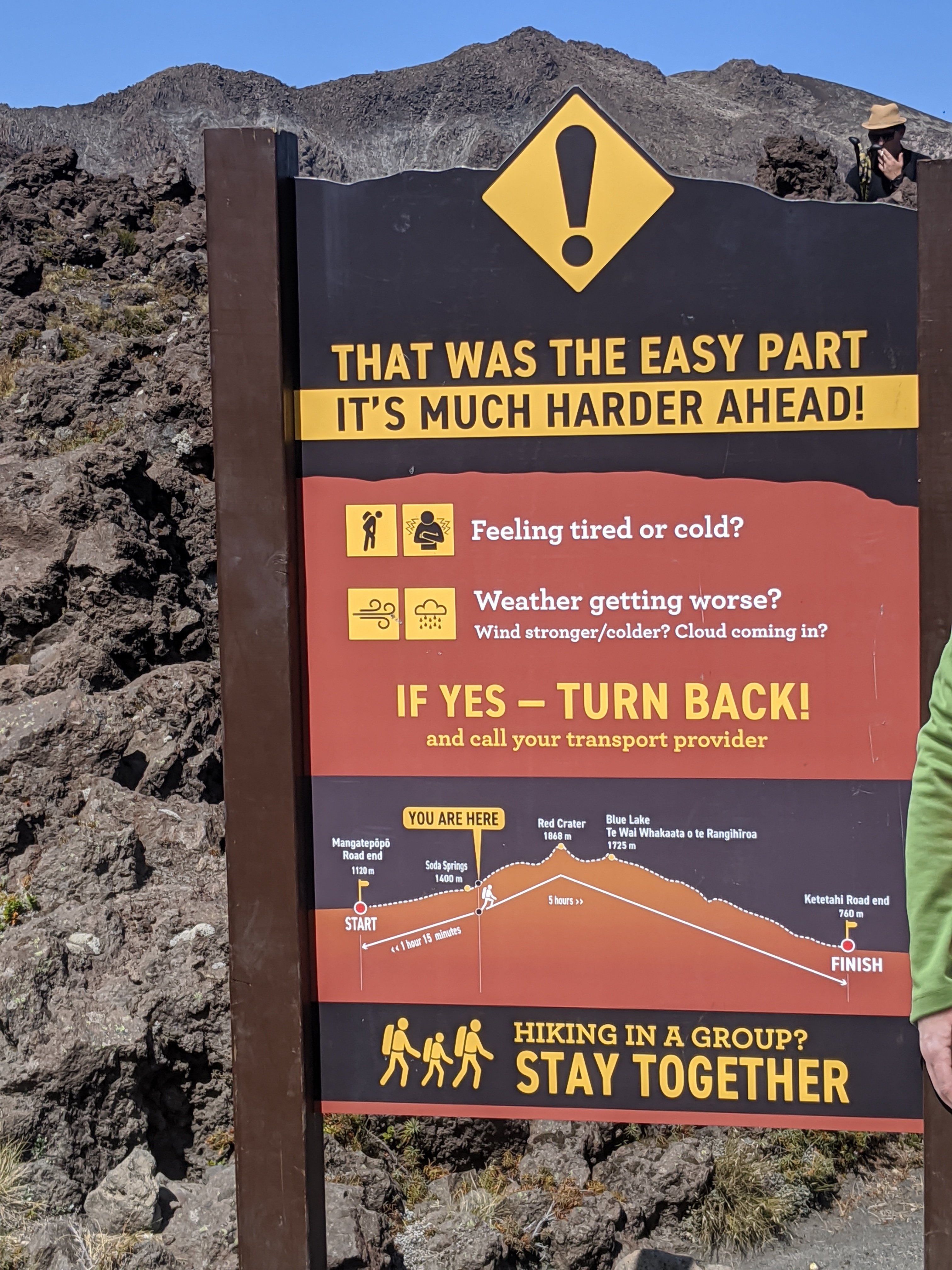 Central crater. Dark area is lava flow from an eruption 300 years ago. We now traveled around this crater and are now on the North side.Blue lake. This is opposite the central crater.Occasionally there are signs that tell you how far you have come and how far you have left to go. We are 2/3 through this hike. The worst is behind us.Lake Taupo ahead is actually the size of Singapore. There are trees from China near there that have been planted. They take half the time to grow and are used for paper mostly.The fumerole from another angle about 45 minutes later on the trail.A rest hut used to stand near here but in the 2012 eruption a boulder took only 15 seconds to hit the hut. Luckily no one was in it and they never rebuilt it.I like the signs showing progress along the way. From the summit on there is no turning back but before that point there are plenty of cautions and time to change direction and head back.So close to the end. It is all downhill from here and in the shade which is very welcome right now!Lahars are areas that will still get the effects from a volcanic eruption. The landscape here will change and there is danger from debris and gases falling.It was a beautiful walk through this section. Very quiet. You can hear birds singing.Finally I was at the end!How far we traveled to get to the end.