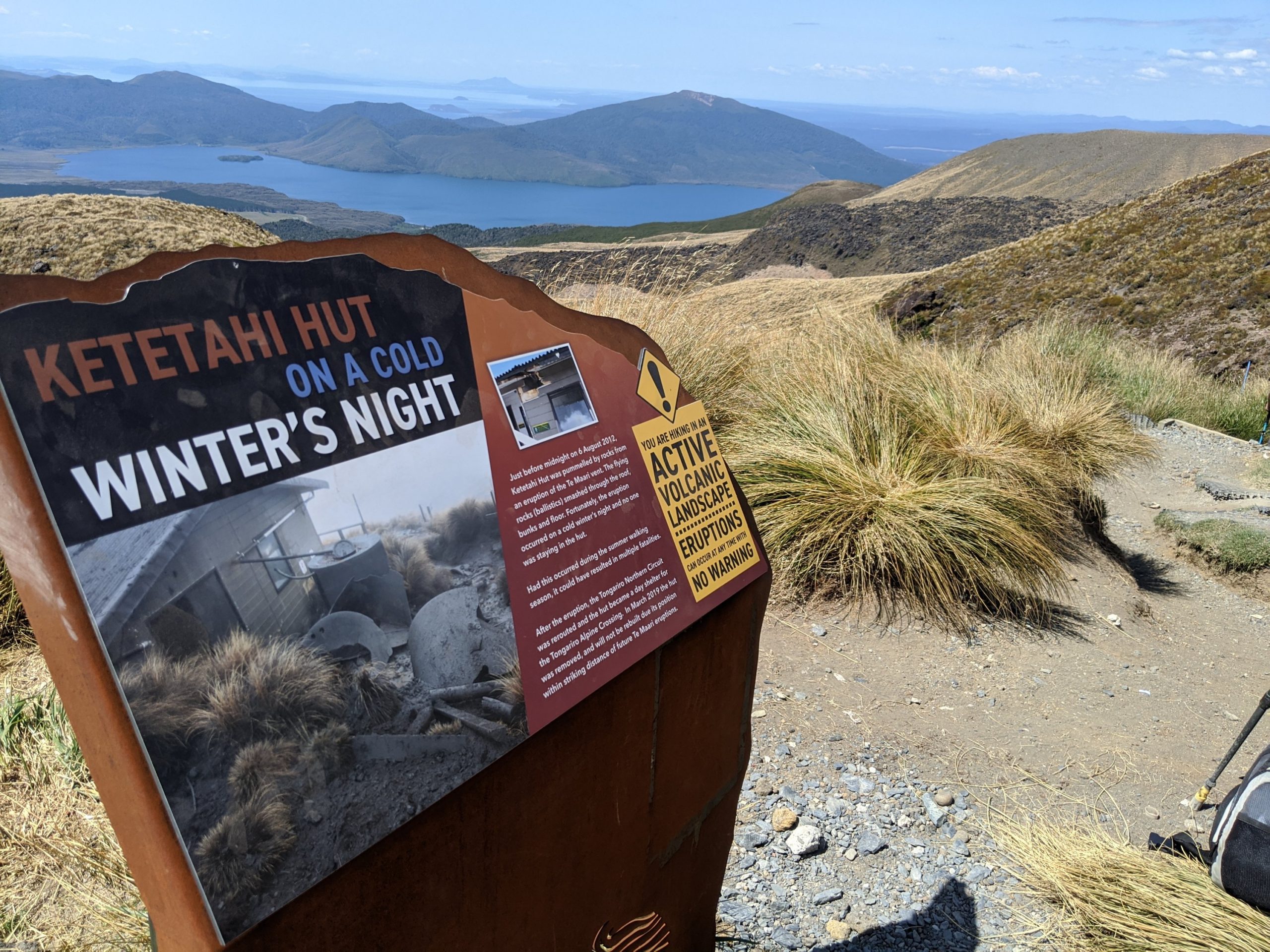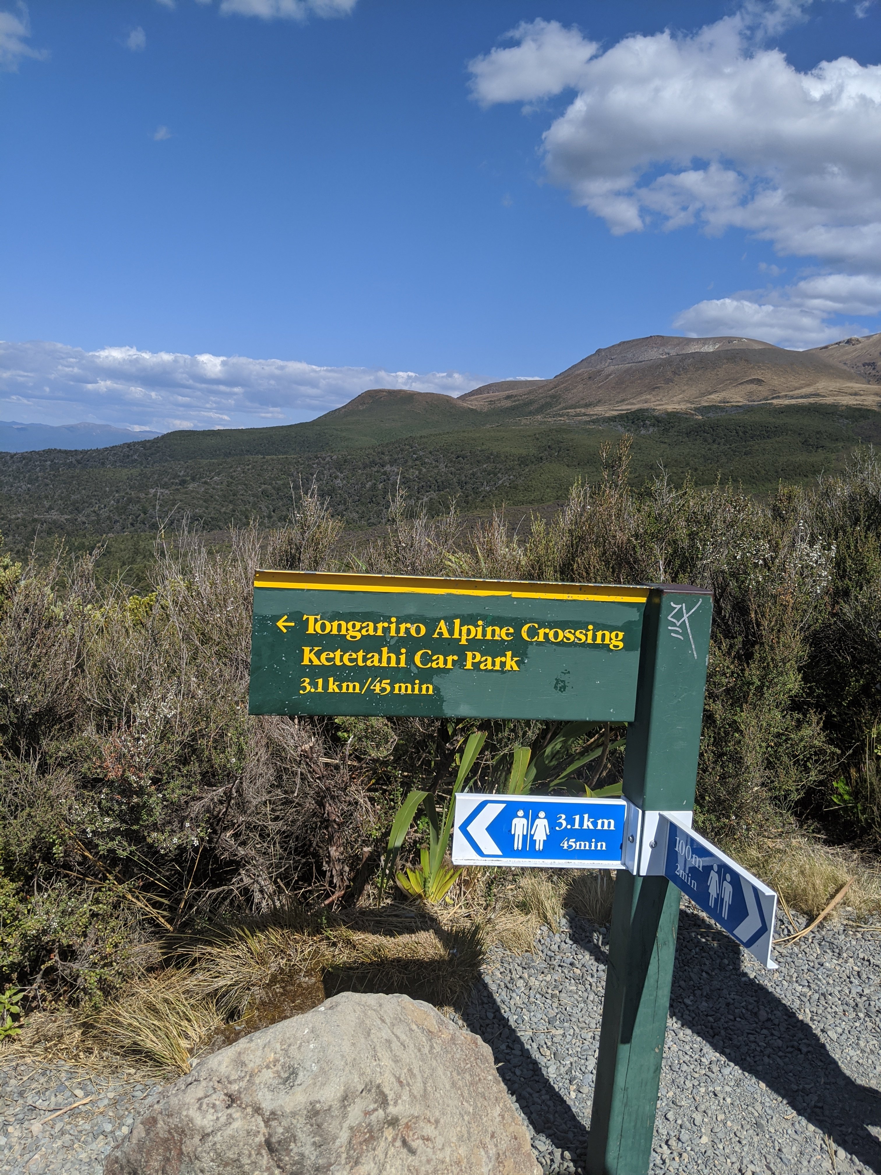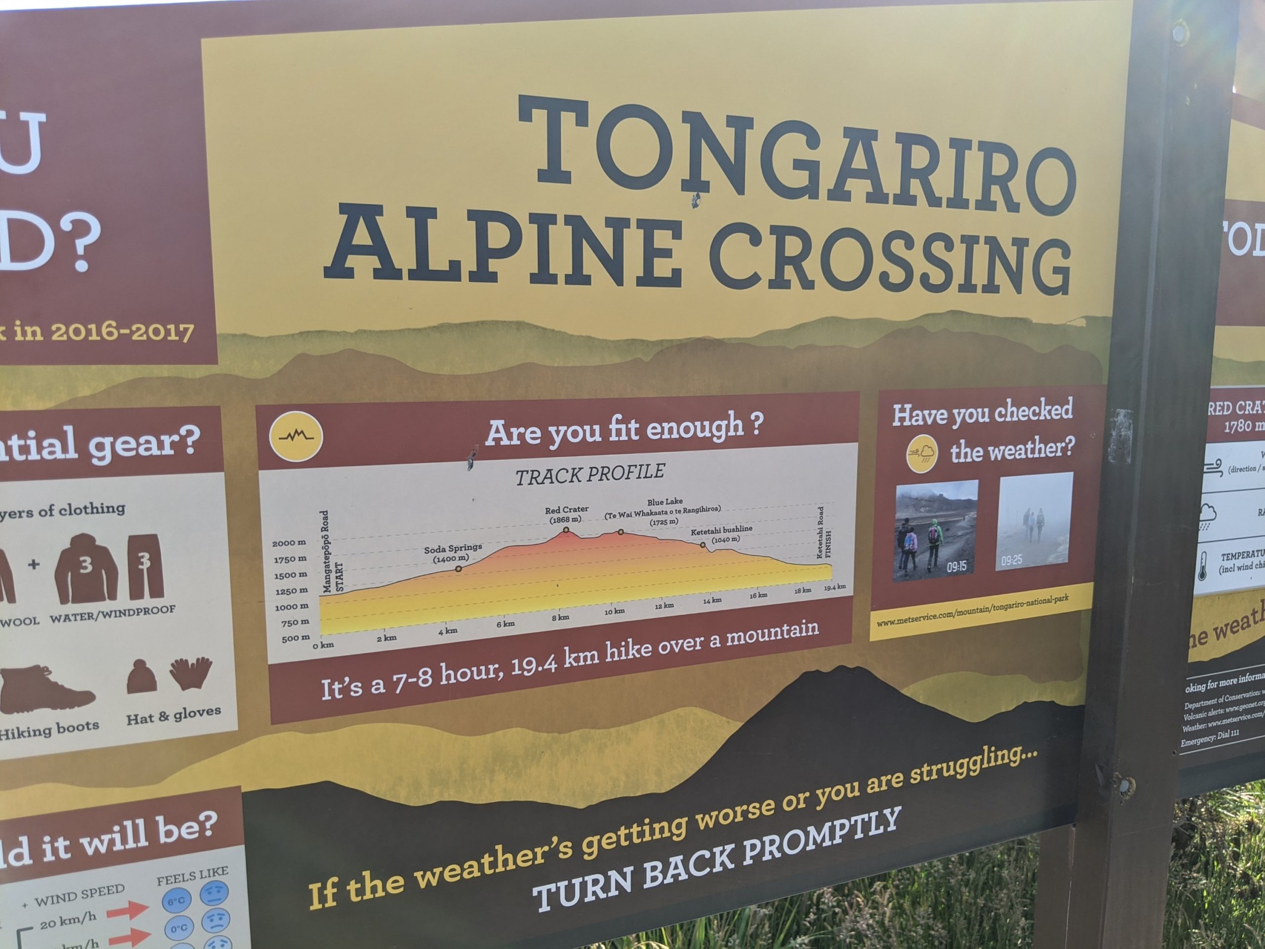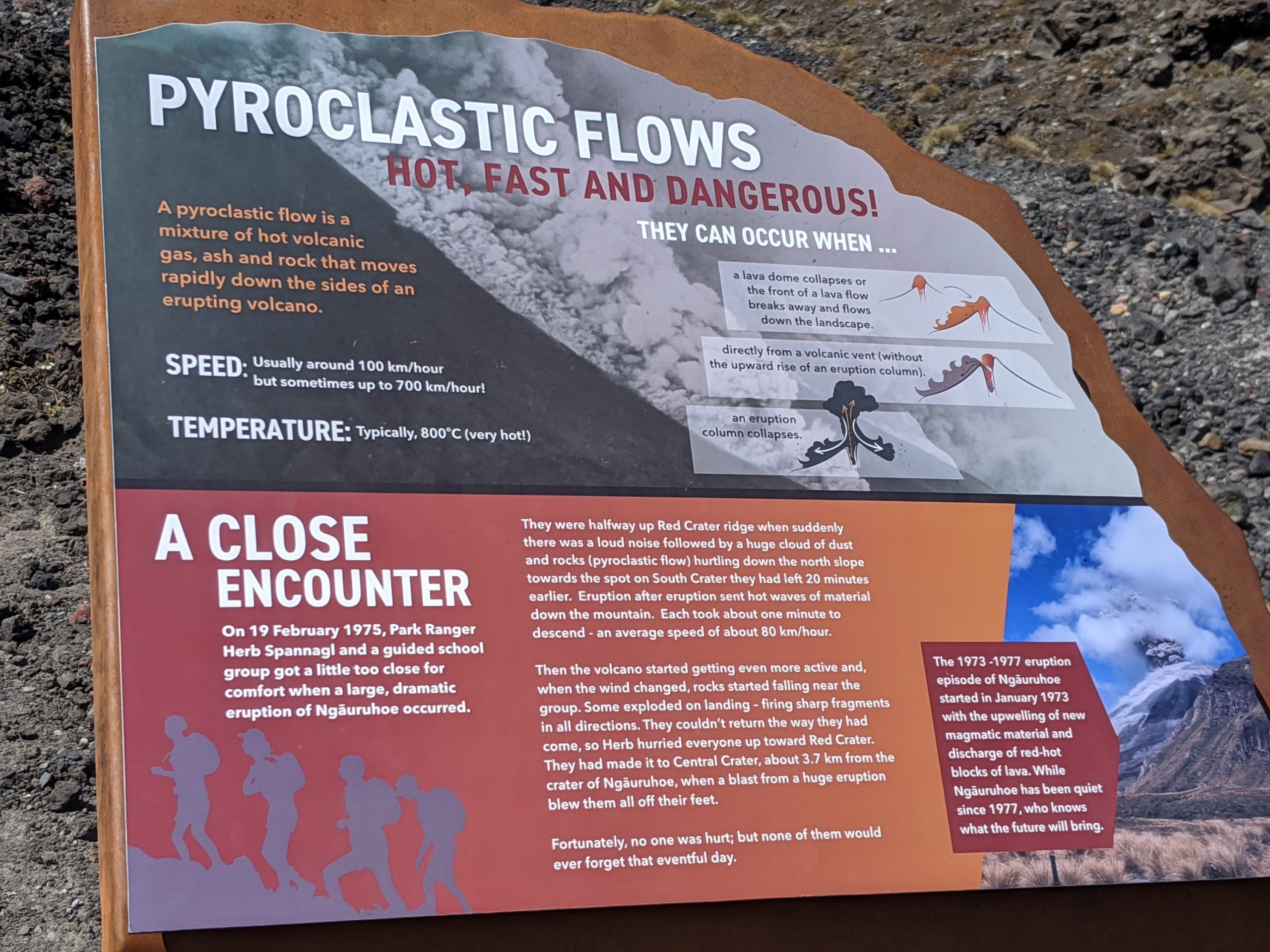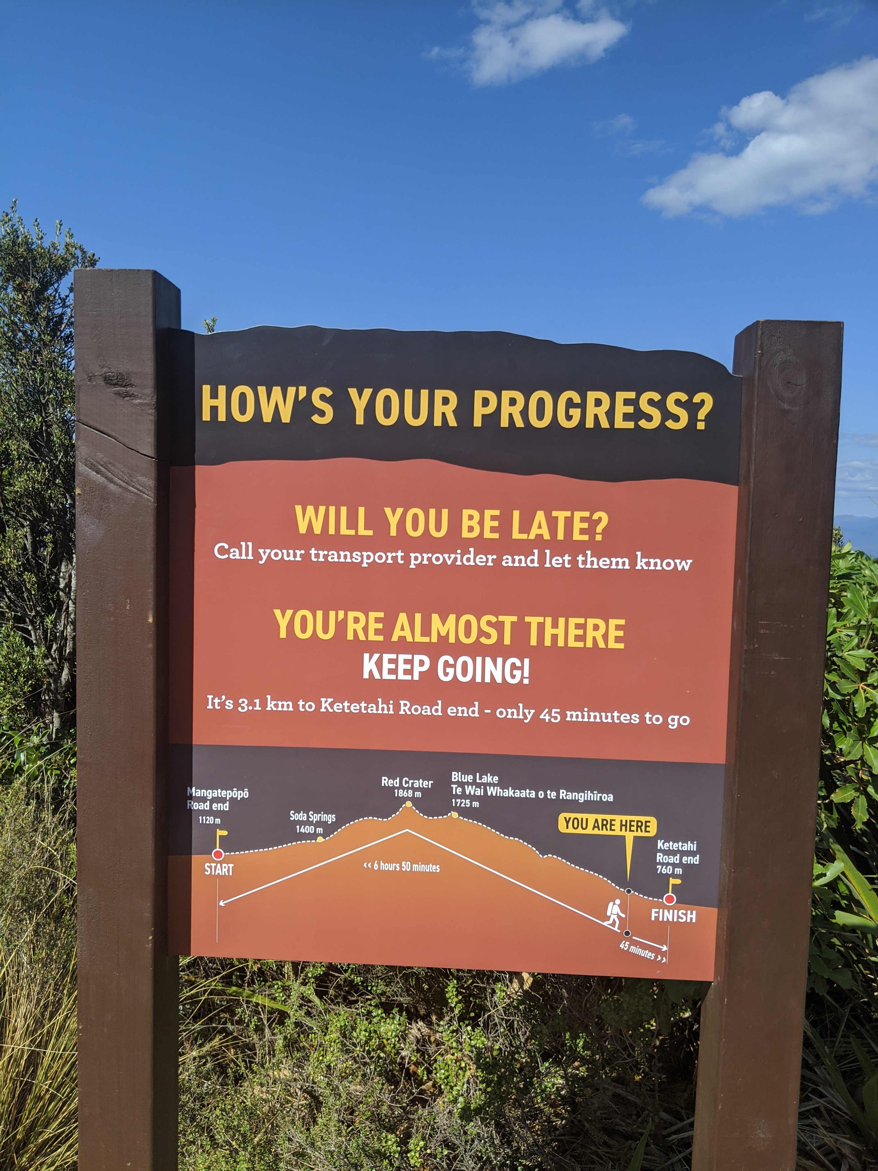Central crater. Dark area is lava flow from an eruption 300 years ago. We now traveled around this crater and are now on the North side.Blue lake. This is opposite the central crater.Occasionally there are signs that tell you how far you have come and how far you have left to go. We are 2/3 through this hike. The worst is behind us.Lake Taupo ahead is actually the size of Singapore. There are trees from China near there that have been planted. They take half the time to grow and are used for paper mostly.The fumerole from another angle about 45 minutes later on the trail.A rest hut used to stand near here but in the 2012 eruption a boulder took only 15 seconds to hit the hut. Luckily no one was in it and they never rebuilt it.I like the signs showing progress along the way. From the summit on there is no turning back but before that point there are plenty of cautions and time to change direction and head back.So close to the end. It is all downhill from here and in the shade which is very welcome right now!Lahars are areas that will still get the effects from a volcanic eruption. The landscape here will change and there is danger from debris and gases falling.It was a beautiful walk through this section. Very quiet. You can hear birds singing.Finally I was at the end!How far we traveled to get to the end.