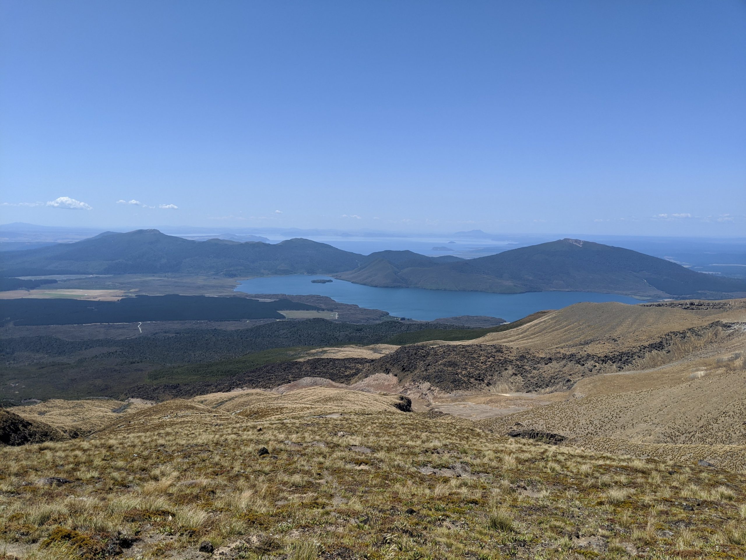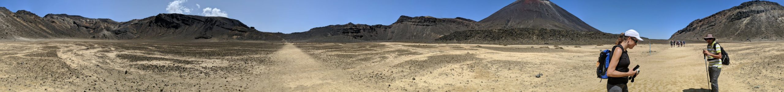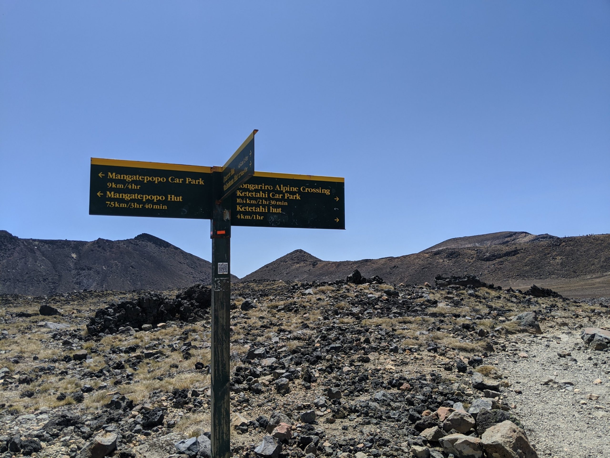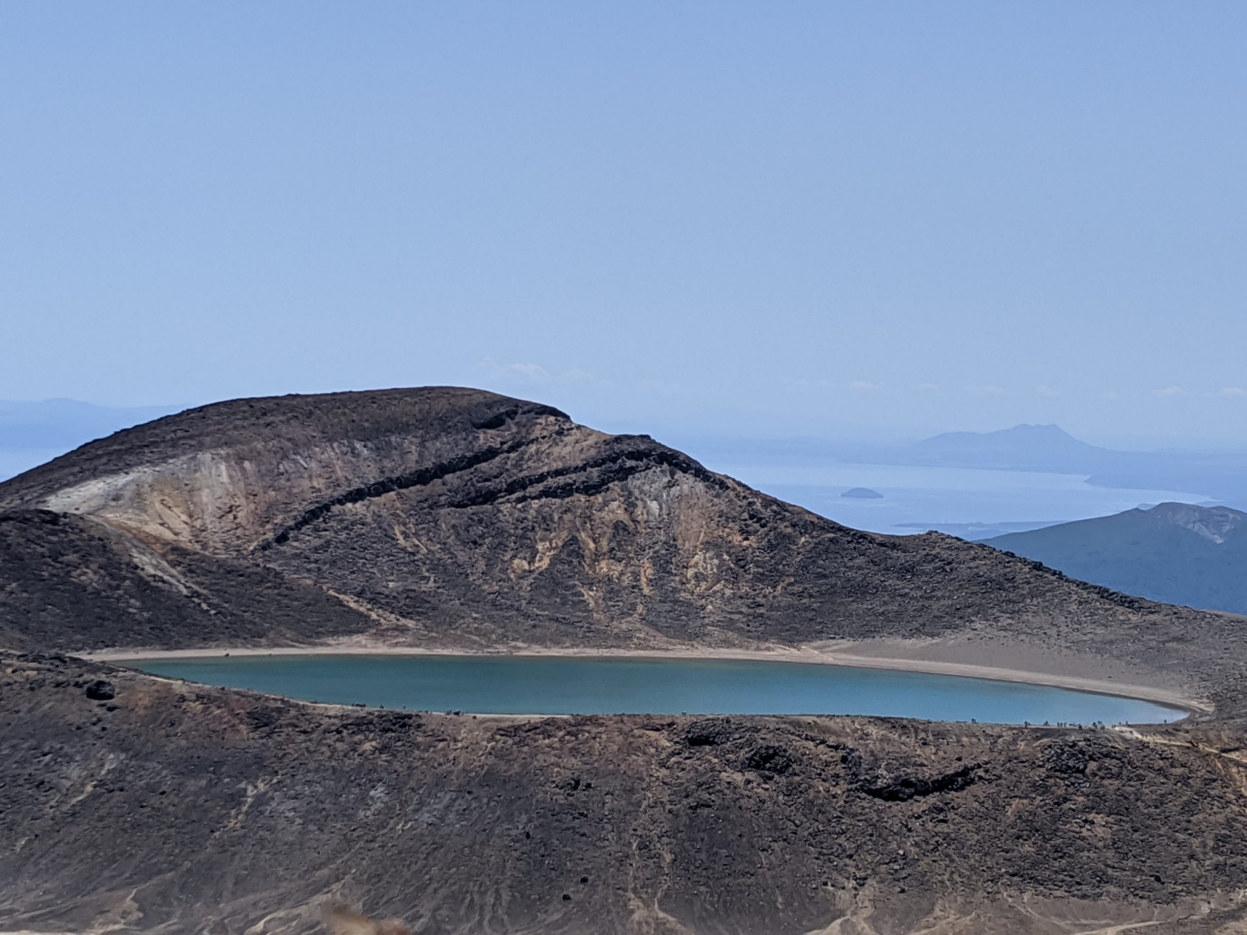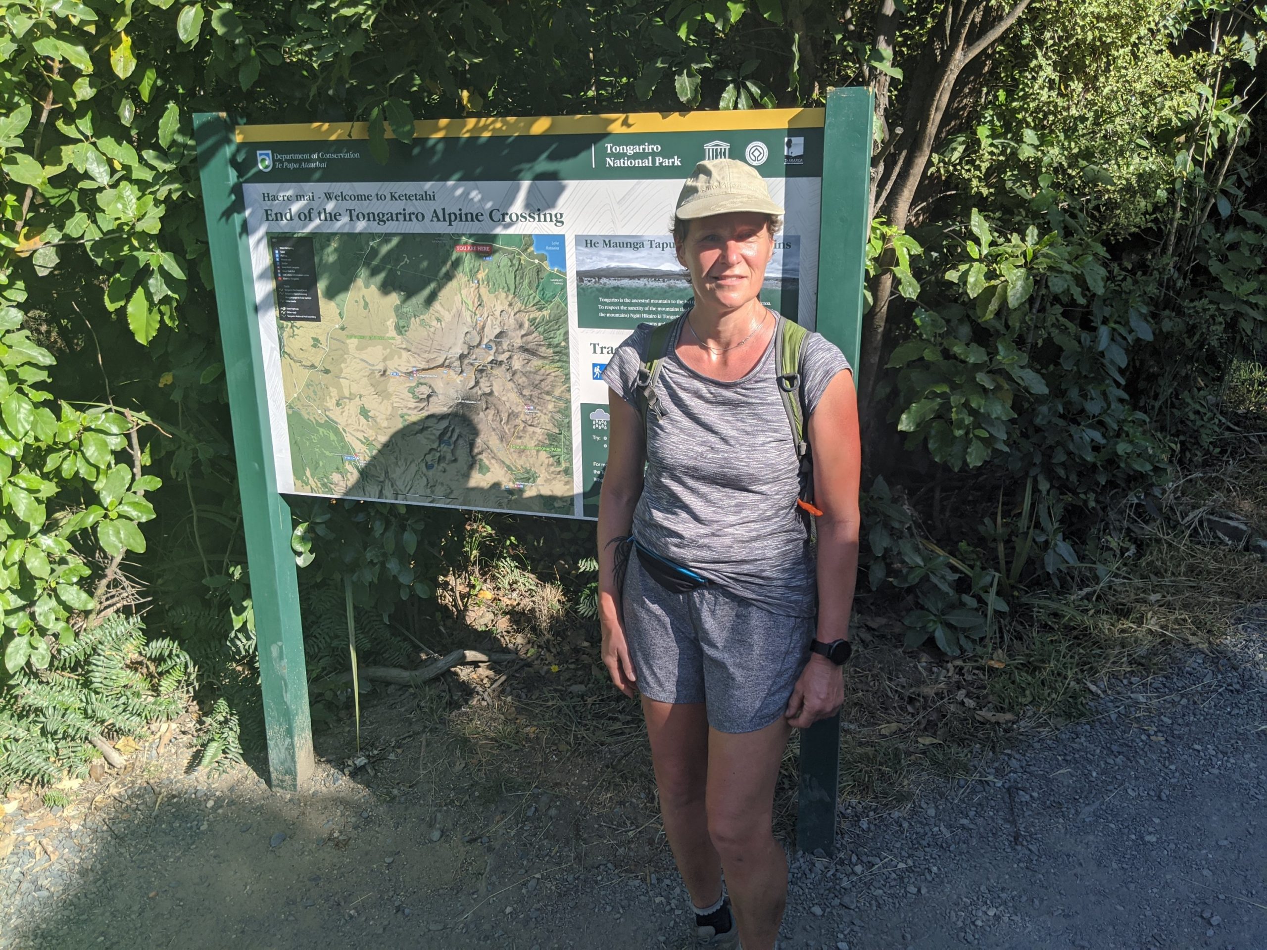 Central crater. Dark area is lava flow from an eruption 300 years ago. We now traveled around this crater and are now on the North side.Blue lake. This is opposite the central crater.Occasionally there are signs that tell you how far you have come and how far you have left to go. We are 2/3 through this hike. The worst is behind us.Lake Taupo ahead is actually the size of Singapore. There are trees from China near there that have been planted. They take half the time to grow and are used for paper mostly.The fumerole from another angle about 45 minutes later on the trail.A rest hut used to stand near here but in the 2012 eruption a boulder took only 15 seconds to hit the hut. Luckily no one was in it and they never rebuilt it.I like the signs showing progress along the way. From the summit on there is no turning back but before that point there are plenty of cautions and time to change direction and head back.So close to the end. It is all downhill from here and in the shade which is very welcome right now!Lahars are areas that will still get the effects from a volcanic eruption. The landscape here will change and there is danger from debris and gases falling.It was a beautiful walk through this section. Very quiet. You can hear birds singing.Finally I was at the end!How far we traveled to get to the end.