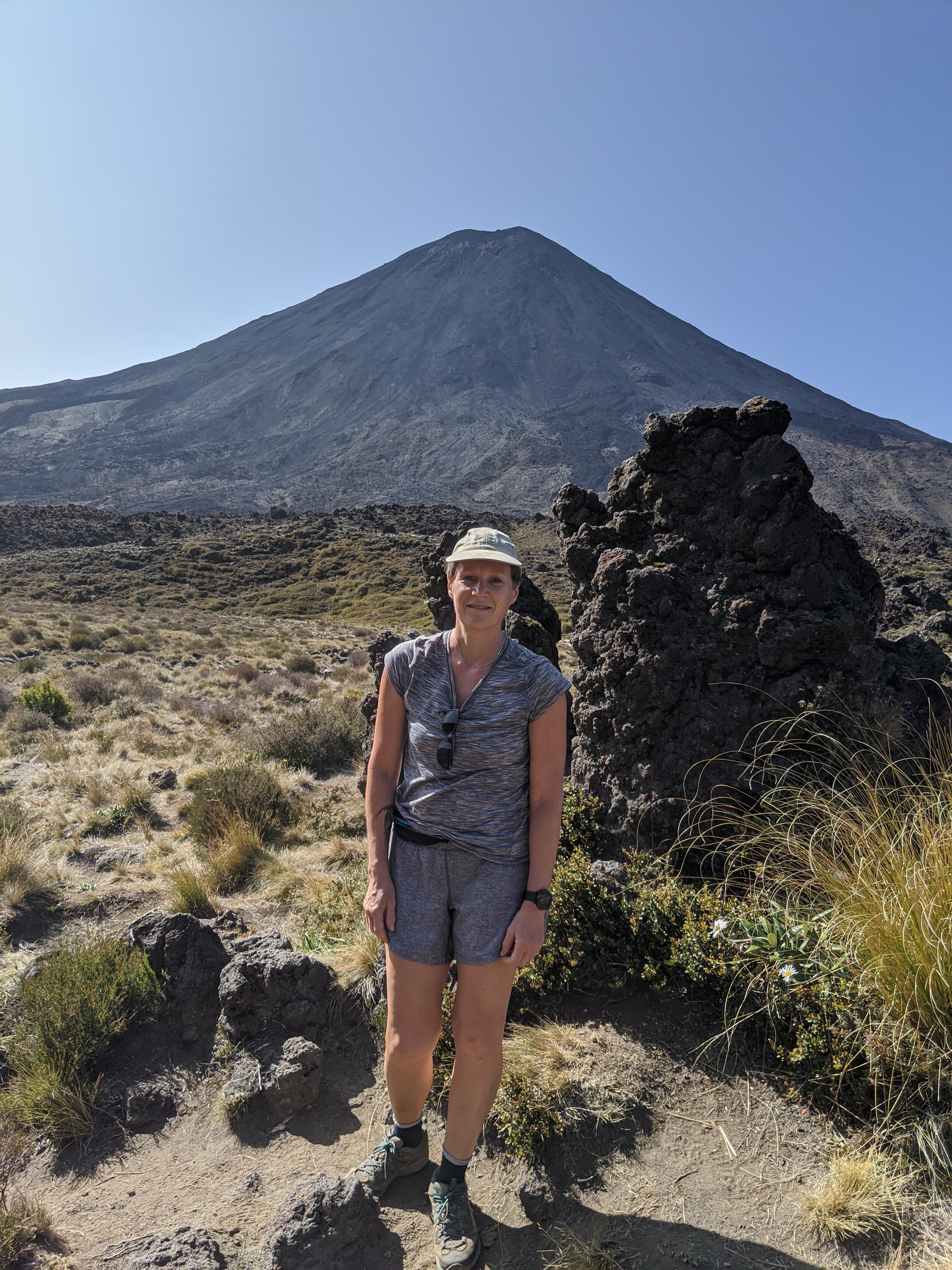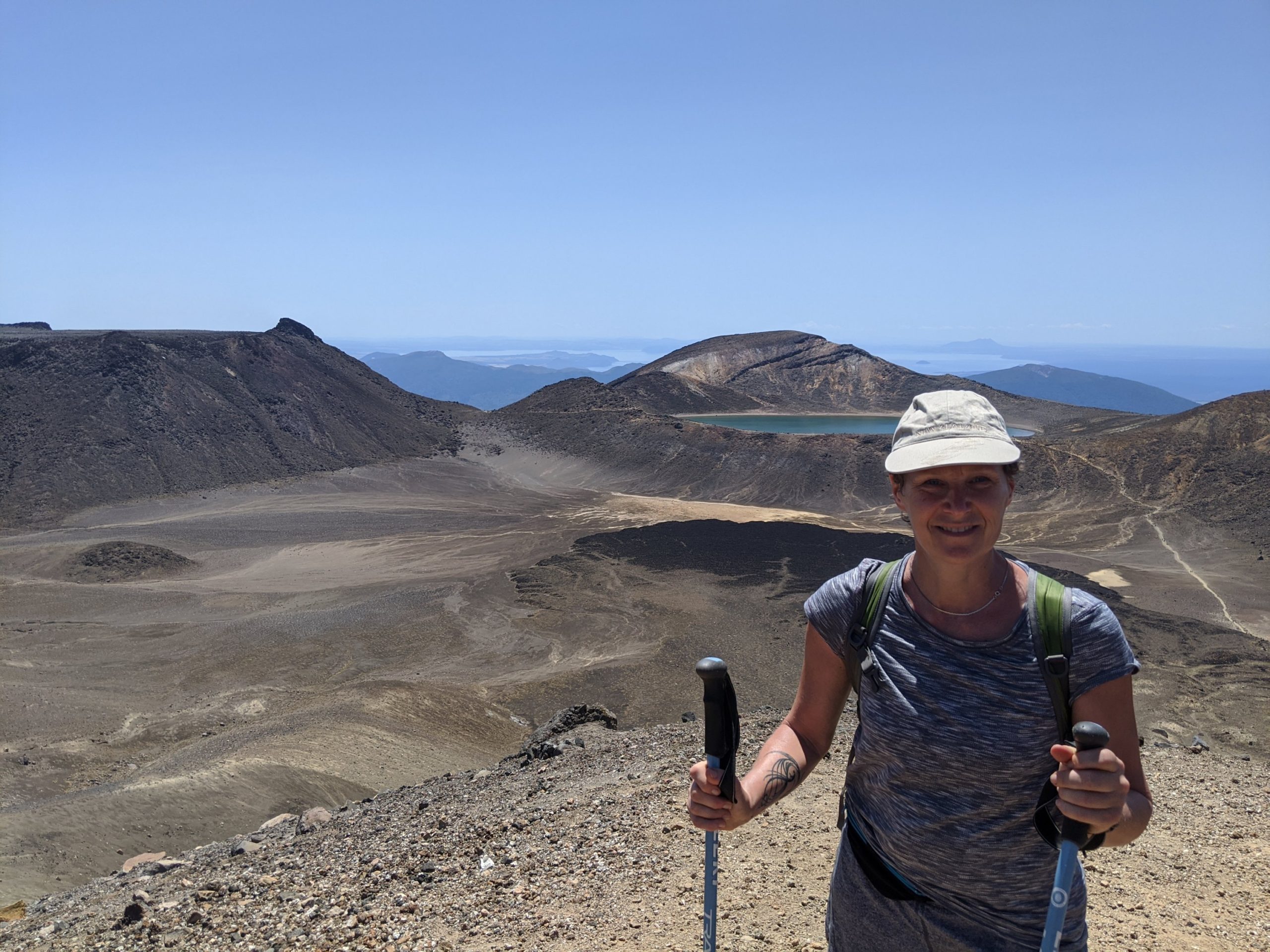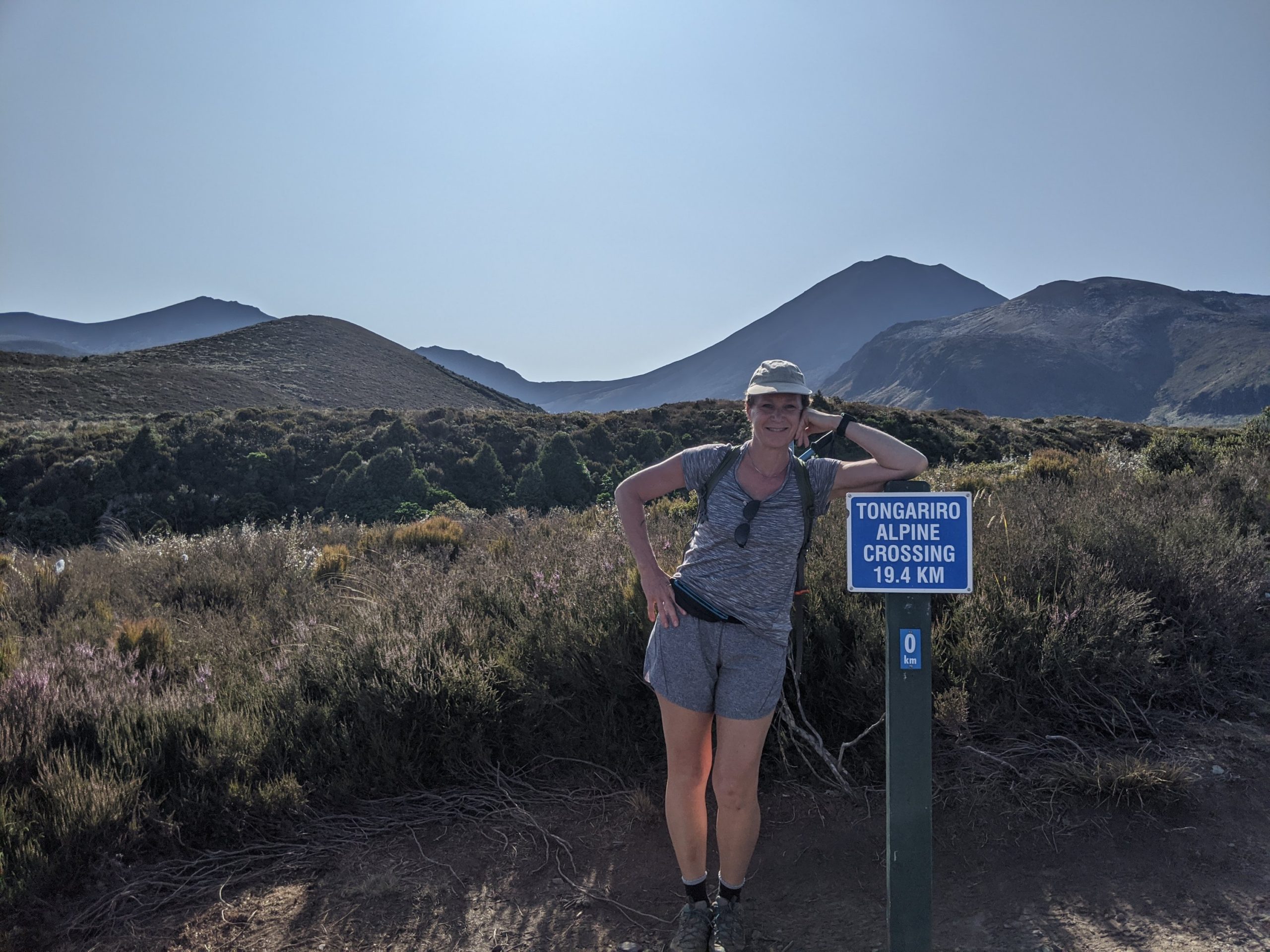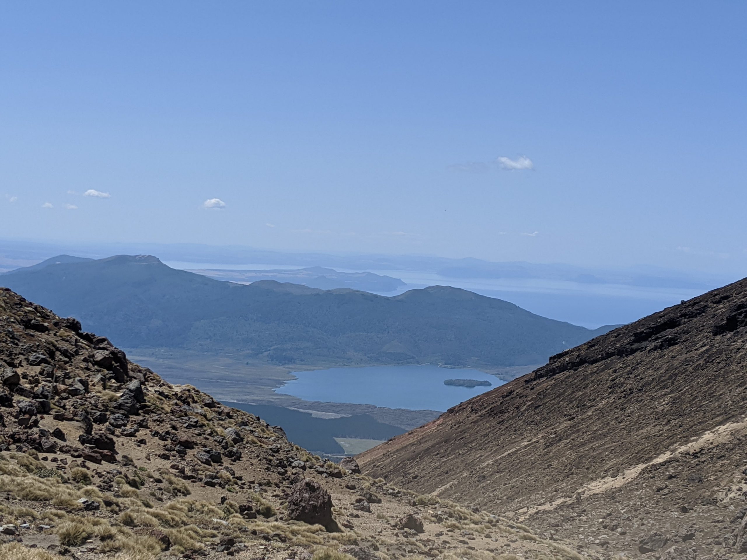 Central crater. Dark area is lava flow from an eruption 300 years ago. We now traveled around this crater and are now on the North side.Blue lake. This is opposite the central crater.Occasionally there are signs that tell you how far you have come and how far you have left to go. We are 2/3 through this hike. The worst is behind us.Lake Taupo ahead is actually the size of Singapore. There are trees from China near there that have been planted. They take half the time to grow and are used for paper mostly.The fumerole from another angle about 45 minutes later on the trail.A rest hut used to stand near here but in the 2012 eruption a boulder took only 15 seconds to hit the hut. Luckily no one was in it and they never rebuilt it.I like the signs showing progress along the way. From the summit on there is no turning back but before that point there are plenty of cautions and time to change direction and head back.So close to the end. It is all downhill from here and in the shade which is very welcome right now!Lahars are areas that will still get the effects from a volcanic eruption. The landscape here will change and there is danger from debris and gases falling.It was a beautiful walk through this section. Very quiet. You can hear birds singing.Finally I was at the end!How far we traveled to get to the end.