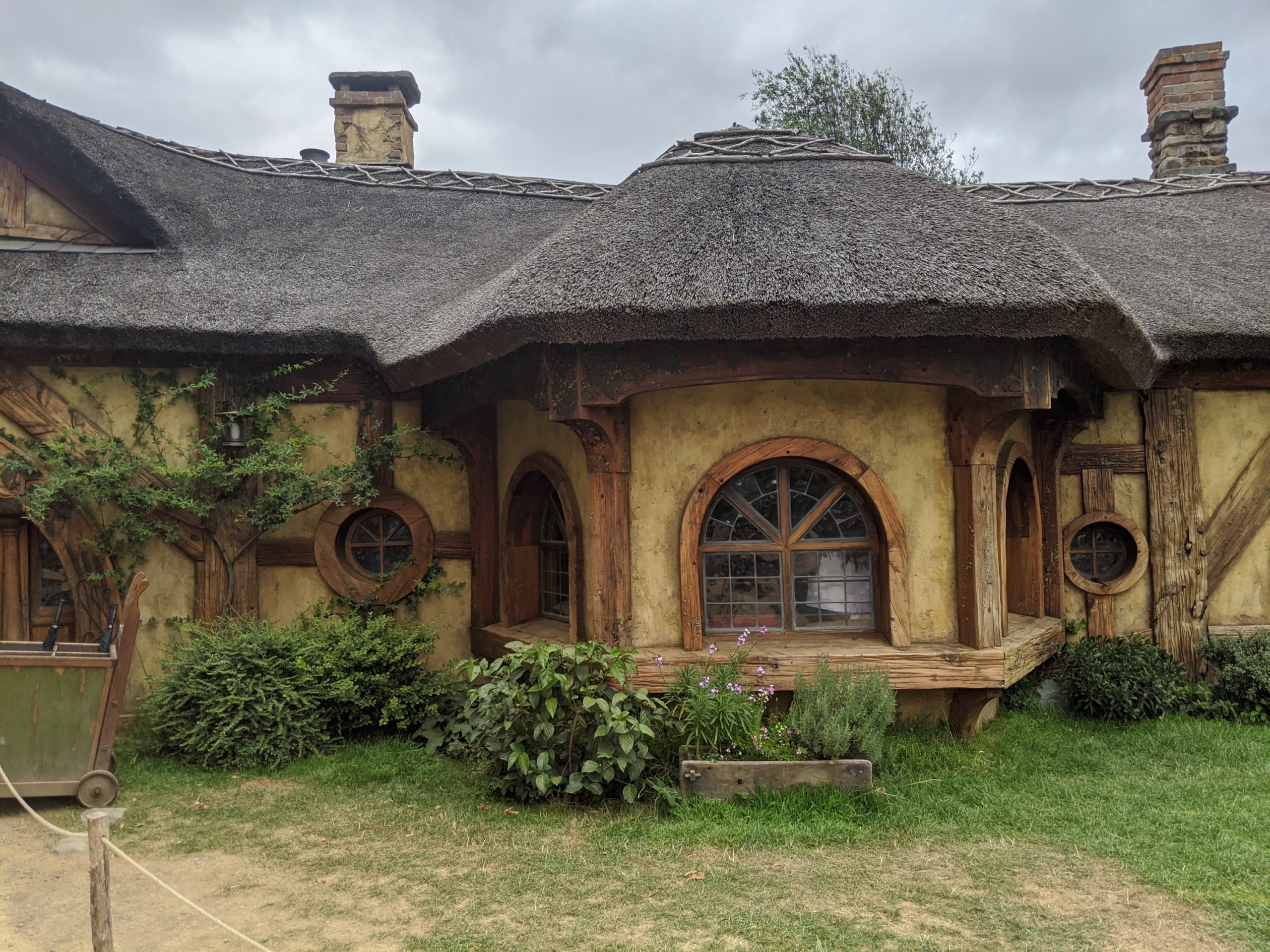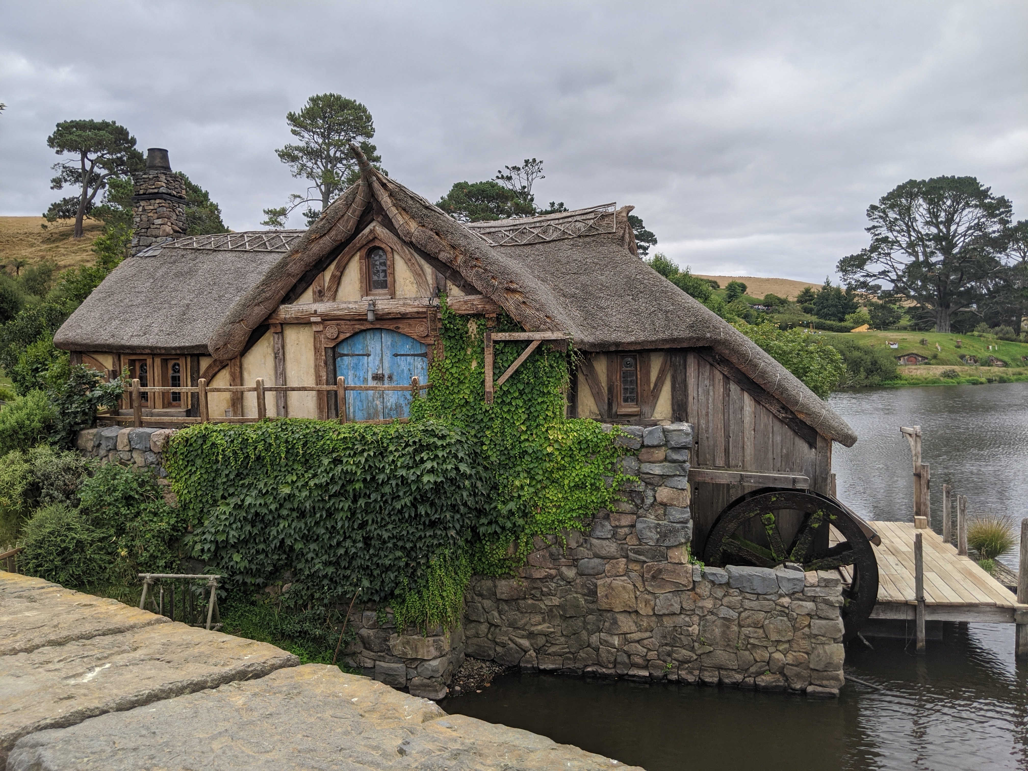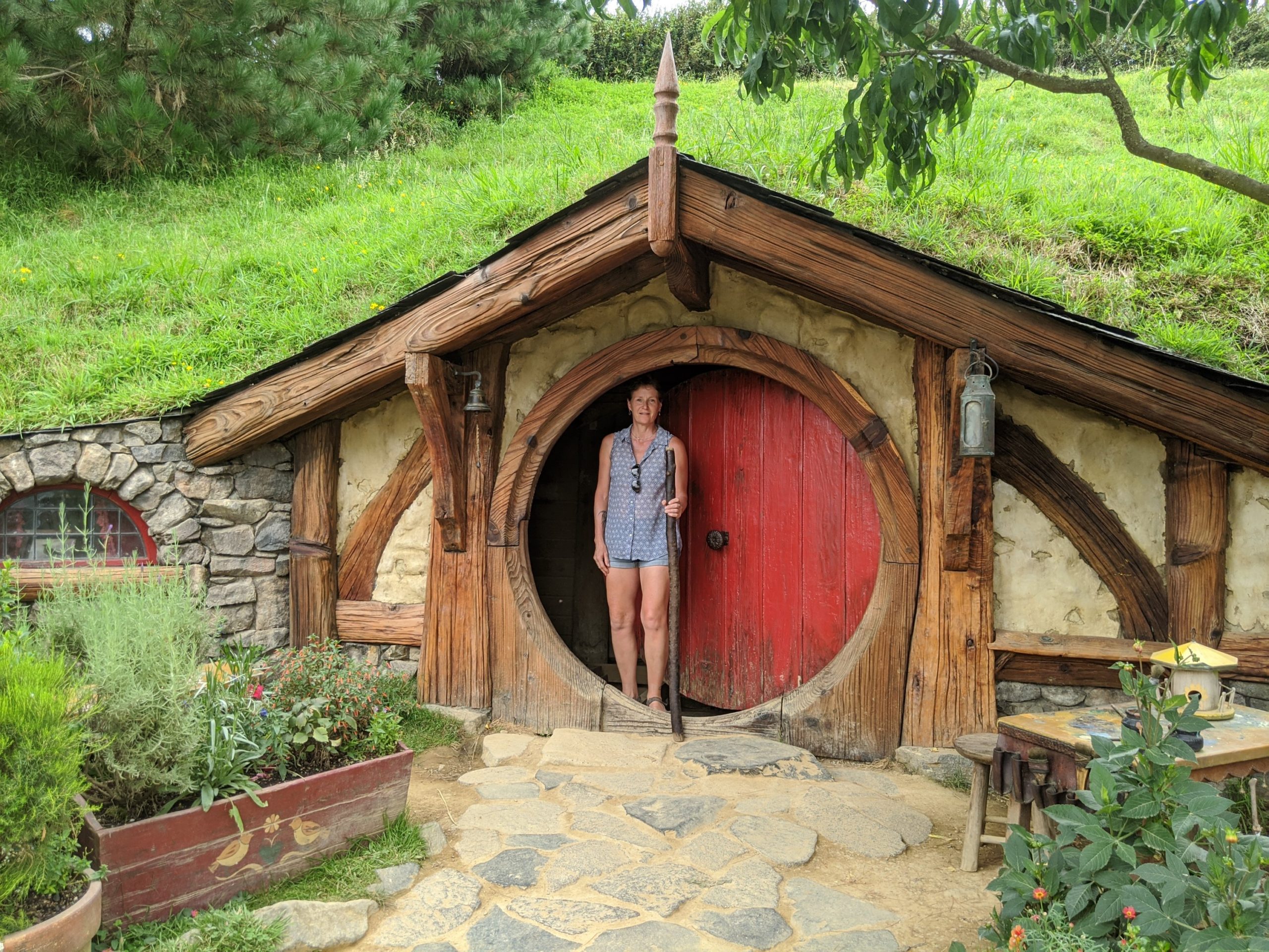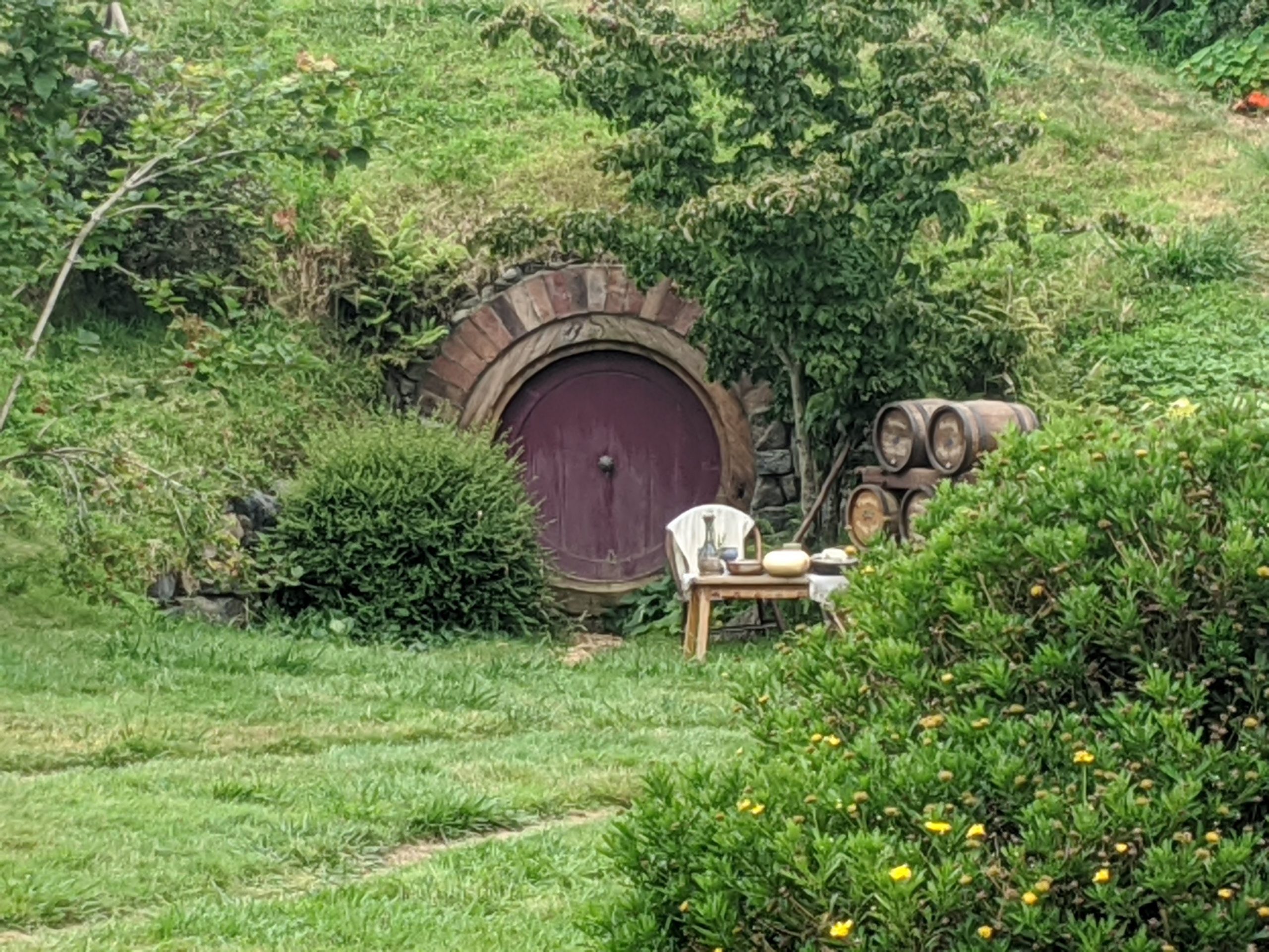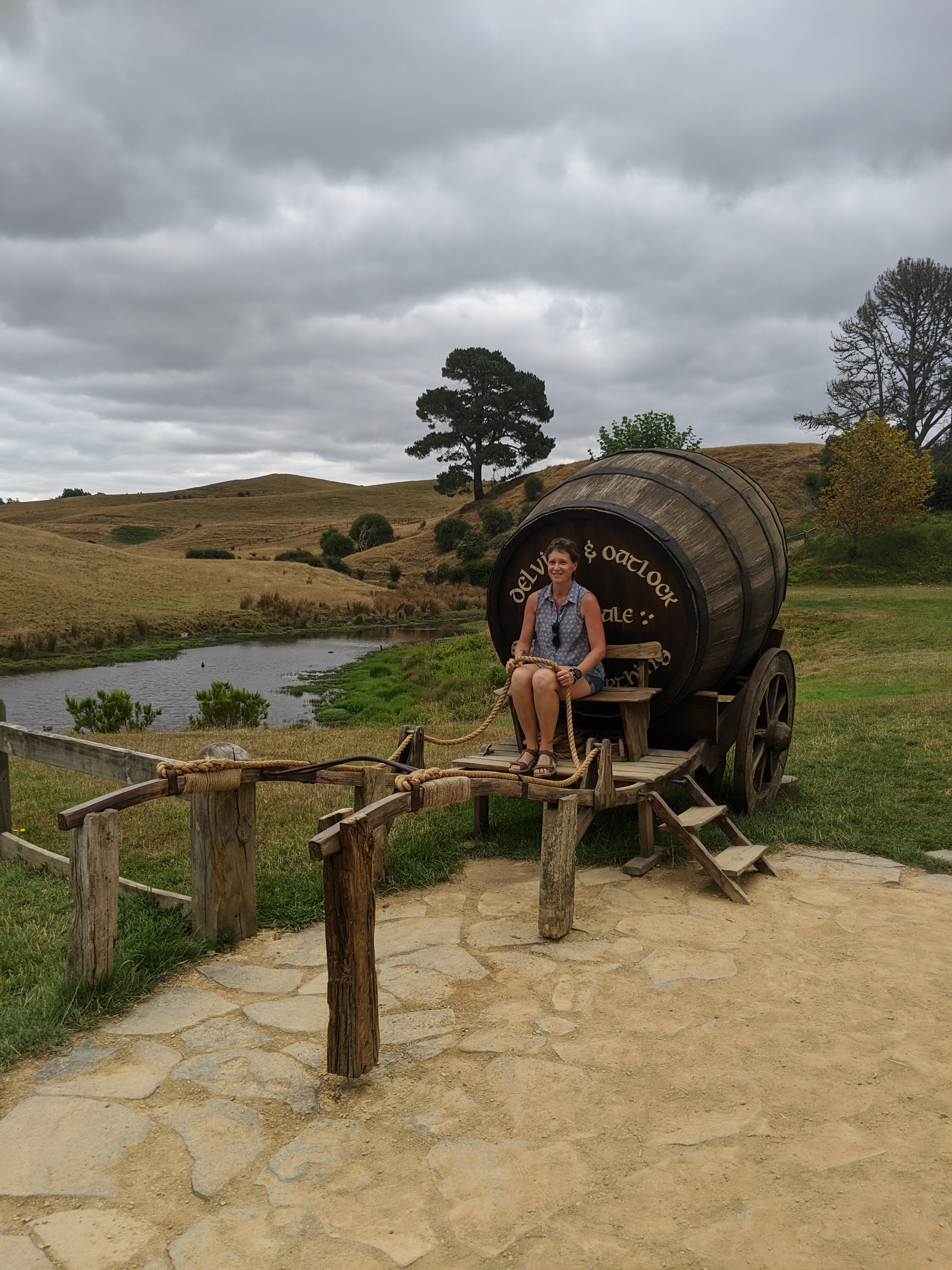 We learned how sets were made and how they made moss looks realistic. Everything is of poly wood to last longer.We were told about the two different sizes of Hobbit holes. They would use the small ones to photograph Gandalf and the large ones for the hobbits to achieve the difference in size of the characters.The attention to detail was amazing including an actual garden.This is the party tree from the movie that we see for Bilboa’s birthday and other clips from the movies. It is very old.This tree is fake. The leaves were taken off and fake leaves from Taiwan were purchased to put on the tree. Afterwards the color of the leaves was not quite right and Jackson hired people to paint the leaves to be the perfect color. Bilboa’s house is beneath it.The view from Bilboa’s door. In the movie he looks over to see a sunset. It is actually a sunrise. They shot the sequence backwards then played it in reverse. Bilboa’s house below the fake tree.Bilboa’s front door. Notice it is a larger hole to make the actor appear smaller.This Hobbit hole is smaller and Gandalf would stand here to appear larger.How they made the polywood look like real wood and moss so realistic is amazing.This is Sam’s house. Rosie met him here in the movie and there were 2 children. They are the actual children of the two actors (actors were not married together though.)On the party field below the big tree. This was originally swamp land and had to be raised 18 feet by filling with dirt.The keg on Gandalf’s wagon.Gandalf’s wagon.The Green Dragon Inn. We had a drink here and could choose from an ale, stout, or 2 non alcoholic ciders.
