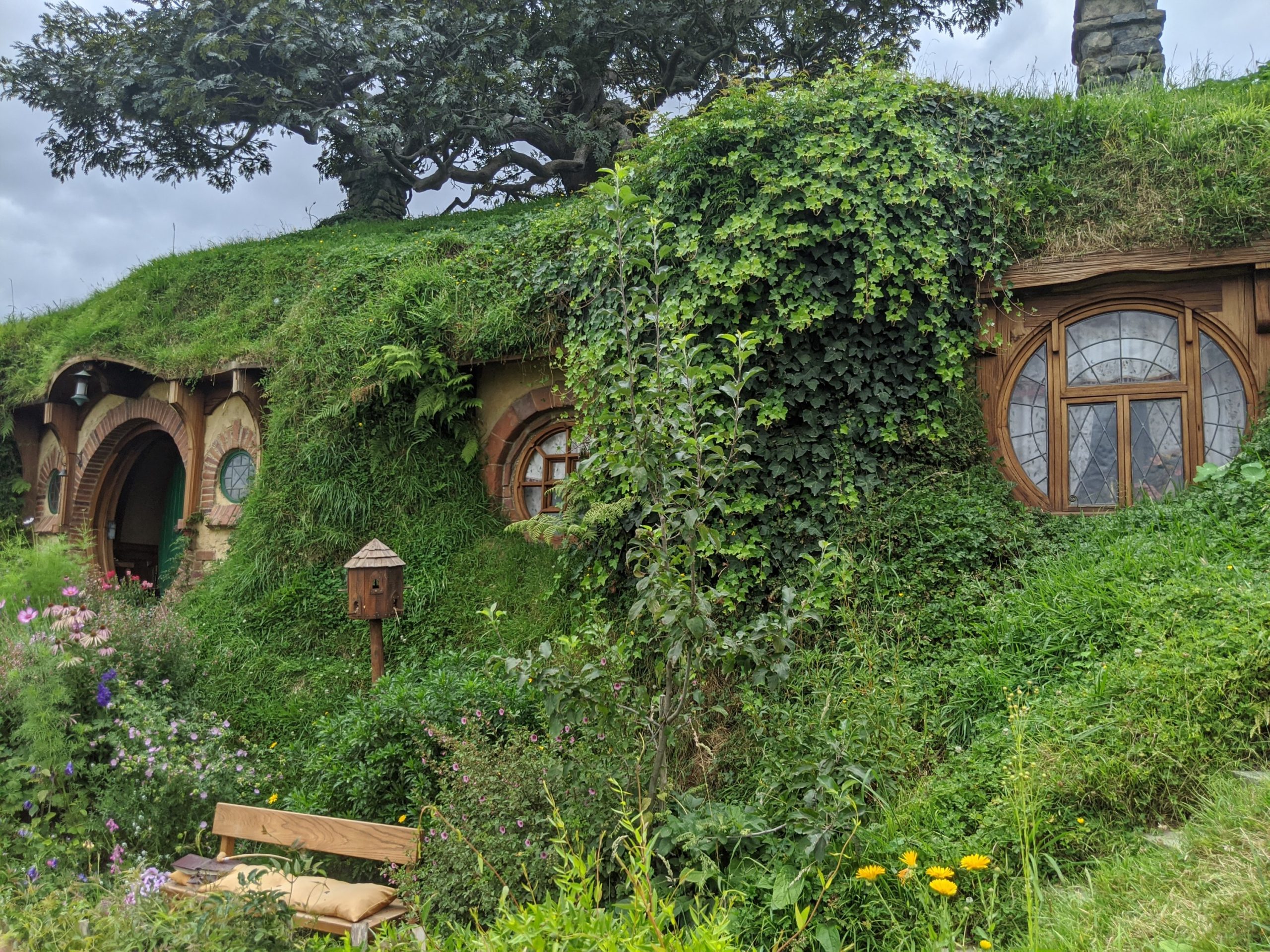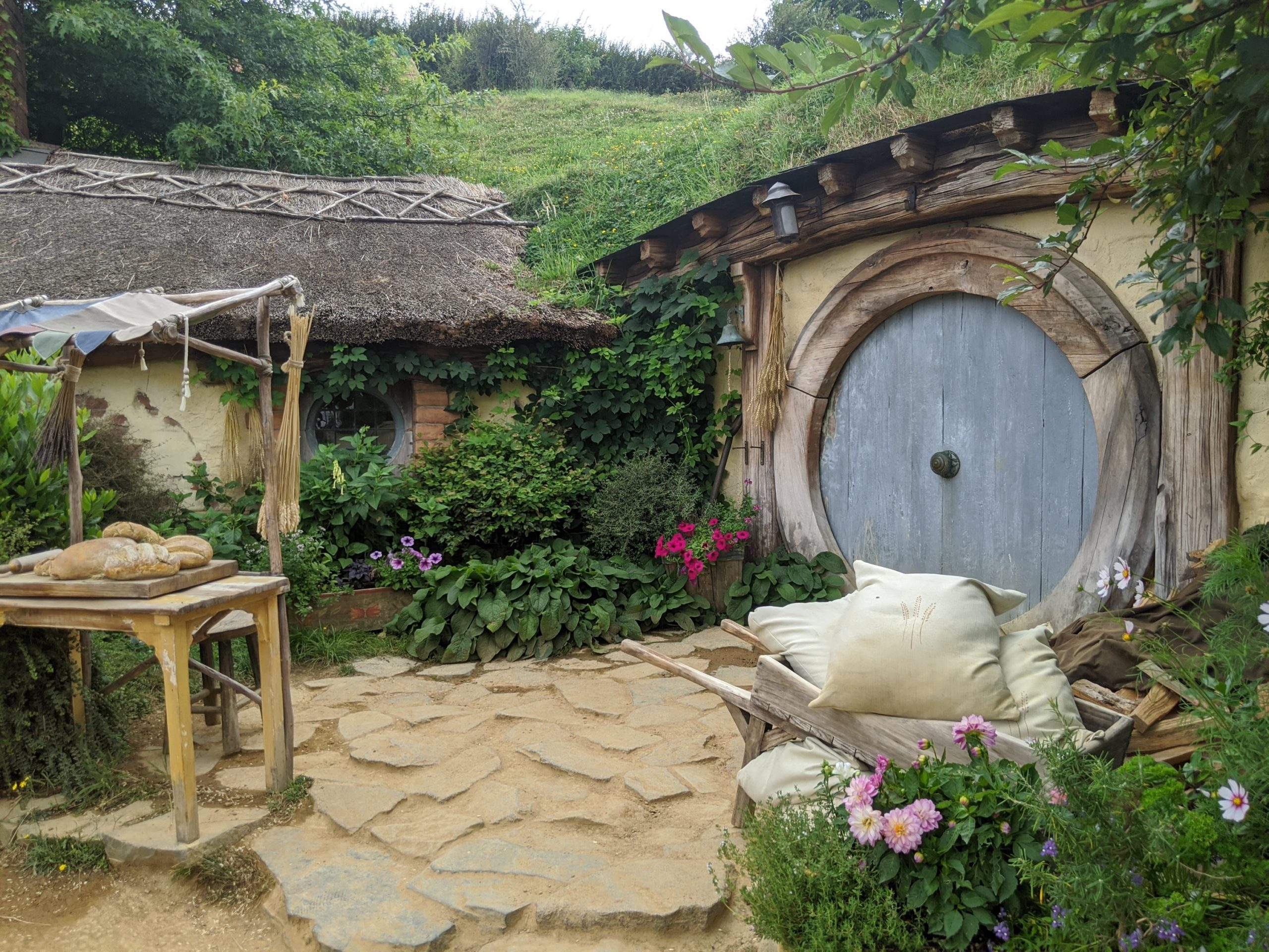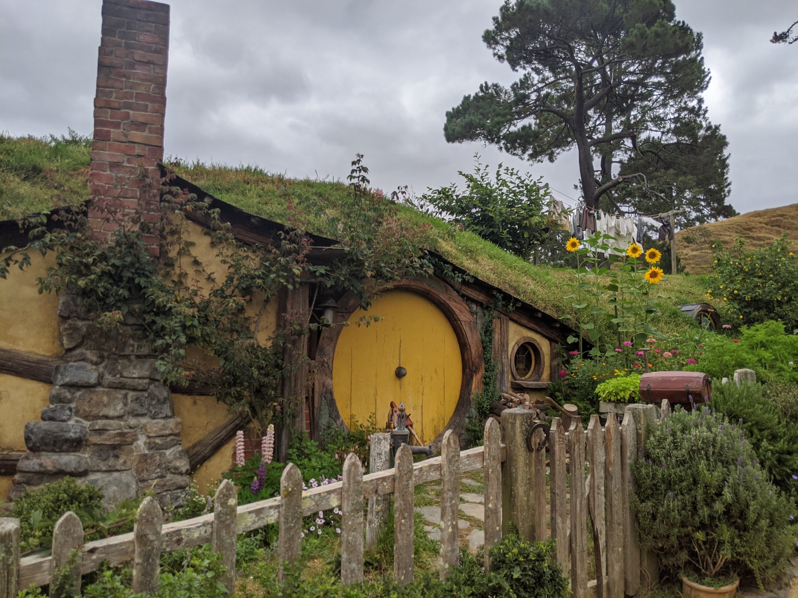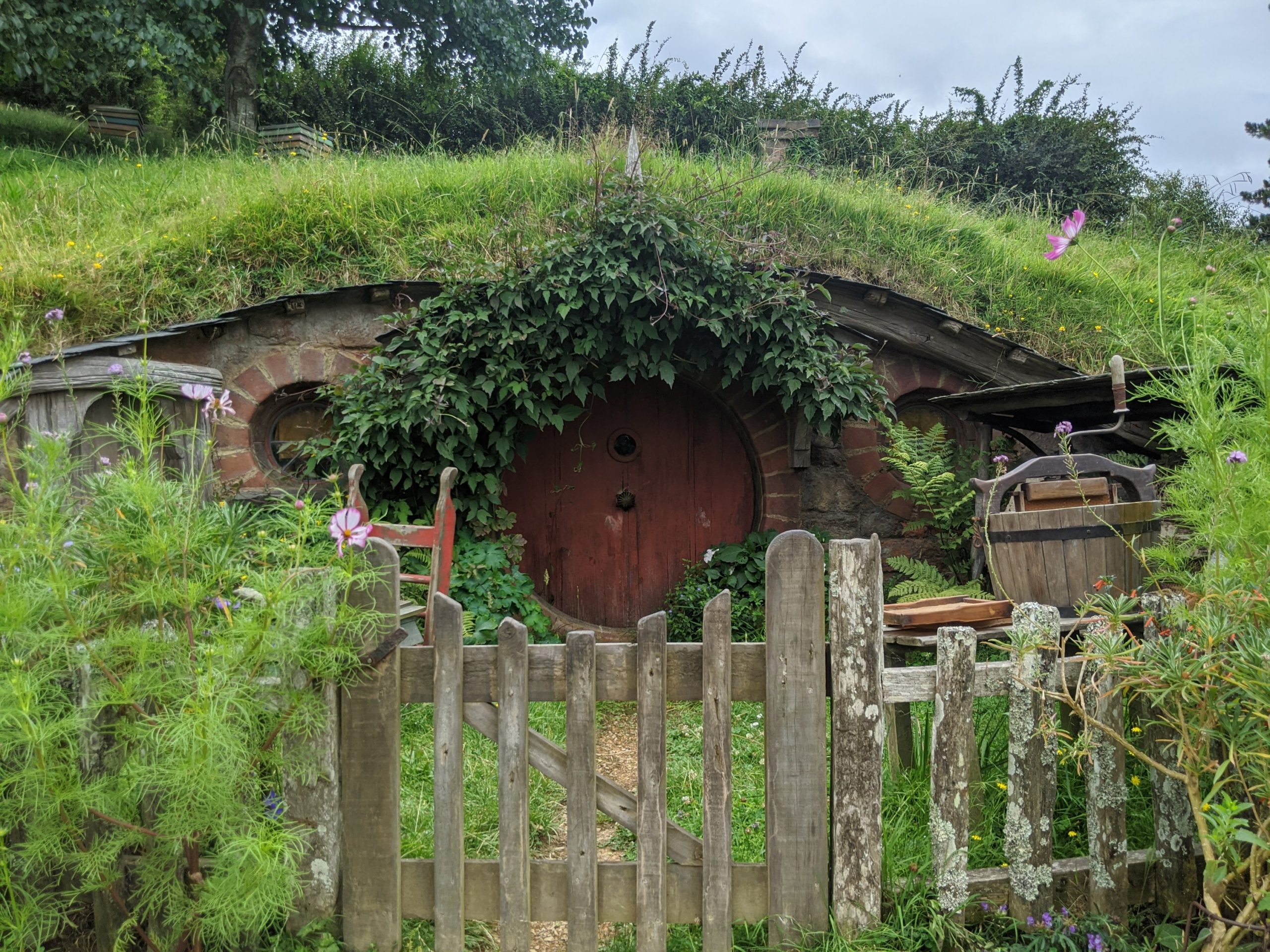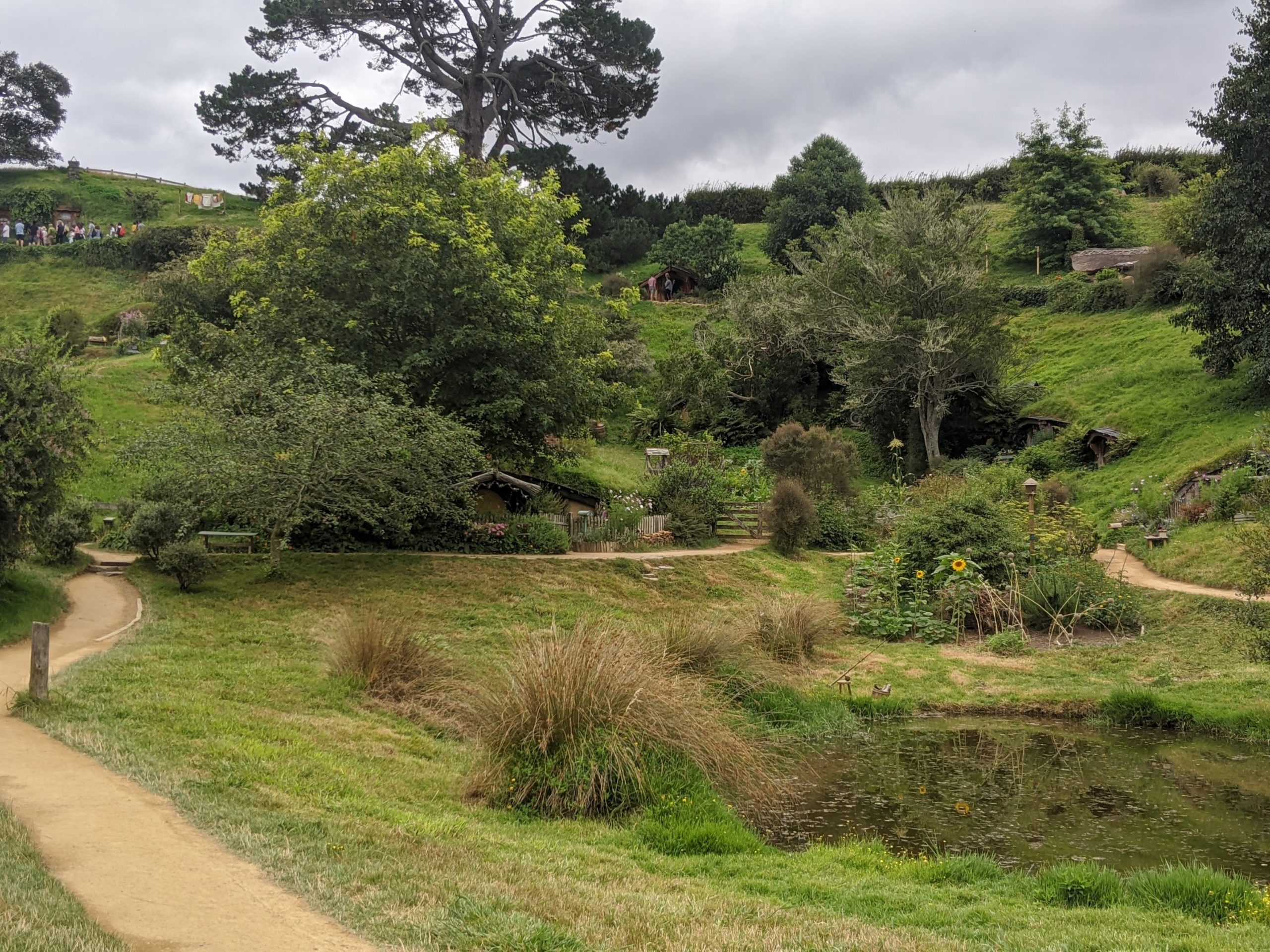 We learned how sets were made and how they made moss looks realistic. Everything is of poly wood to last longer.We were told about the two different sizes of Hobbit holes. They would use the small ones to photograph Gandalf and the large ones for the hobbits to achieve the difference in size of the characters.The attention to detail was amazing including an actual garden.This is the party tree from the movie that we see for Bilboa’s birthday and other clips from the movies. It is very old.This tree is fake. The leaves were taken off and fake leaves from Taiwan were purchased to put on the tree. Afterwards the color of the leaves was not quite right and Jackson hired people to paint the leaves to be the perfect color. Bilboa’s house is beneath it.The view from Bilboa’s door. In the movie he looks over to see a sunset. It is actually a sunrise. They shot the sequence backwards then played it in reverse. Bilboa’s house below the fake tree.Bilboa’s front door. Notice it is a larger hole to make the actor appear smaller.This Hobbit hole is smaller and Gandalf would stand here to appear larger.How they made the polywood look like real wood and moss so realistic is amazing.This is Sam’s house. Rosie met him here in the movie and there were 2 children. They are the actual children of the two actors (actors were not married together though.)On the party field below the big tree. This was originally swamp land and had to be raised 18 feet by filling with dirt.The keg on Gandalf’s wagon.Gandalf’s wagon.The Green Dragon Inn. We had a drink here and could choose from an ale, stout, or 2 non alcoholic ciders.