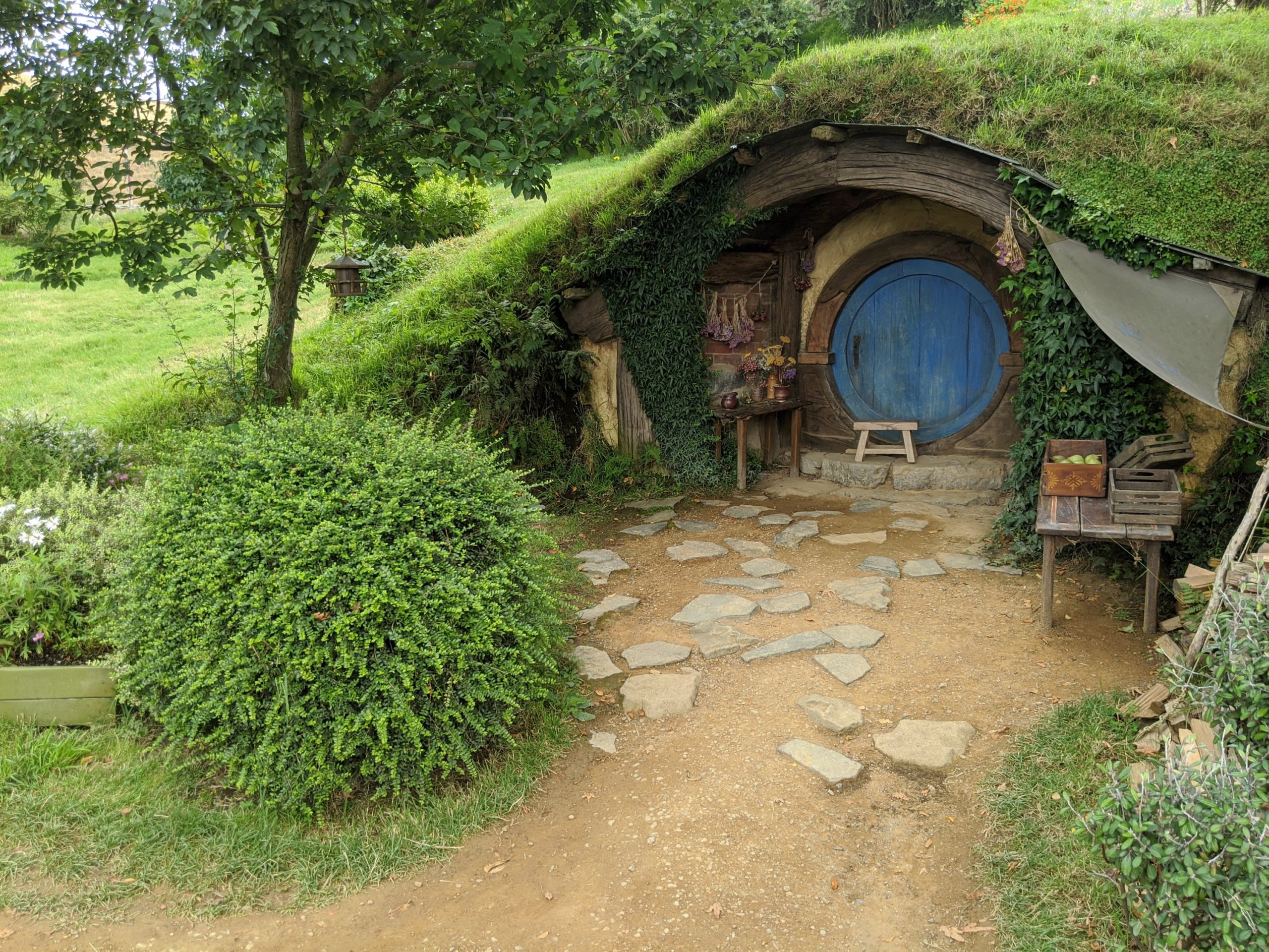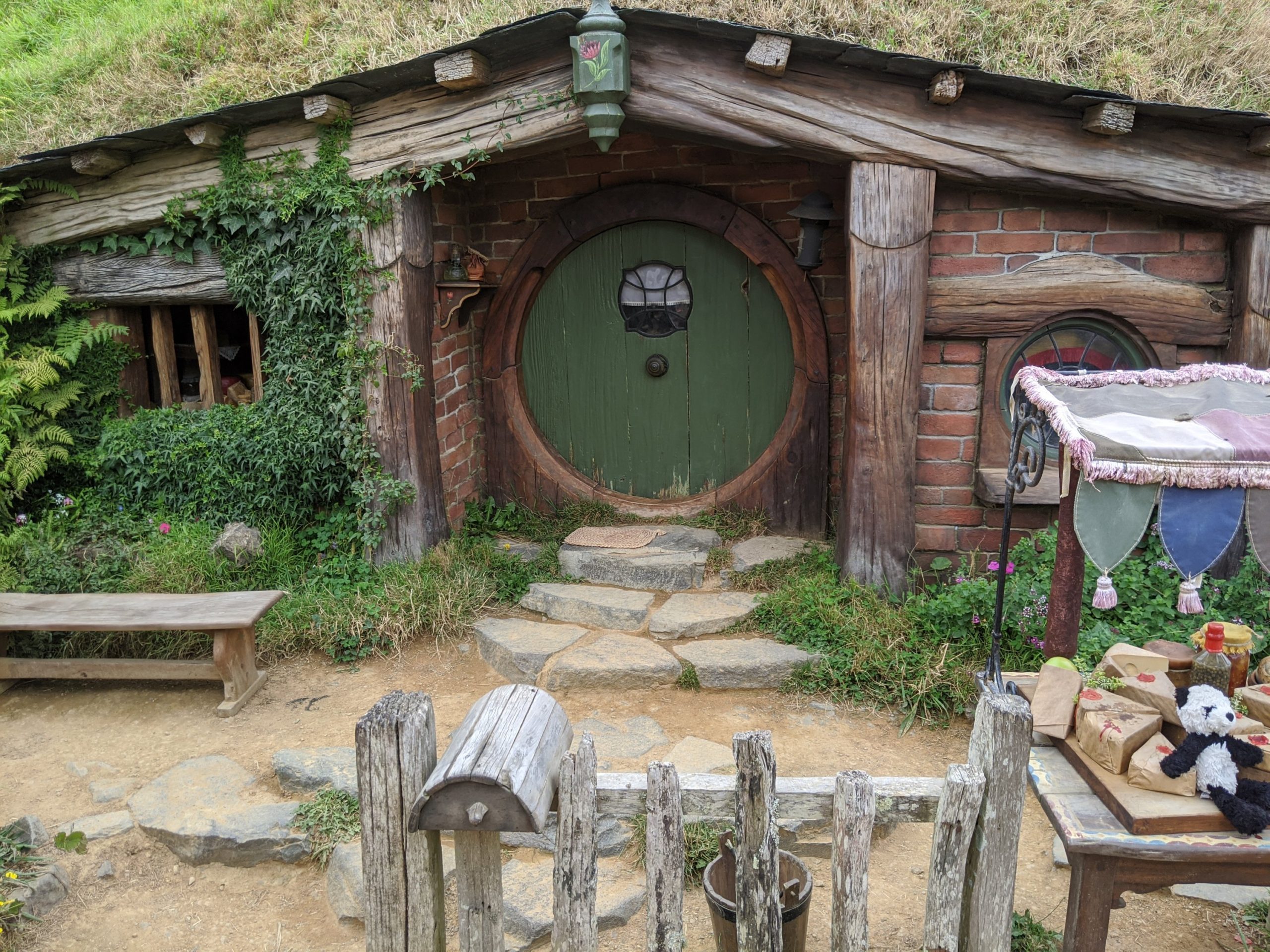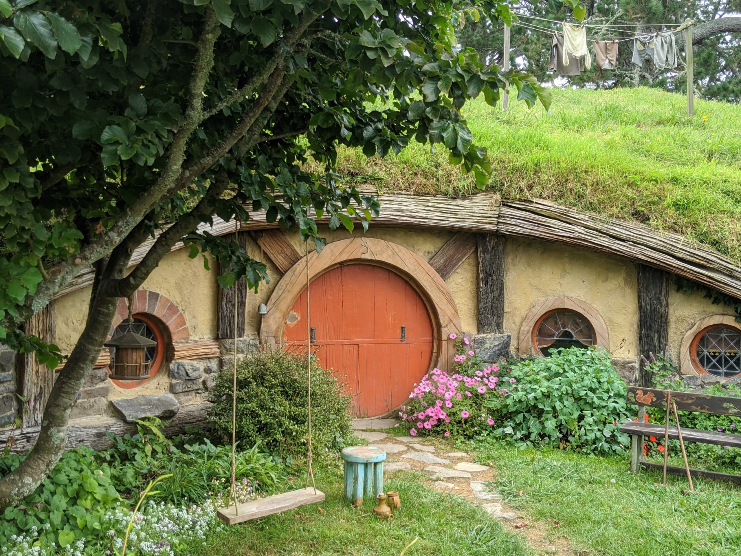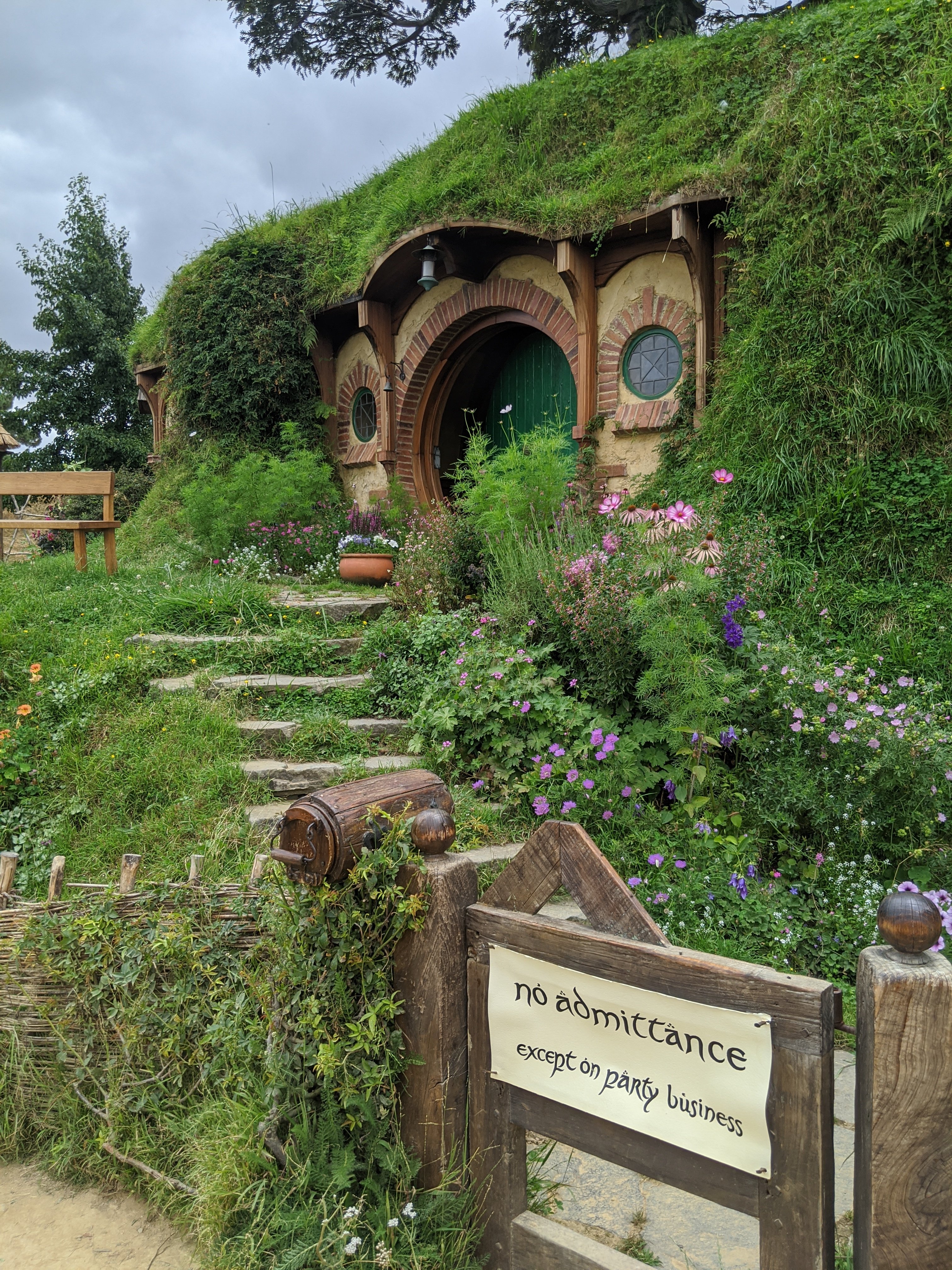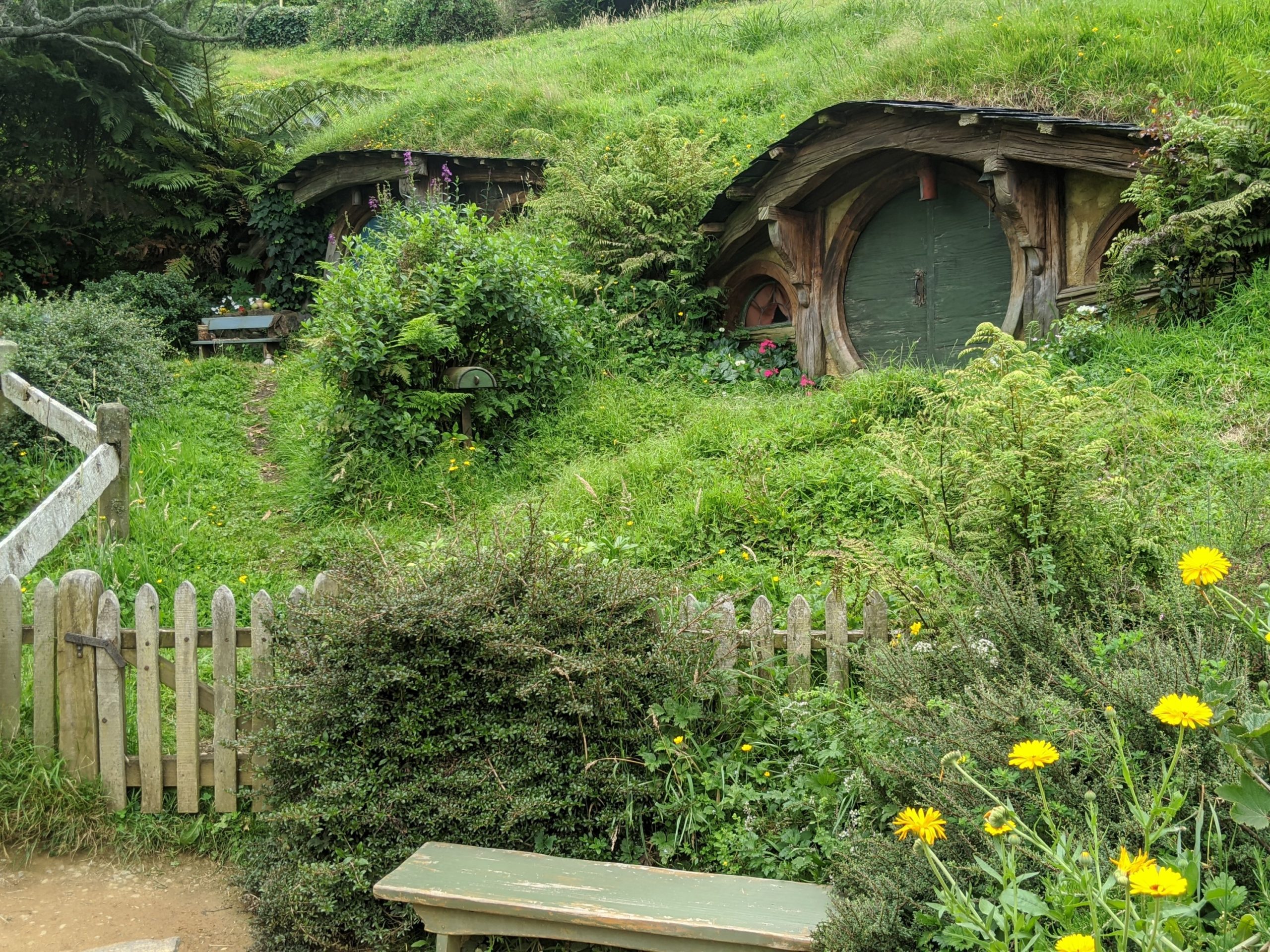 We learned how sets were made and how they made moss looks realistic. Everything is of poly wood to last longer.We were told about the two different sizes of Hobbit holes. They would use the small ones to photograph Gandalf and the large ones for the hobbits to achieve the difference in size of the characters.The attention to detail was amazing including an actual garden.This is the party tree from the movie that we see for Bilboa’s birthday and other clips from the movies. It is very old.This tree is fake. The leaves were taken off and fake leaves from Taiwan were purchased to put on the tree. Afterwards the color of the leaves was not quite right and Jackson hired people to paint the leaves to be the perfect color. Bilboa’s house is beneath it.The view from Bilboa’s door. In the movie he looks over to see a sunset. It is actually a sunrise. They shot the sequence backwards then played it in reverse. Bilboa’s house below the fake tree.Bilboa’s front door. Notice it is a larger hole to make the actor appear smaller.This Hobbit hole is smaller and Gandalf would stand here to appear larger.How they made the polywood look like real wood and moss so realistic is amazing.This is Sam’s house. Rosie met him here in the movie and there were 2 children. They are the actual children of the two actors (actors were not married together though.)On the party field below the big tree. This was originally swamp land and had to be raised 18 feet by filling with dirt.The keg on Gandalf’s wagon.Gandalf’s wagon.The Green Dragon Inn. We had a drink here and could choose from an ale, stout, or 2 non alcoholic ciders.