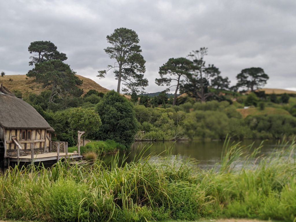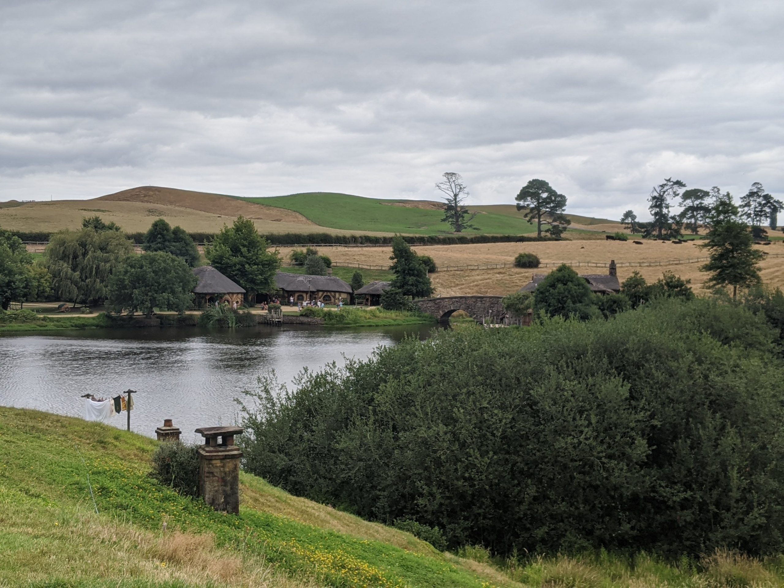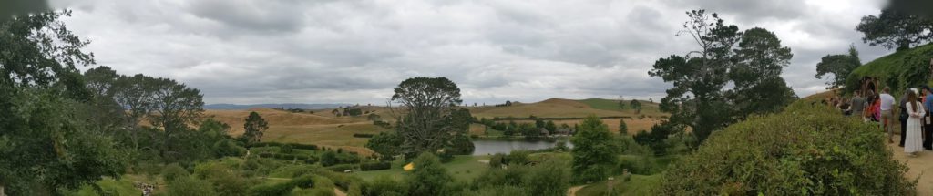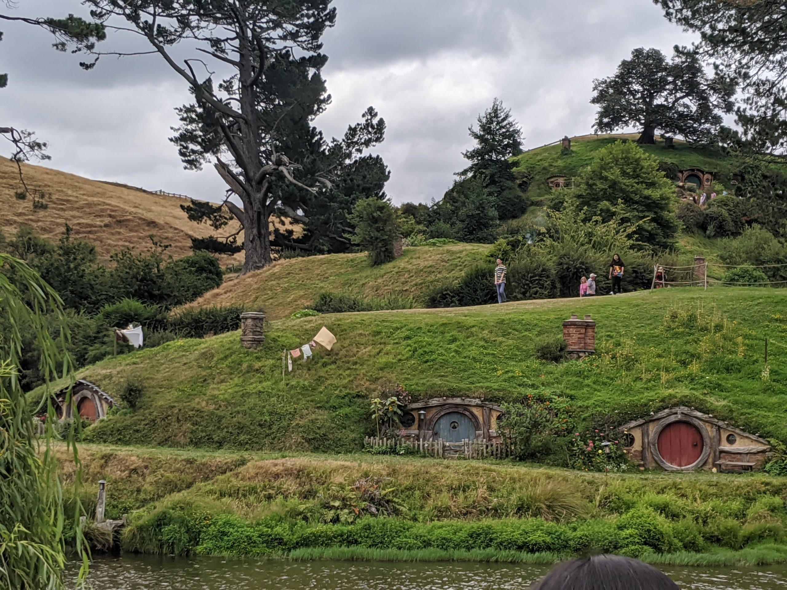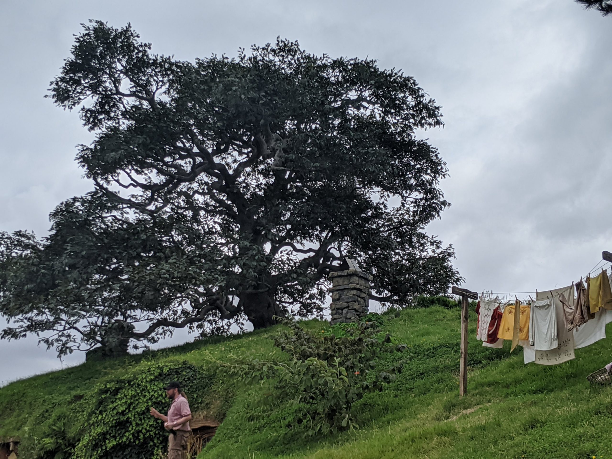 I had booked a buffet lunch to eat before the Hobbit tour. We arrived then met the tour guide and boarded a bus. We watched movie clips and interviews with Peter Jackson about the set. It is still located on a farmers land. The two are partners for Hobbiton. The hills, lake, and tree were the reason this site was chosen.