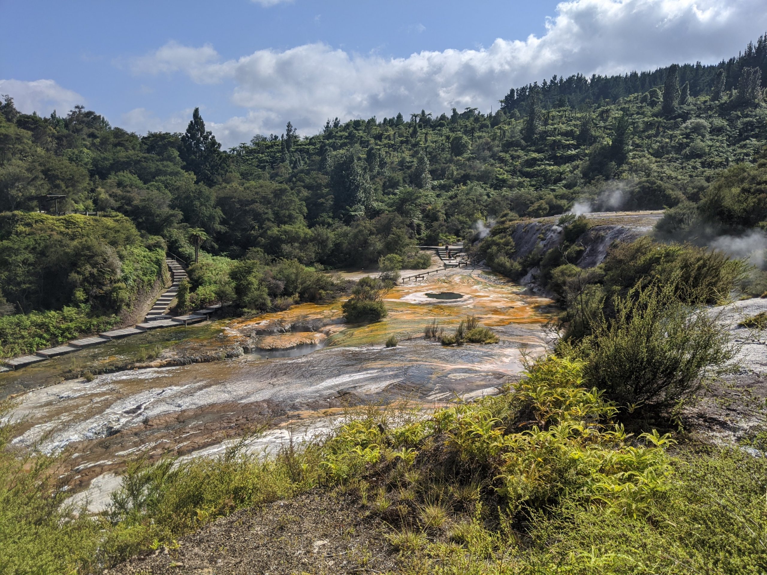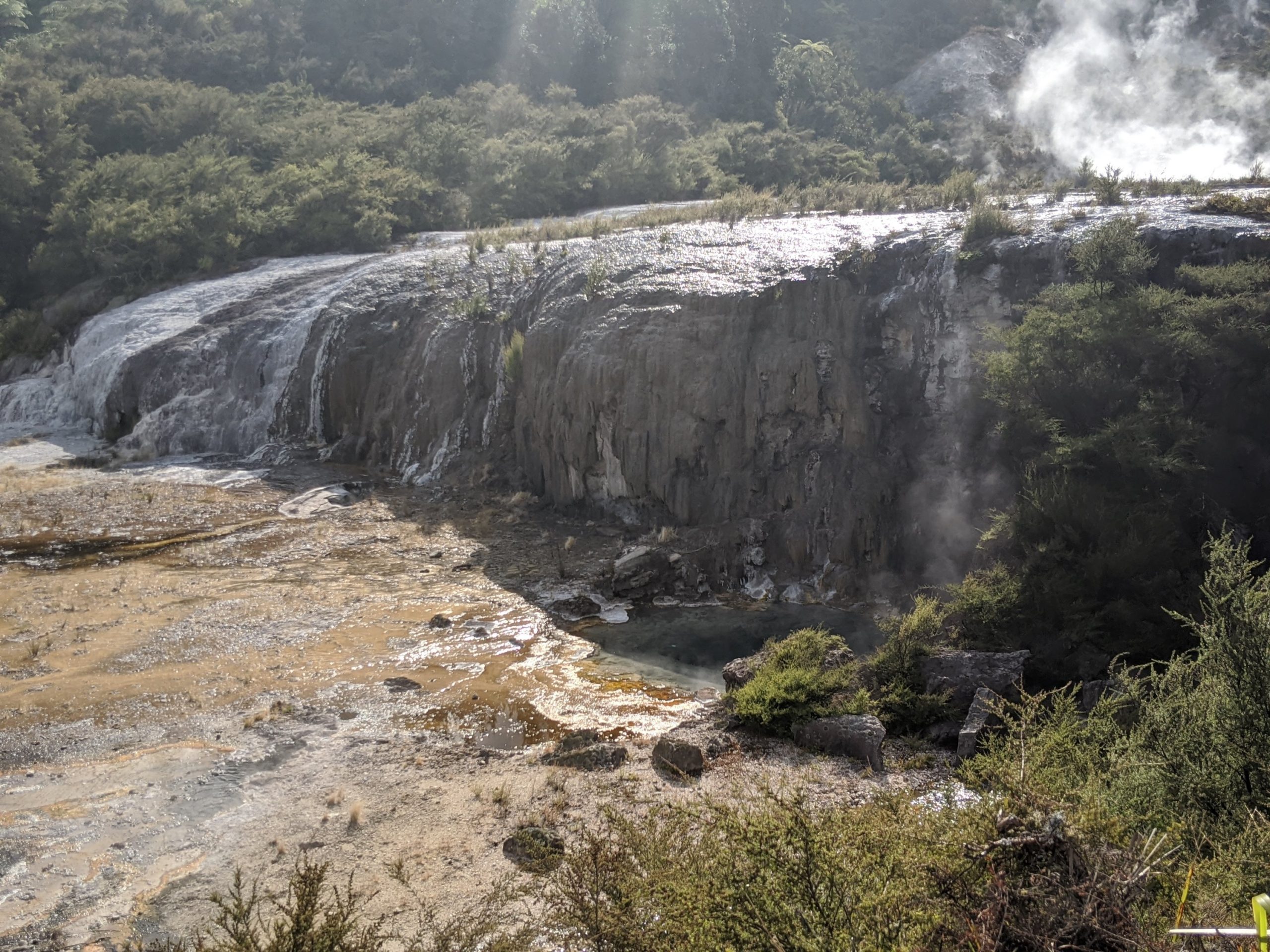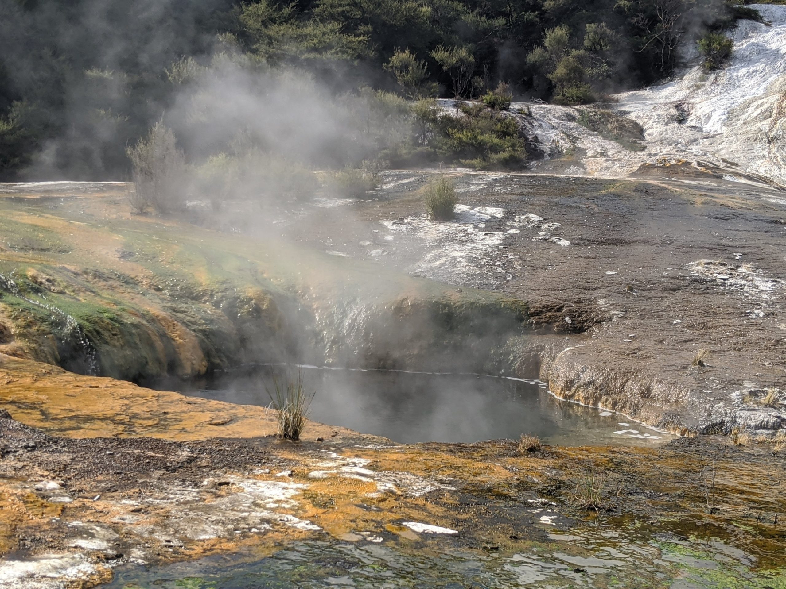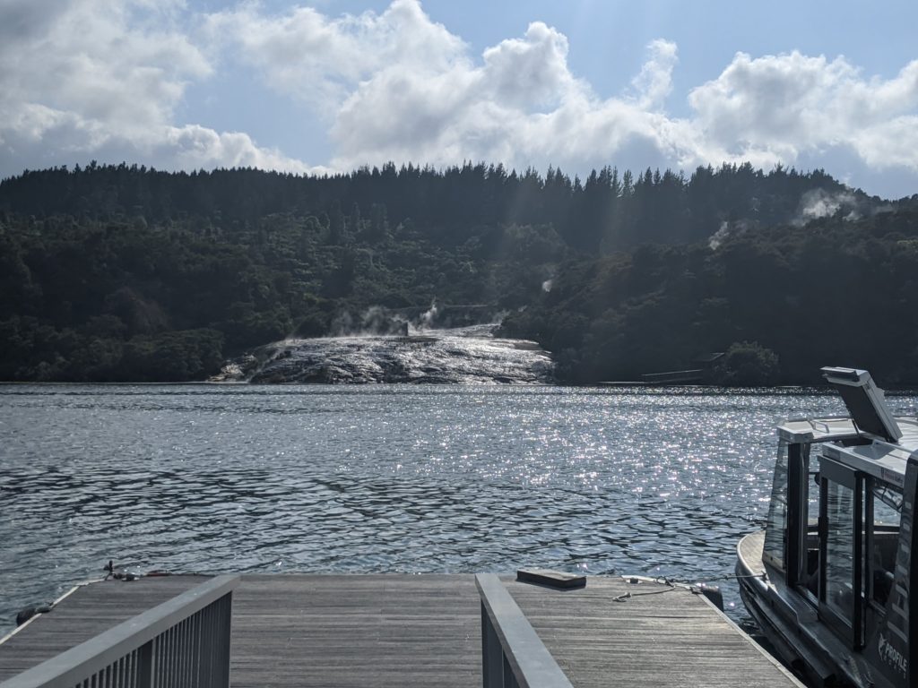After buying the ticket from the visits center you take the ferry to the island.Diamond geyser erupts every 2-3 hours but can be highly variable.Looking out from the Emerald Terrace. 20 million liters per day flows across here.A massive earthquake in 131 AD formed one of these 3 fault scarps in this park. These were caused by the eruption of Mount Taupo. This silica stump is a remnant from the eruption and part of Maori legend of a monster who lived in the cave downstream.The artist pallette was formed 8000 to 14000 BC. The batting thicknesses of silica as well as the chemicals allow varied algae growth.Tree ferns.The Riatapu cave is known as a sacred cave. This is one of two geothermally situated caves that exist in the world.Active mud pools.A lamington for dessert.