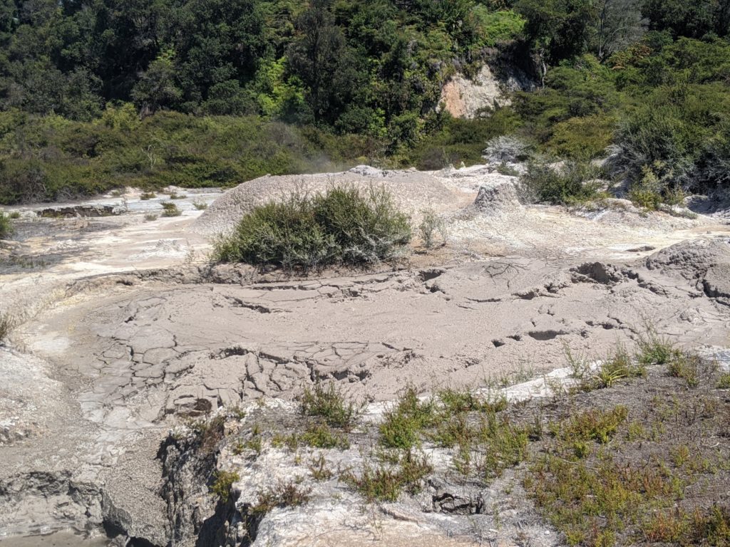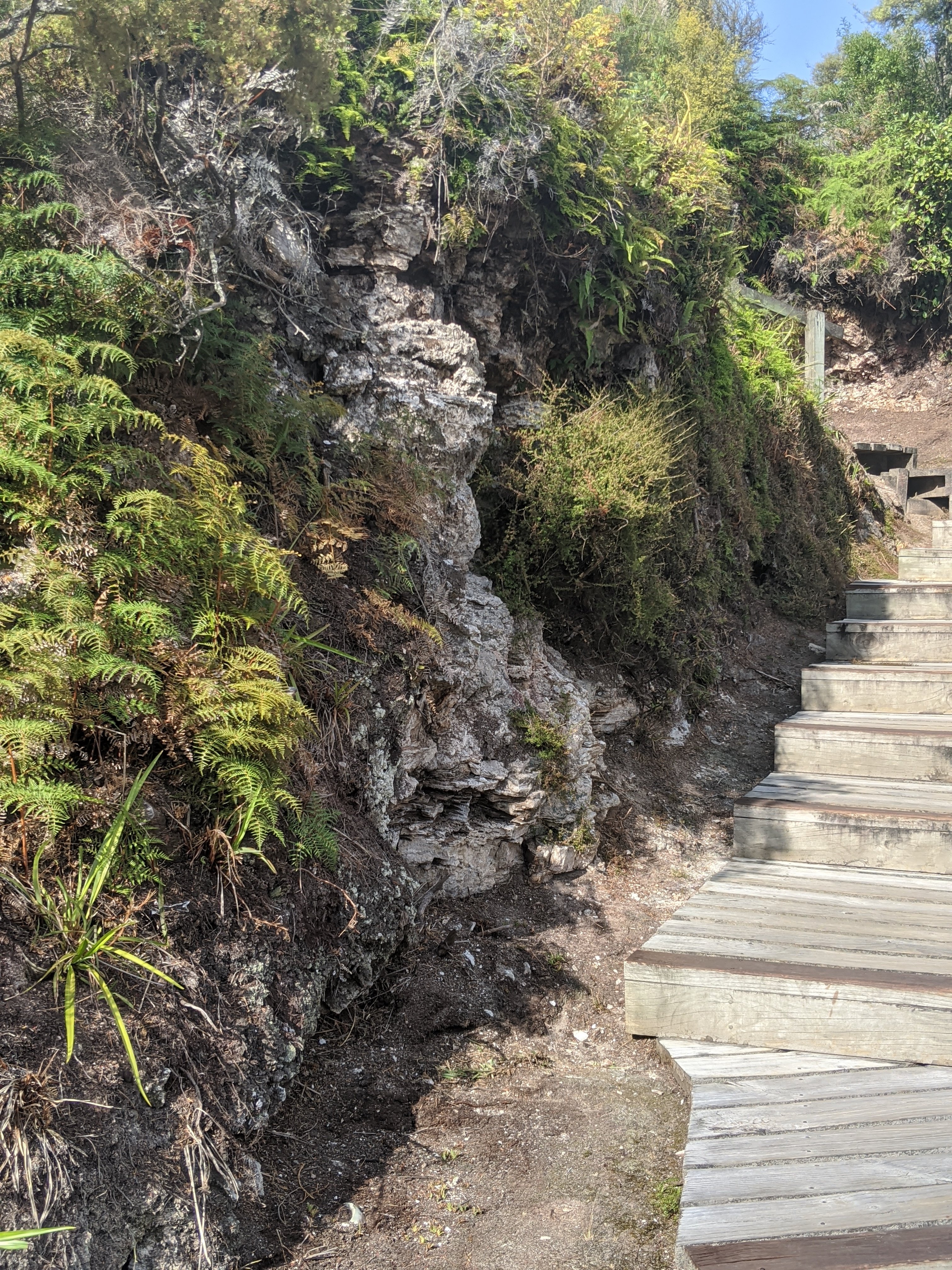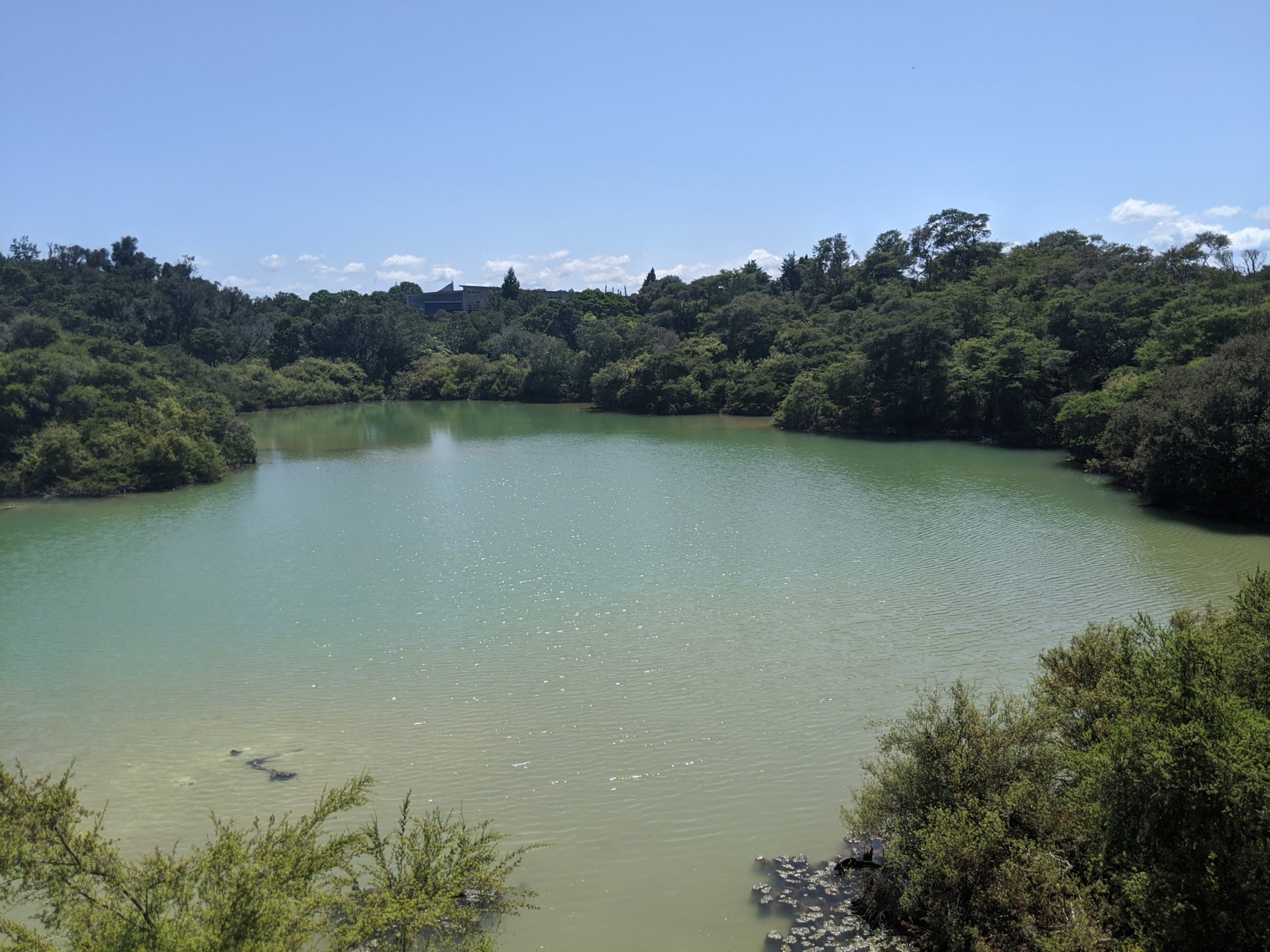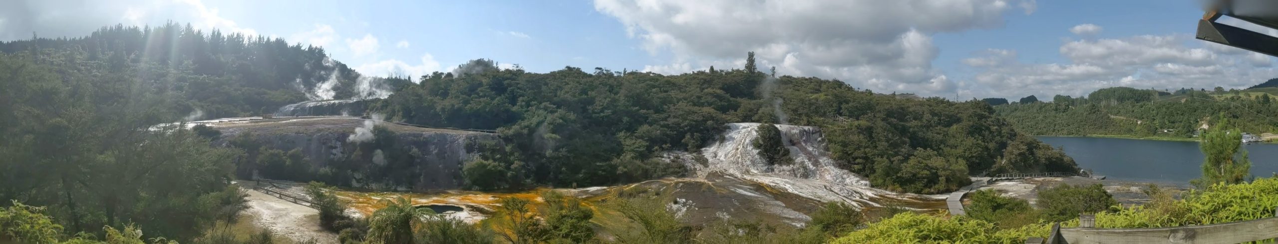 After buying the ticket from the visits center you take the ferry to the island.Diamond geyser erupts every 2-3 hours but can be highly variable.Looking out from the Emerald Terrace. 20 million liters per day flows across here.A massive earthquake in 131 AD formed one of these 3 fault scarps in this park. These were caused by the eruption of Mount Taupo. This silica stump is a remnant from the eruption and part of Maori legend of a monster who lived in the cave downstream.The artist pallette was formed 8000 to 14000 BC. The batting thicknesses of silica as well as the chemicals allow varied algae growth.Tree ferns.The Riatapu cave is known as a sacred cave. This is one of two geothermally situated caves that exist in the world.Active mud pools.A lamington for dessert.