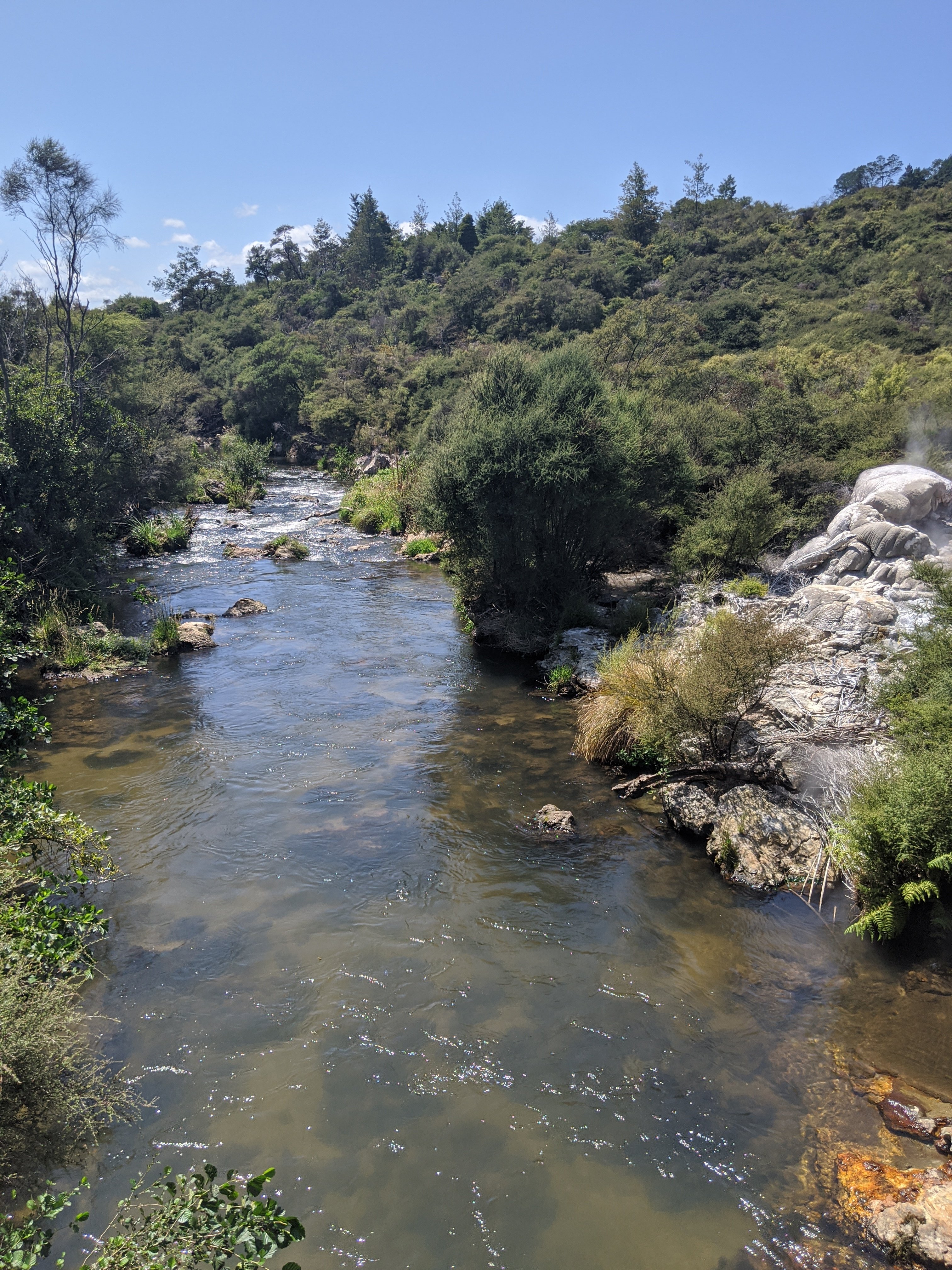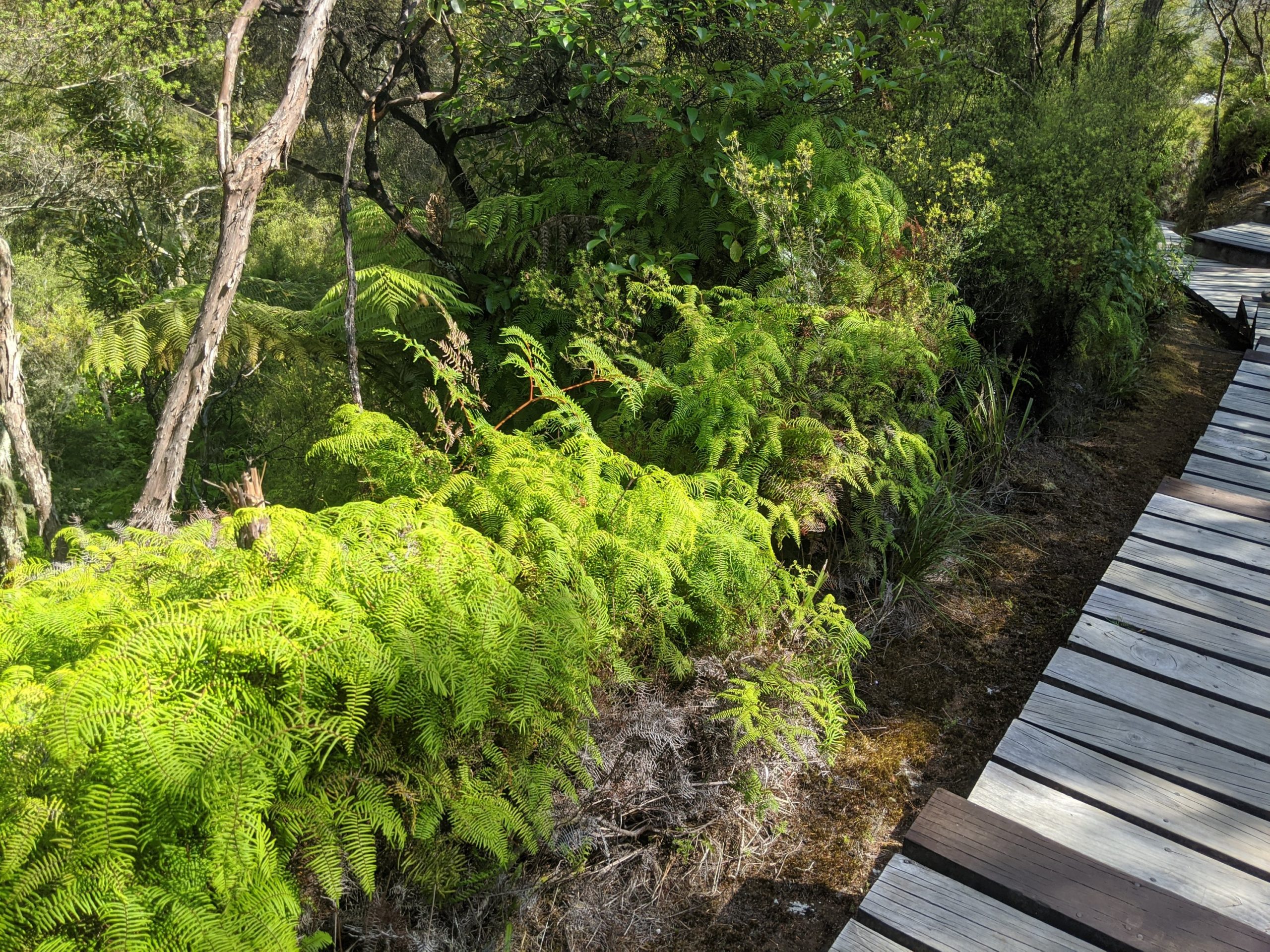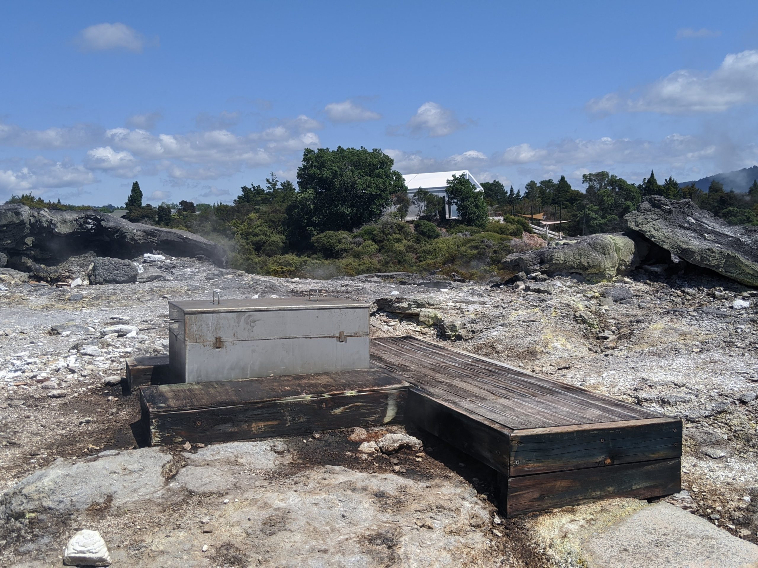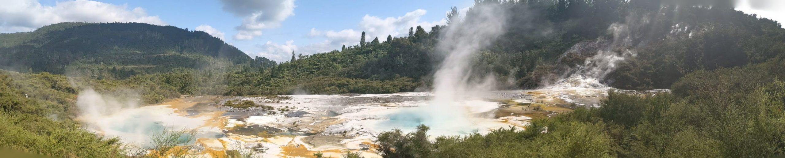 After buying the ticket from the visits center you take the ferry to the island.Diamond geyser erupts every 2-3 hours but can be highly variable.Looking out from the Emerald Terrace. 20 million liters per day flows across here.A massive earthquake in 131 AD formed one of these 3 fault scarps in this park. These were caused by the eruption of Mount Taupo. This silica stump is a remnant from the eruption and part of Maori legend of a monster who lived in the cave downstream.The artist pallette was formed 8000 to 14000 BC. The batting thicknesses of silica as well as the chemicals allow varied algae growth.Tree ferns.The Riatapu cave is known as a sacred cave. This is one of two geothermally situated caves that exist in the world.Active mud pools.A lamington for dessert.