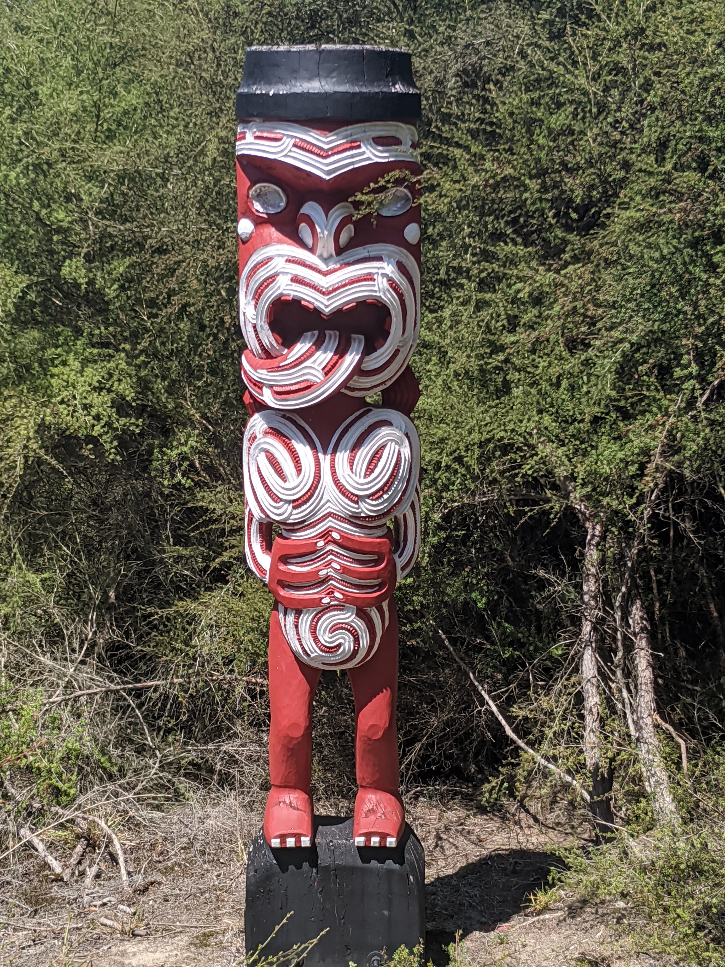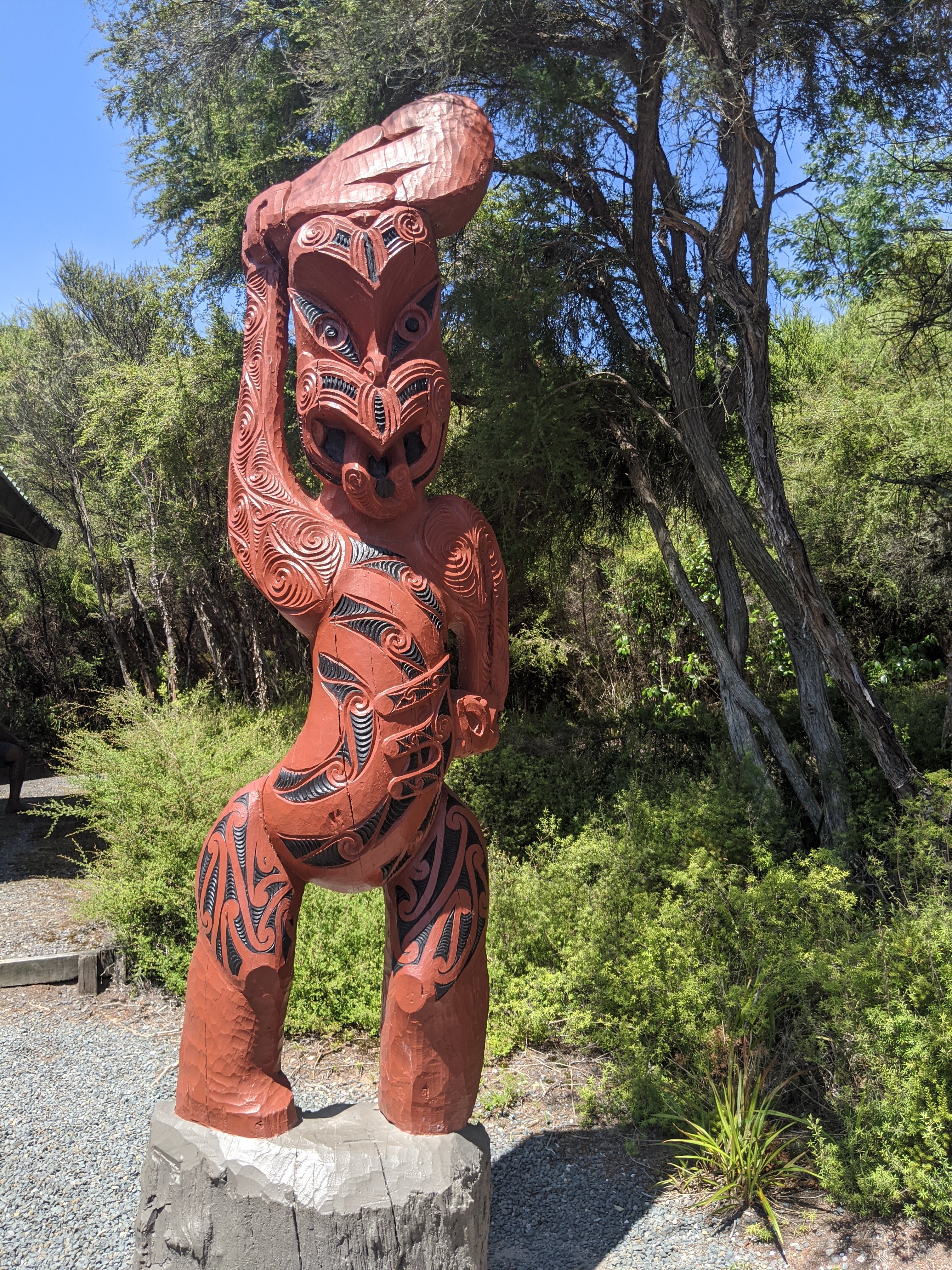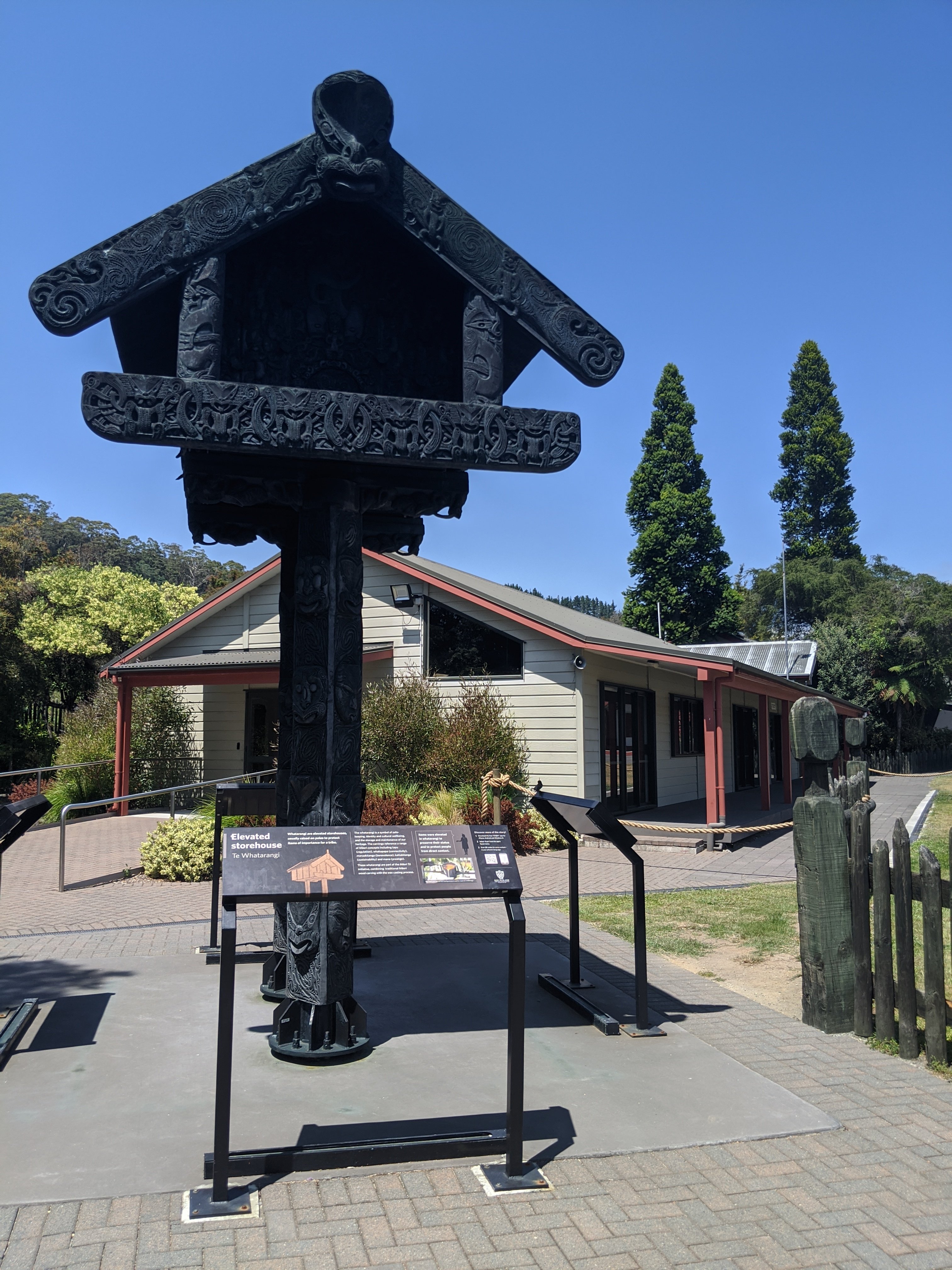 In front of the active geyser Pohutu.Be careful when sitting! These are active vents and warm stones.Mud pools.This is a natural stream vent cooker that the Maori uses to cook food. Our food tonight will be cooked this way. It can cook corn on the cob in 10 minutes. It uses heart from the ground to cook food.Whanaaungatanga statue that celebrates kinship which is essential in Maori.According to legend, this pool was used by leaders of the Maori tribe and is sacred. However it has the pH of battery acid.Puarenga stream. 3 streams feed in here and water quality had declined from industry. Finally water quality has improved and fish have returned. An elevated storehouse used by Maori.The bridge to the cultural center.Women weaving with flax.Beautiful Maori carvings.Some weavings are made to look like the NZ bird, the kiwi. These would take many years to complete.