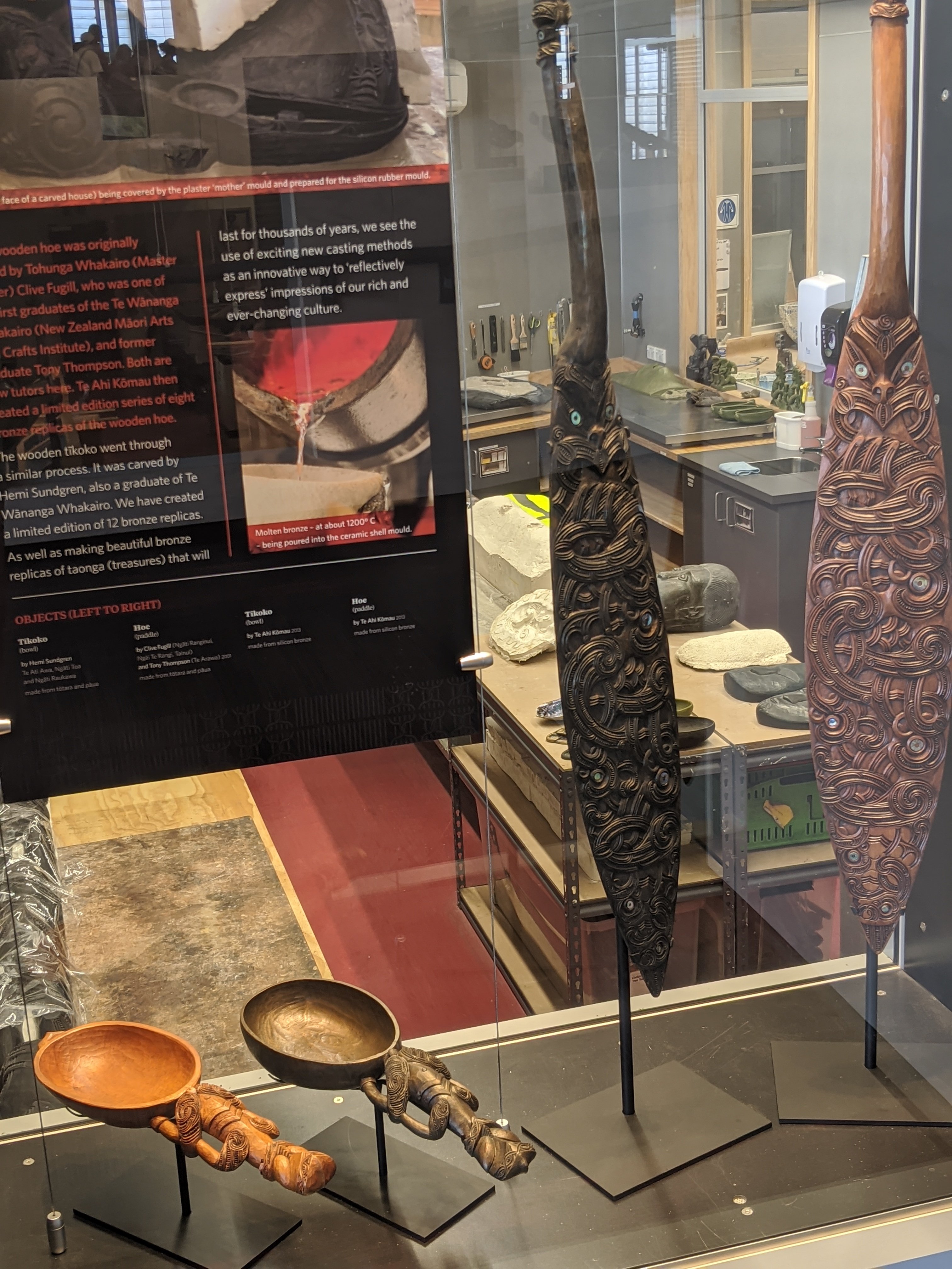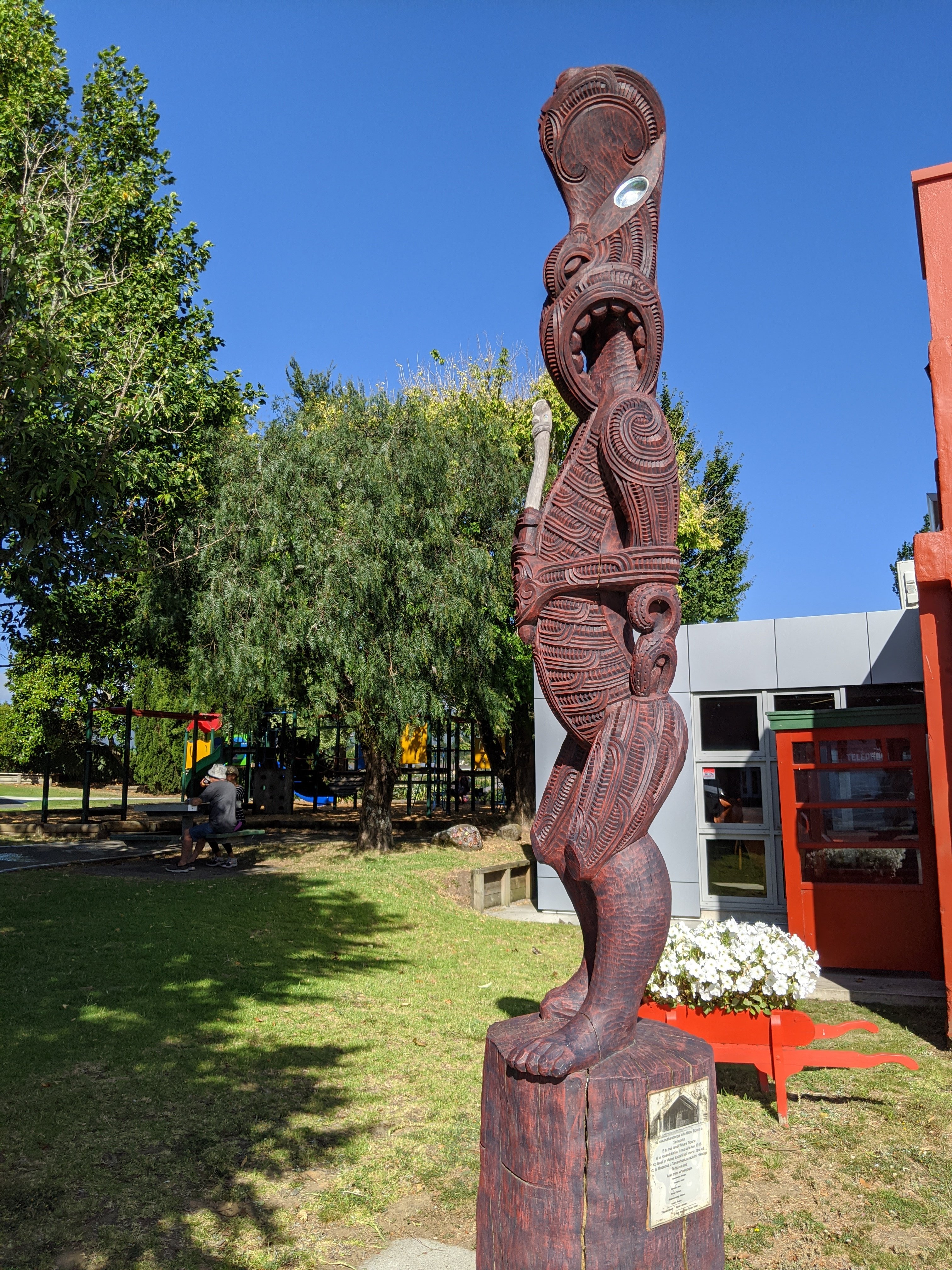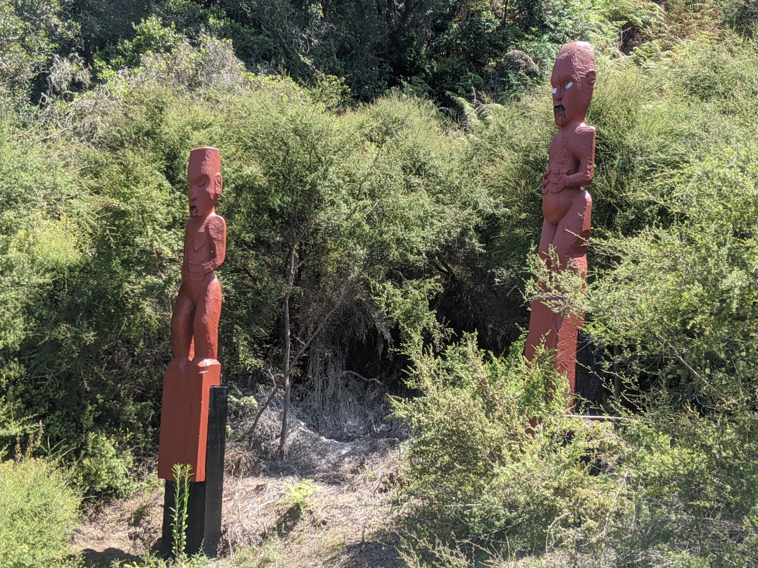 In front of the active geyser Pohutu.Be careful when sitting! These are active vents and warm stones.Mud pools.This is a natural stream vent cooker that the Maori uses to cook food. Our food tonight will be cooked this way. It can cook corn on the cob in 10 minutes. It uses heart from the ground to cook food.Whanaaungatanga statue that celebrates kinship which is essential in Maori.According to legend, this pool was used by leaders of the Maori tribe and is sacred. However it has the pH of battery acid.Puarenga stream. 3 streams feed in here and water quality had declined from industry. Finally water quality has improved and fish have returned. An elevated storehouse used by Maori.The bridge to the cultural center.Women weaving with flax.Beautiful Maori carvings.Some weavings are made to look like the NZ bird, the kiwi. These would take many years to complete.