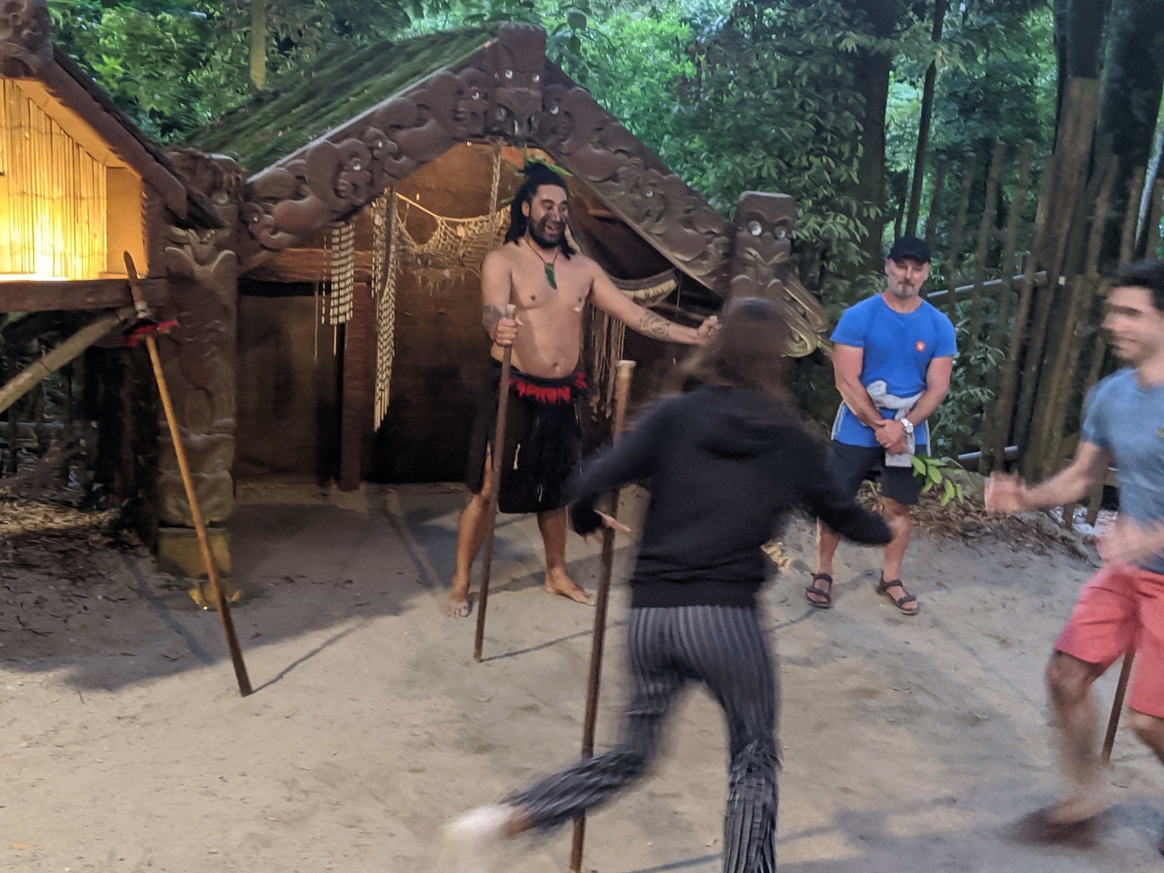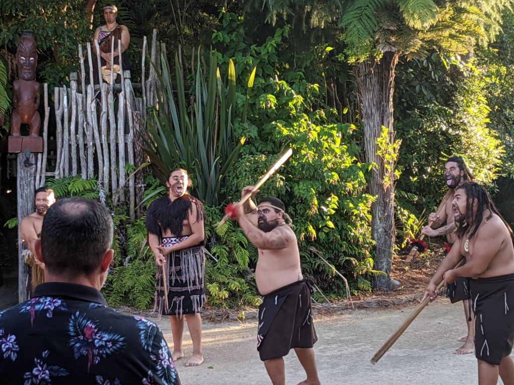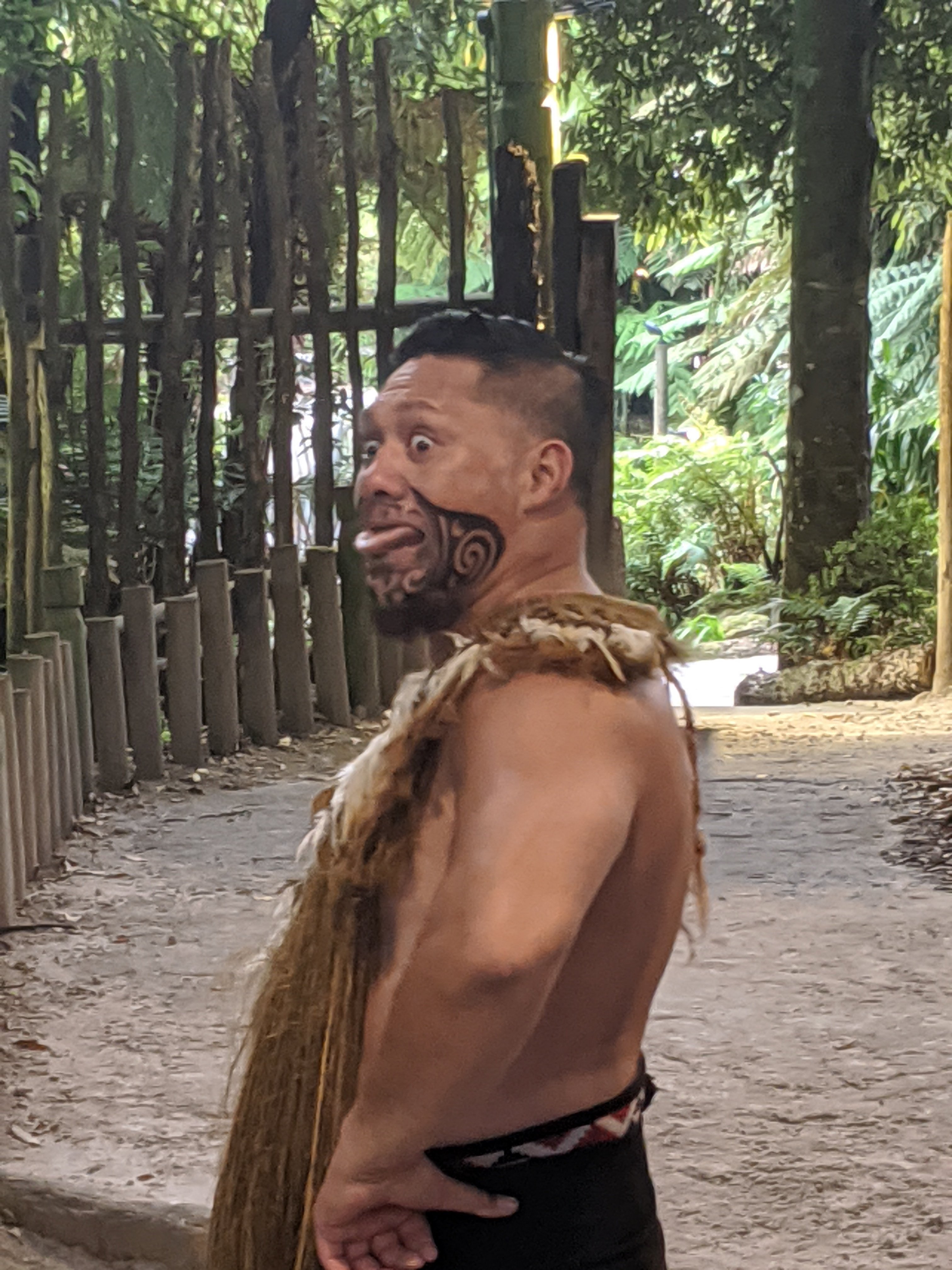 We booked tickets to the Tamaki village. They pick you up at your hotel and take you to a visitors center in town for a brief introduction of Maori legend. On our tickets was a name of a tribe. Ours was Tui. That is the bus you ride. Each bus chooses a make leader to be chief and they are briefed on the opening ceremony. We also practice Maori phrases like: “Kia ora” (hello) and “ka Pai” (okay). The bus driver was hilarious.