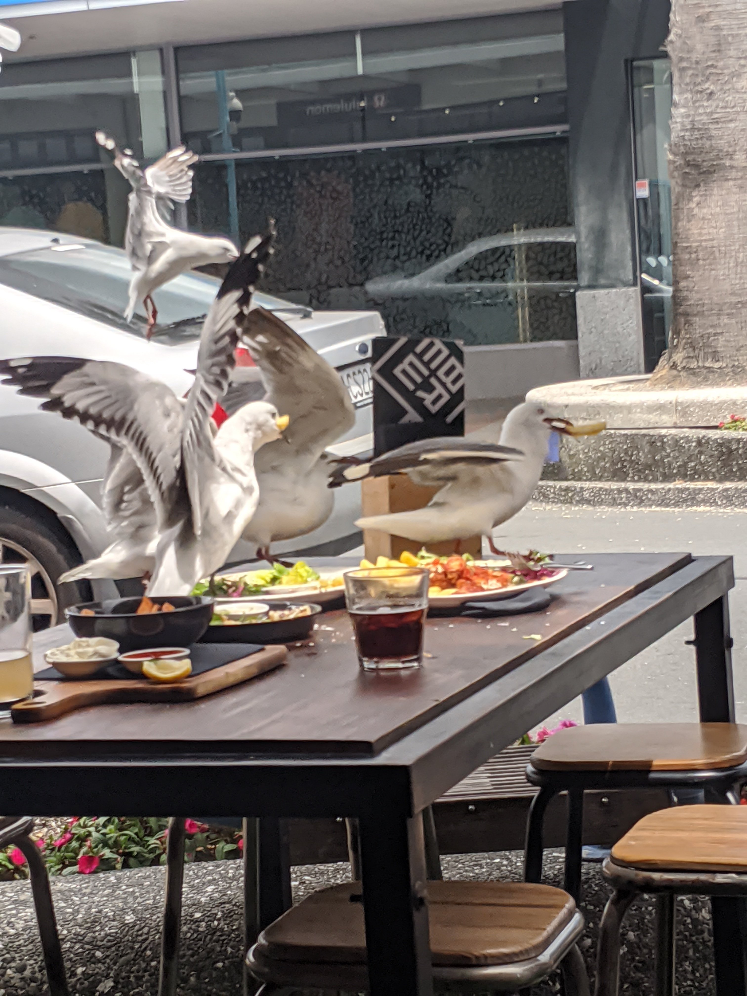 Afterwards it was time for lunch at Huhu nearby. Salad and sweet potato skins! Then touring the neighborhood town. We found a bird park which I’ll blog next. A good day.