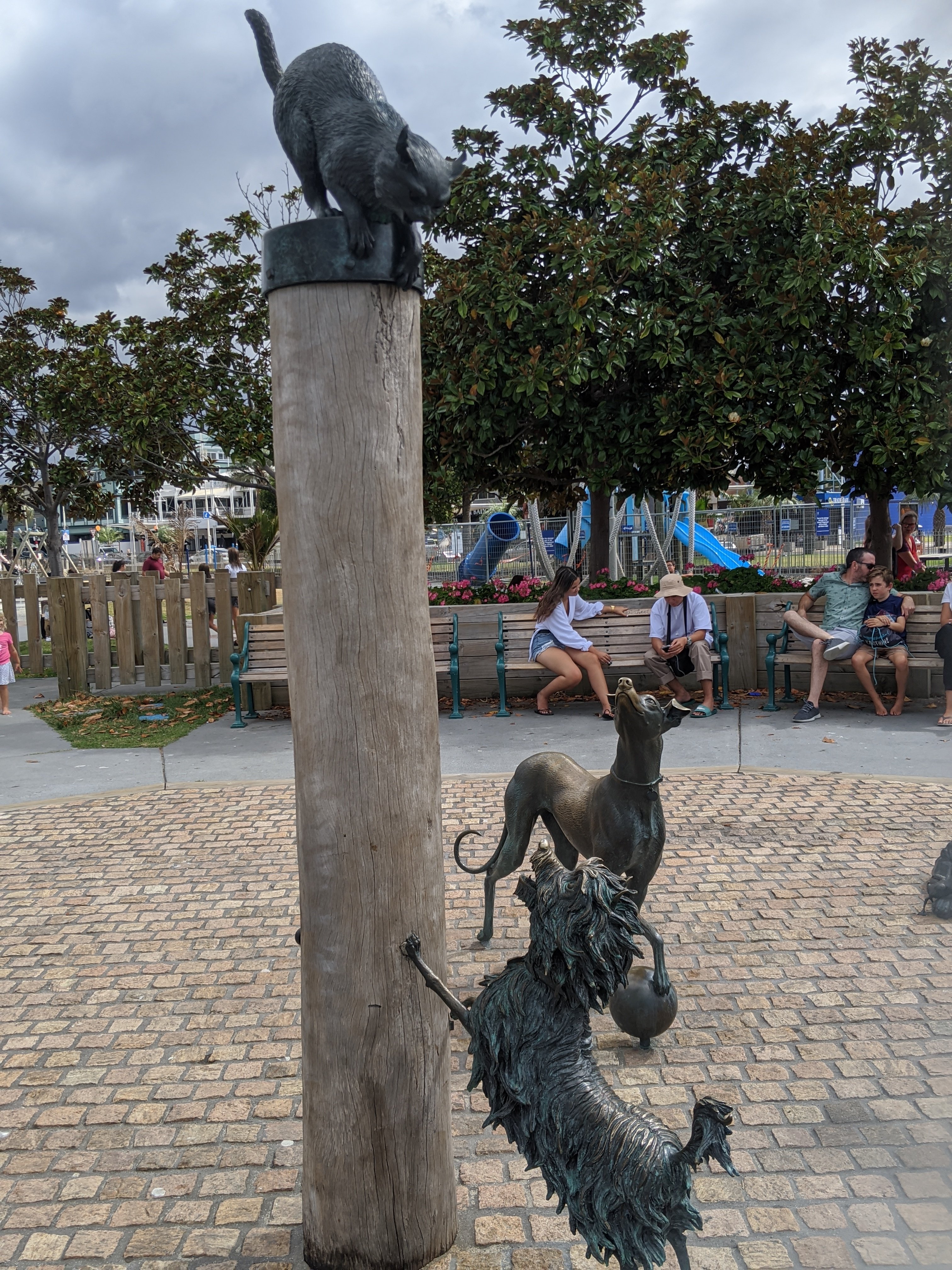 The Hairy Maclary and friends sculpture at the waterfront. This is from a children’s book. Hairy Maclary is the dog jumping on the post.
