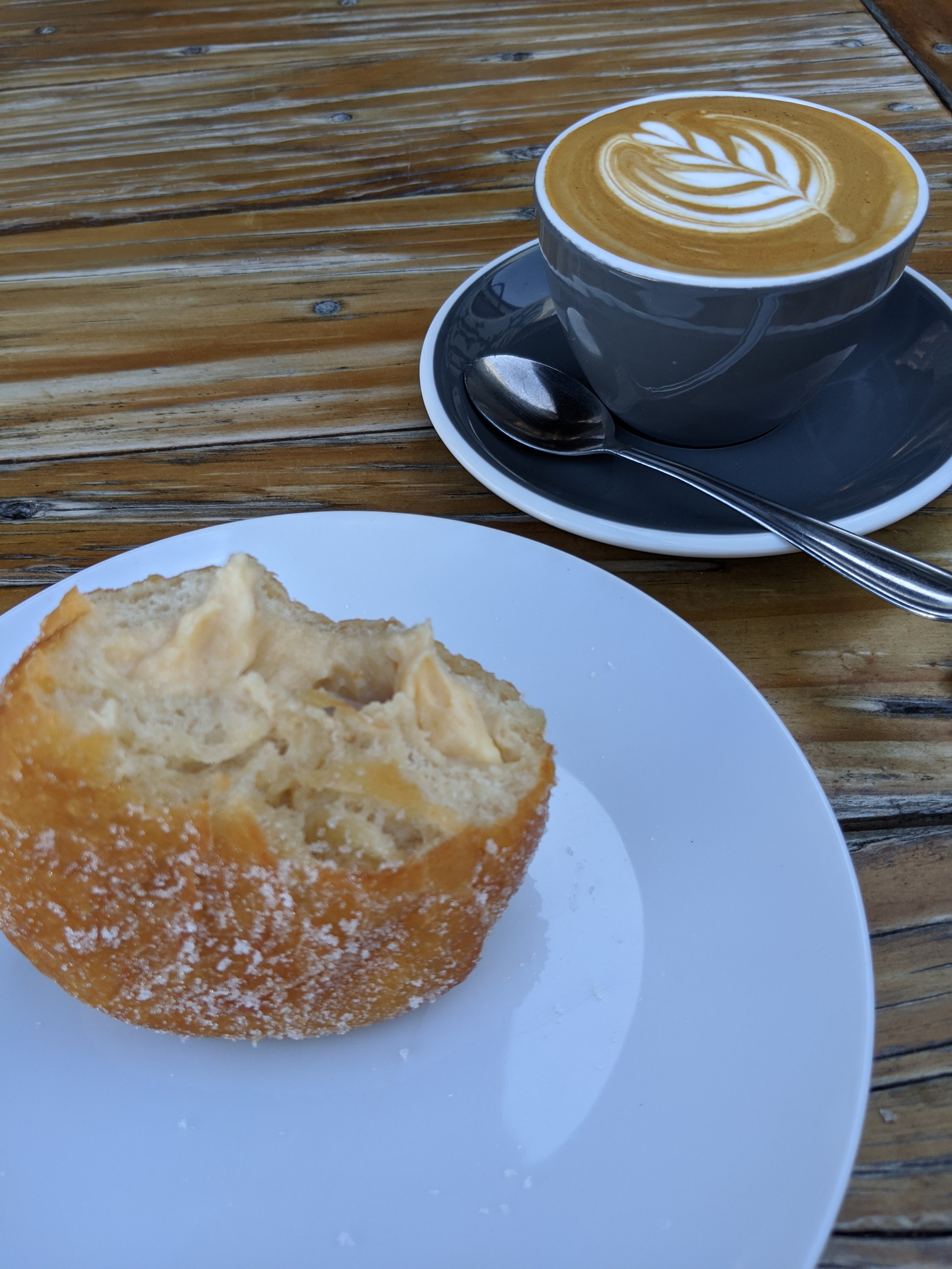 First was a coffee shop downtown that had great coffee and doughnuts on Fridays. Mine was a marscapone, rosemary, and apricot filled. It was yummy but it has been 3/4 year since my last donut. Now I remember why.